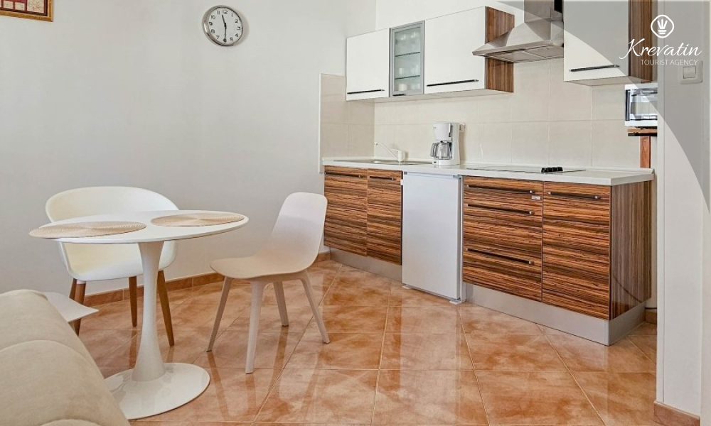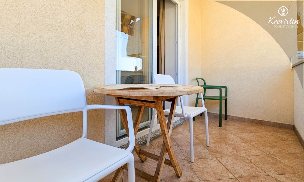 The apartment has a bedroom with a double bed, a fully equipped kitchen with basic amenities, a bathroom with shower and toilet, and a balcony with a table and chairs - the perfect place for morning coffee or evening relaxation.