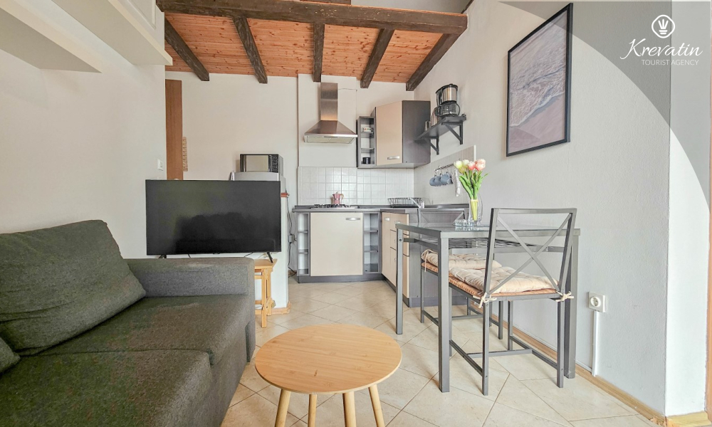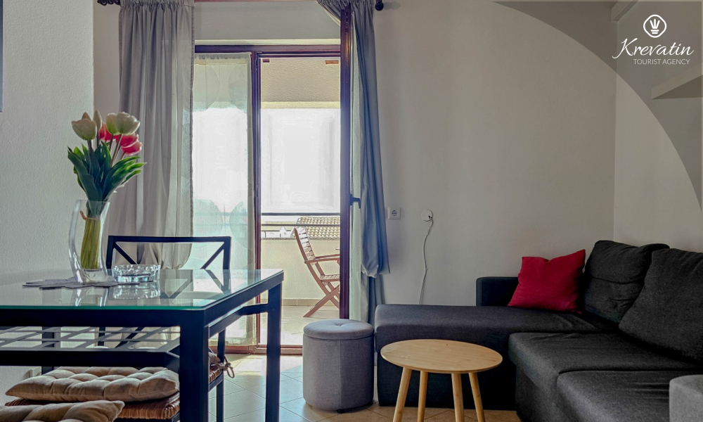 The apartment consists of a bedroom with a double bed, a bright living room with a sofa and a kitchen equipped with basic amenities. The sunny balcony overlooks the town and is perfect for a morning coffee or an evening glass of wine. The bathroom with a shower and toilet provides everything you need for a comfortable stay.