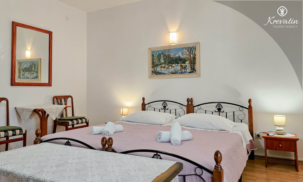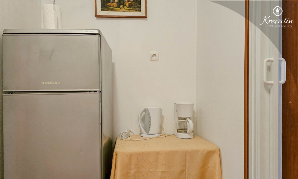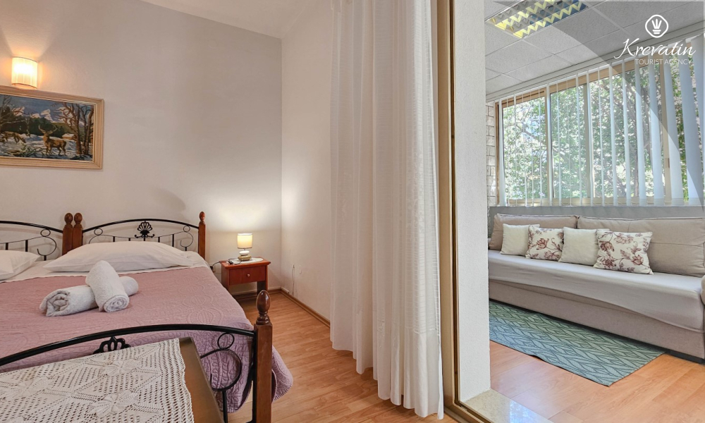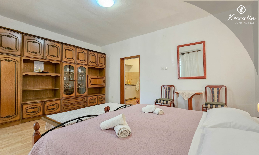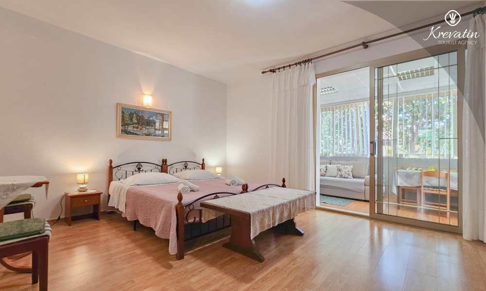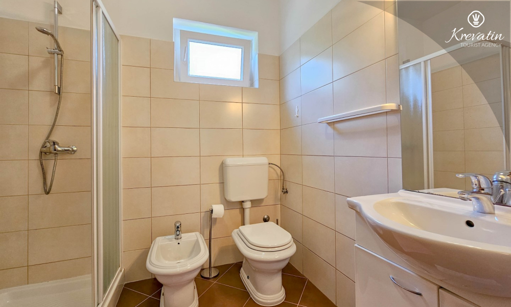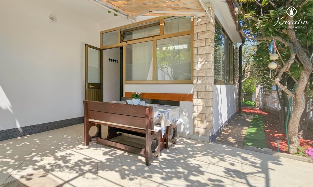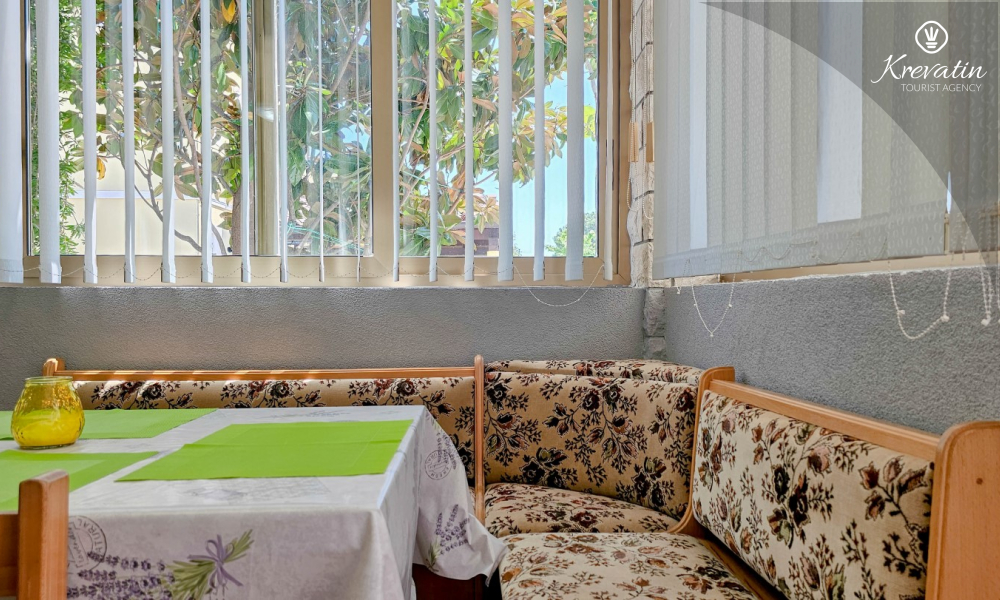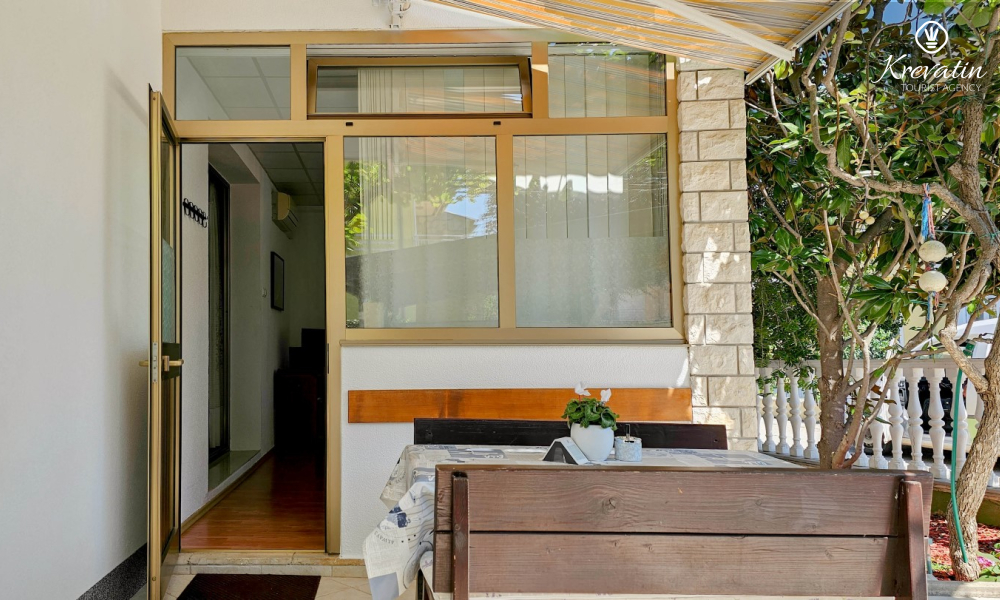 Located on the ground floor of a family house, the apartment consists of a bedroom with a comfortable double bed, a living room with a dining area and a sofa bed for one additional person, and a well-equipped kitchen. The apartment has a practical bathroom with a shower and toilet, and a lovely terrace with a table and chairs, ideal for relaxing and enjoying the outdoors.