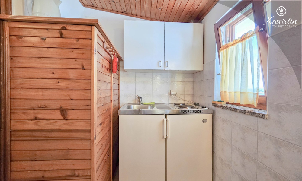 The studio apartment offers a comfortable bedroom with a double bed and an additional extra bed, perfect for resting after a day spent exploring the surroundings. The kitchen is equipped with all the basic things you need to prepare simple meals.