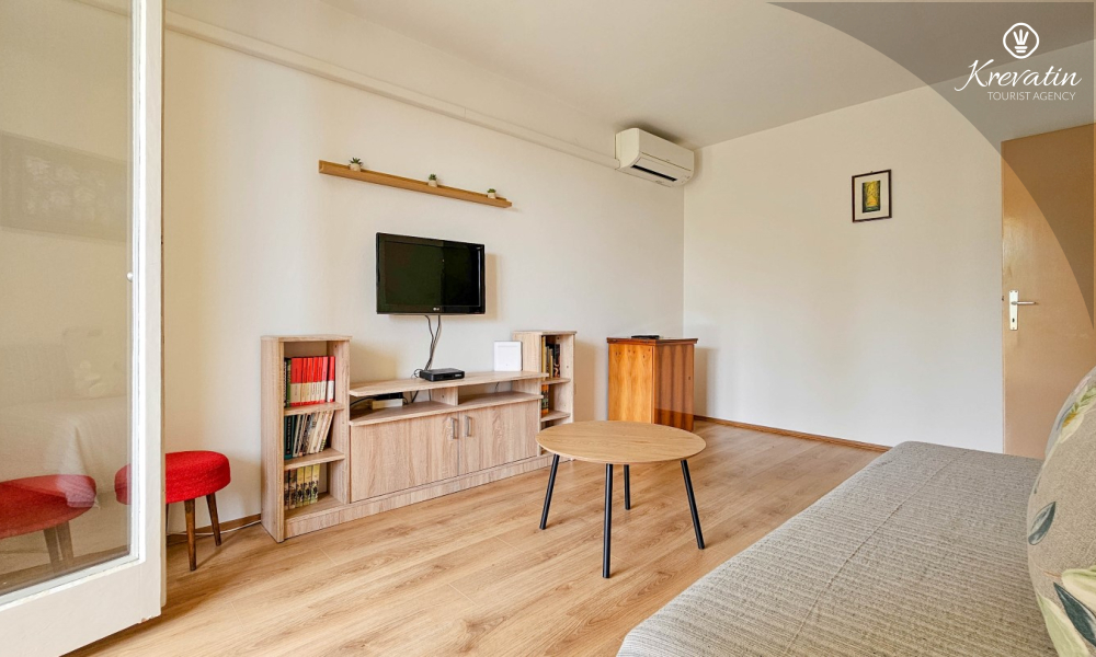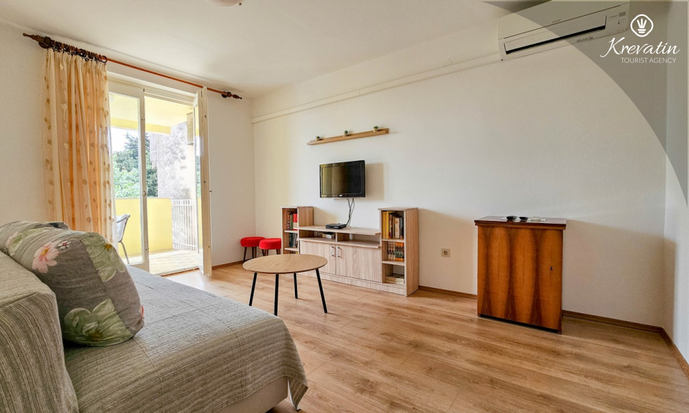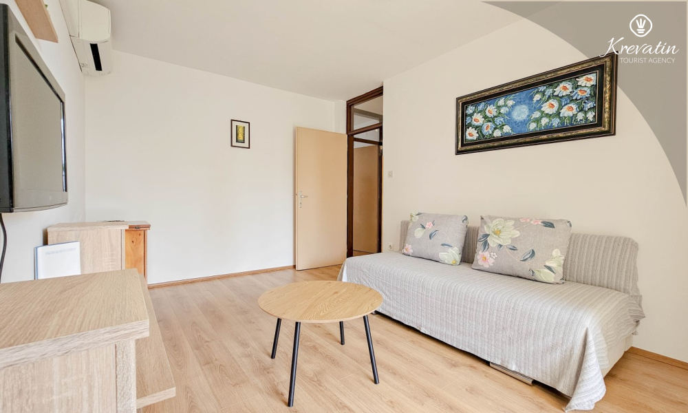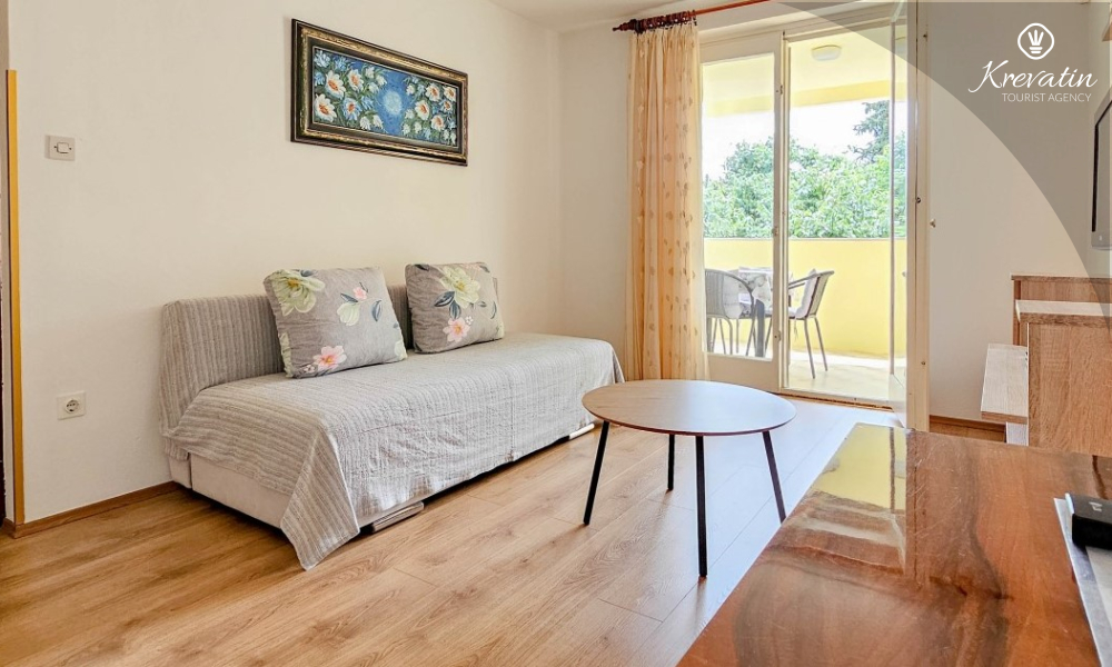 The apartment consists of a bedroom with a double bed, a living room with a sofa bed for an additional two people, and a kitchen with a dining area equipped with the basics for preparing meals. A bathroom with a shower and toilet provides additional comfort, and a balcony is perfect for morning relaxation or evening socializing.