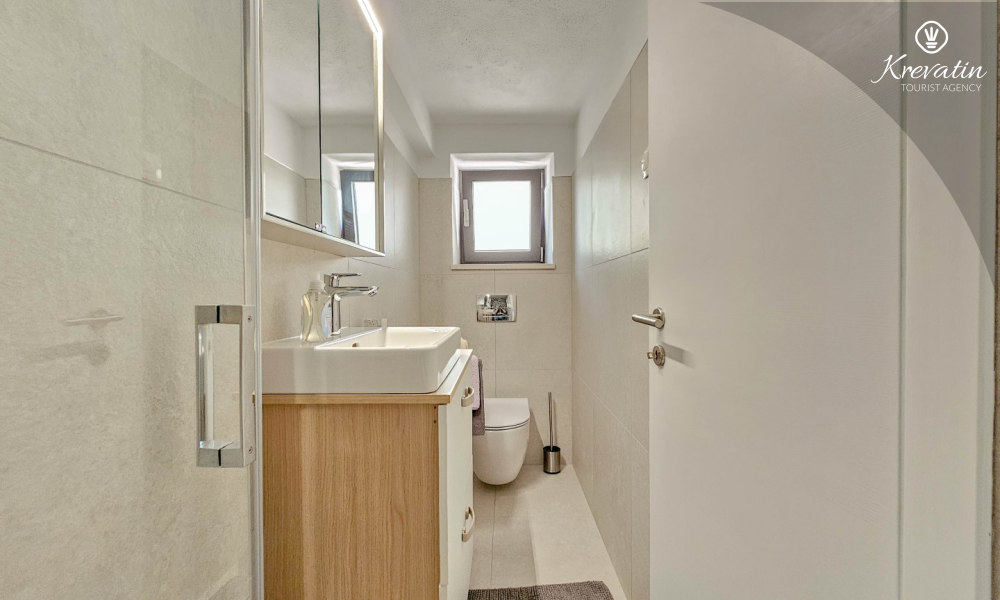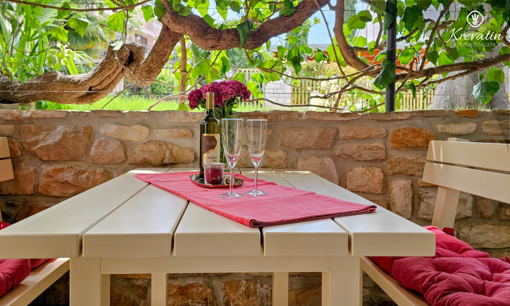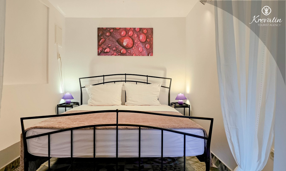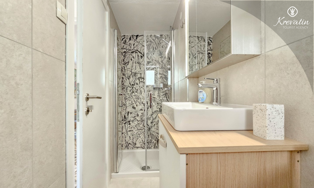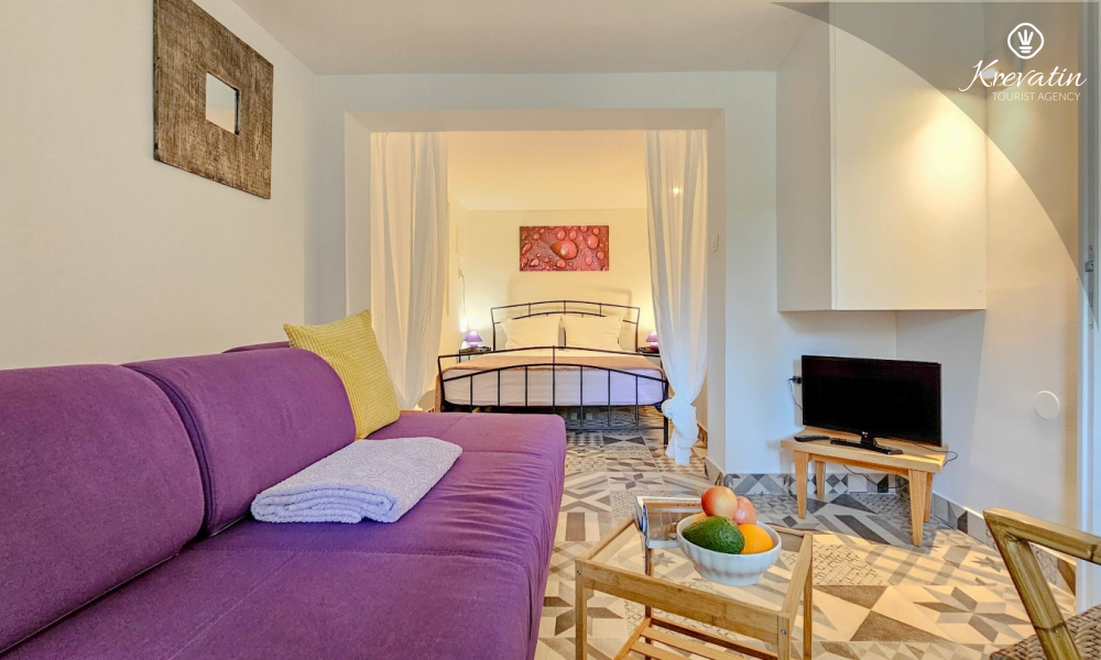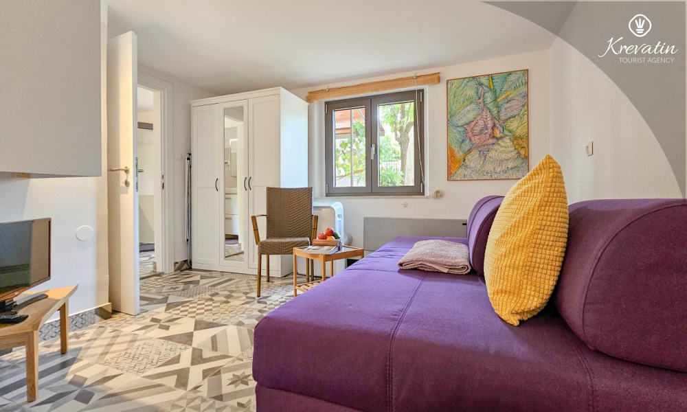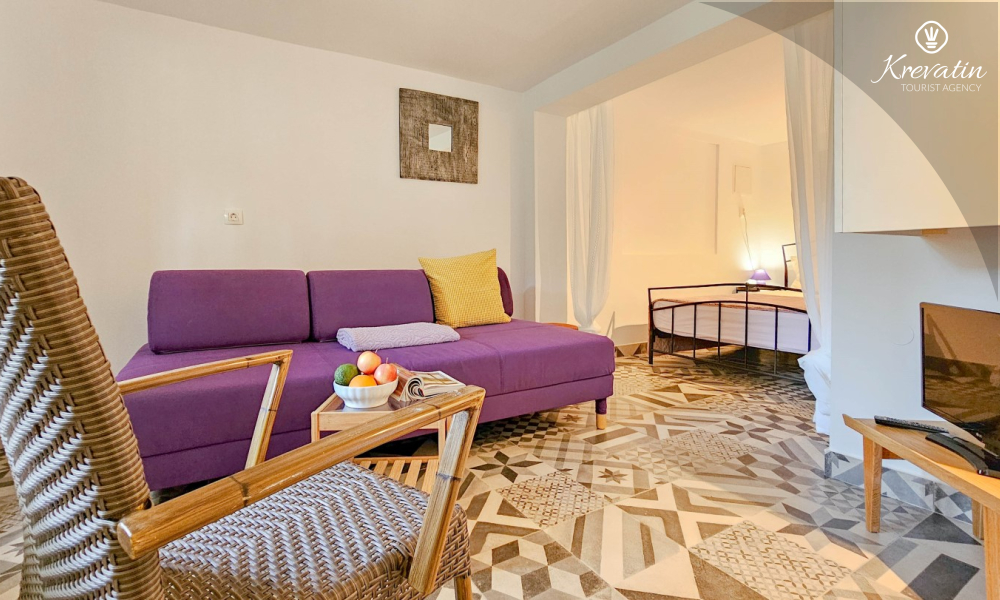 The studio offers a double bed and a living room with a sofa bed, a fully equipped kitchen for preparing simple meals, a modern bathroom with shower and a private terrace with a table and chairs - perfect for morning coffee or evening relaxation.