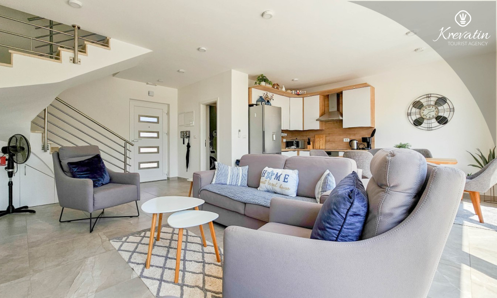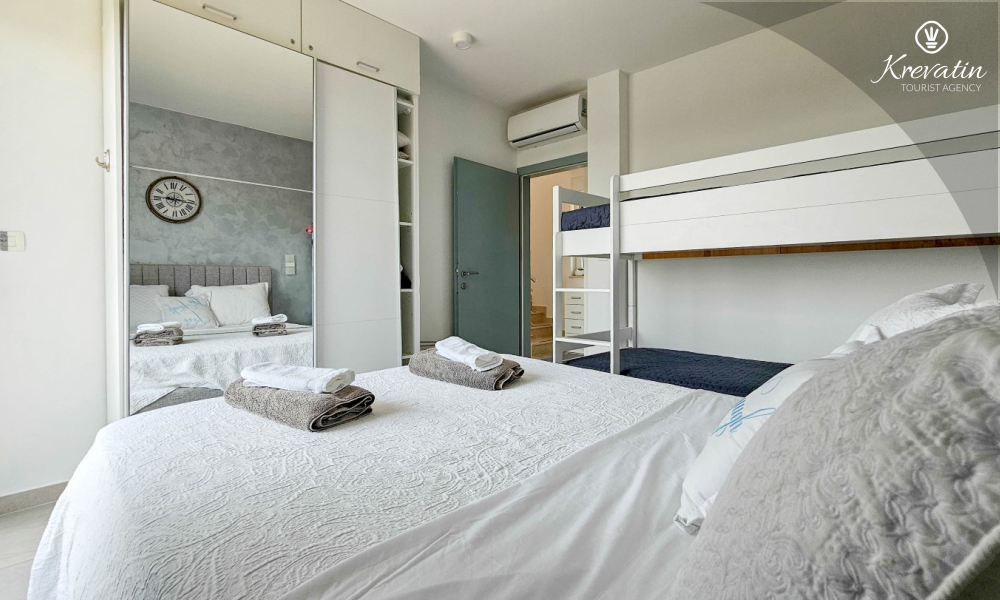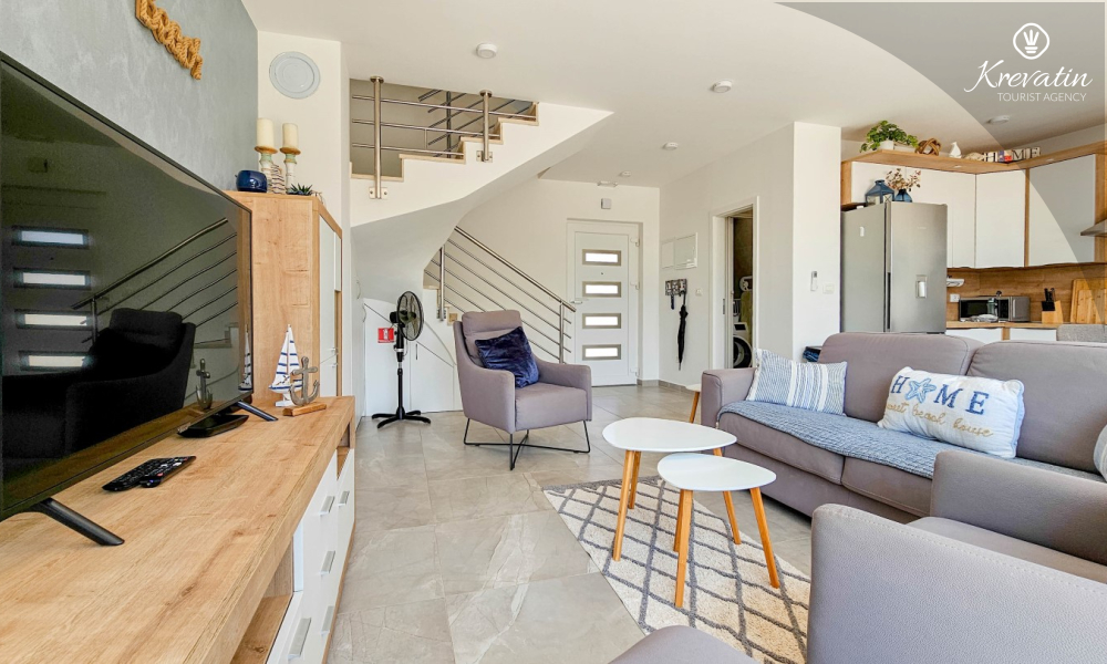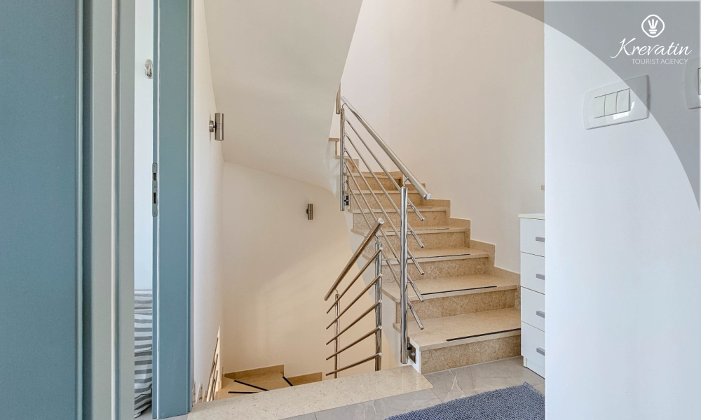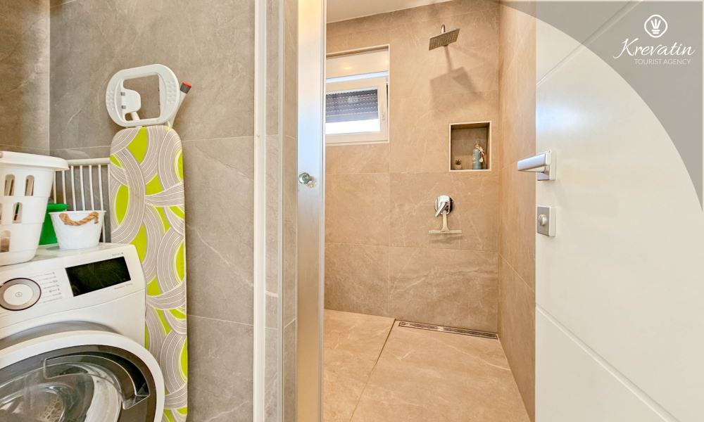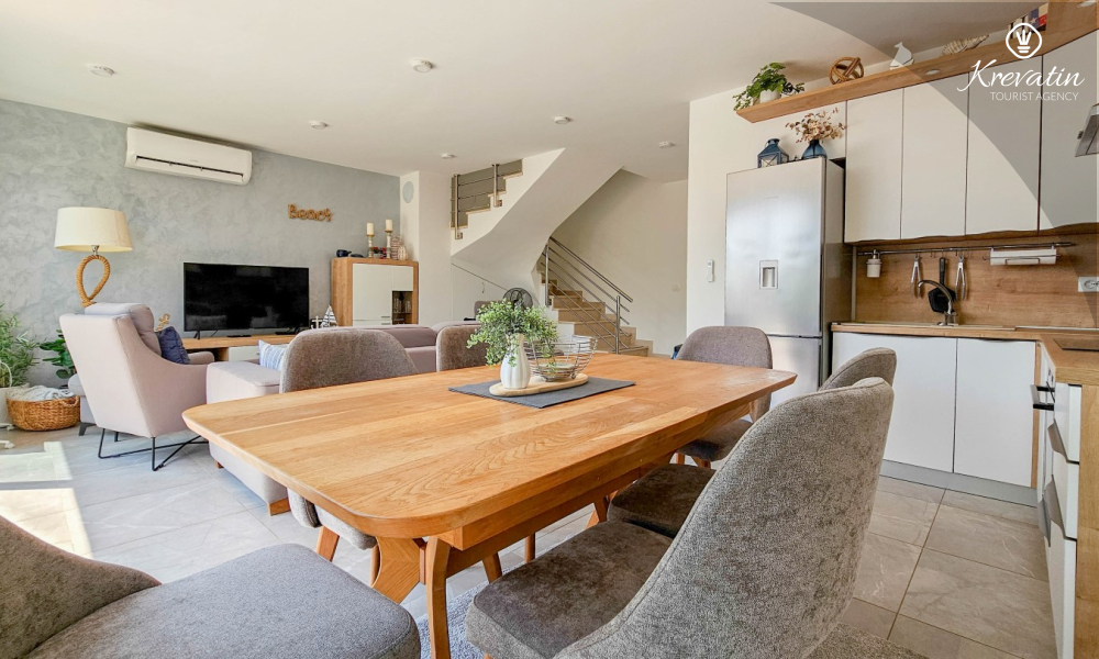 On the ground floor there is a modernly equipped kitchen with a dining area, a spacious living room with a sofa bed for 2 additional people, one bathroom and a laundry room. On the first floor there are two comfortable bedrooms with a double bed and an additional bathroom.