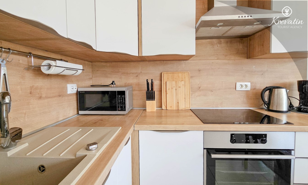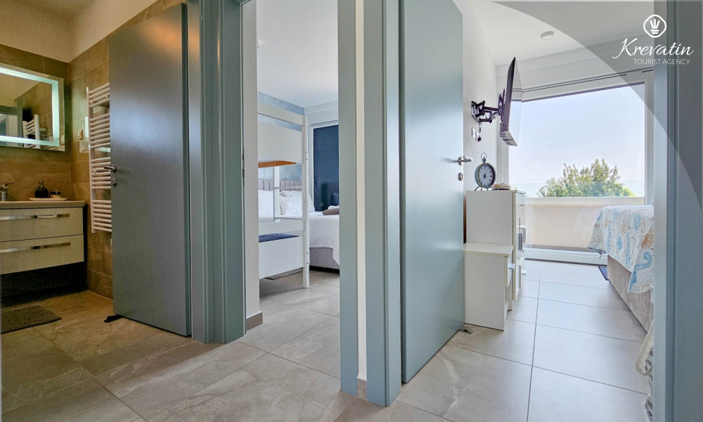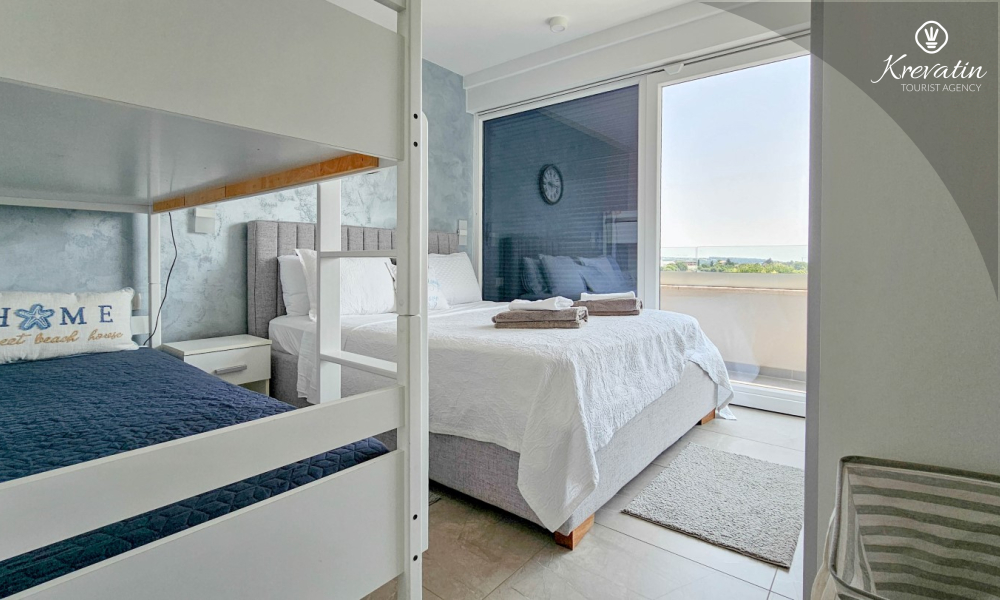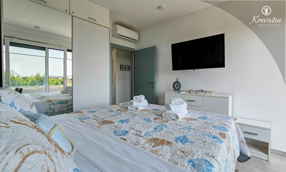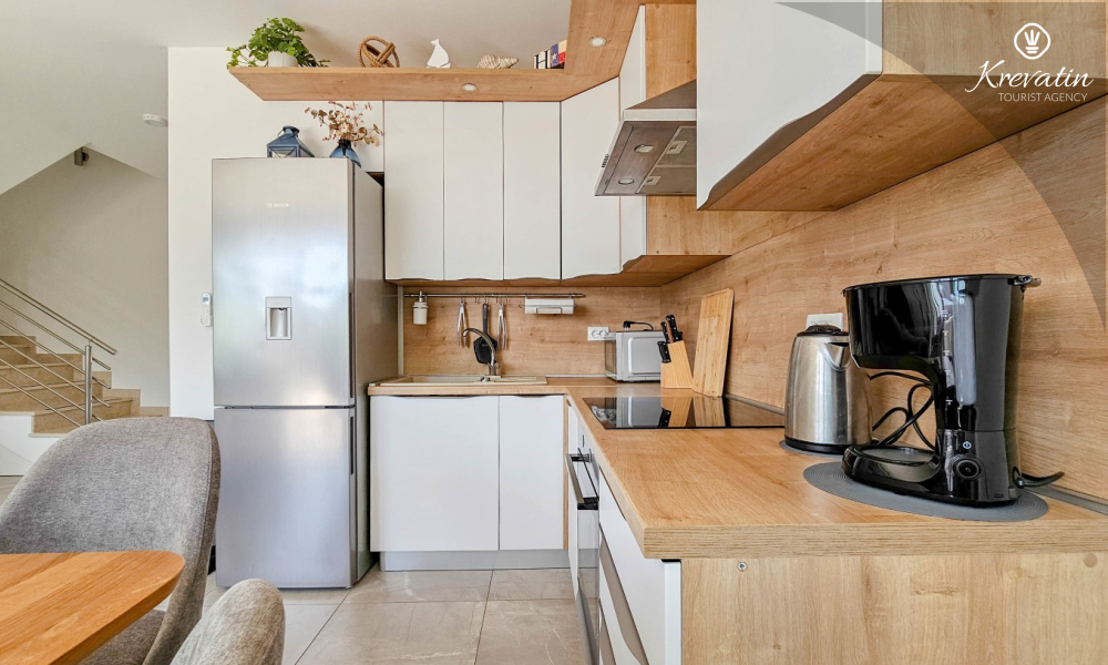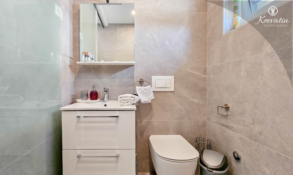On the ground floor there is a modernly equipped kitchen with a dining area, a spacious living room with a sofa bed for 2 additional people, one bathroom and a laundry room. On the first floor there are two comfortable bedrooms with a double bed and an additional bathroom.