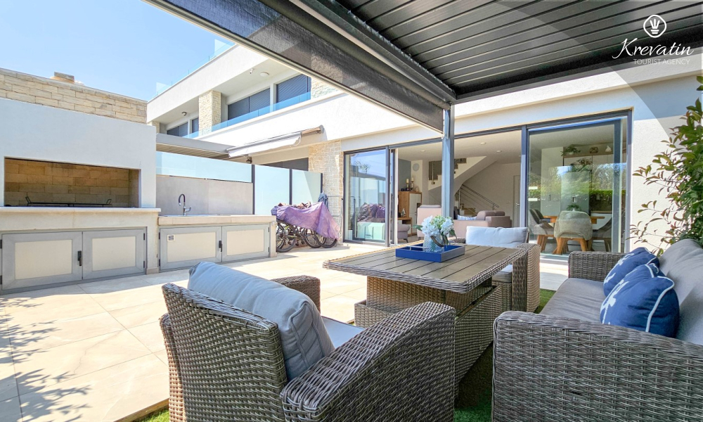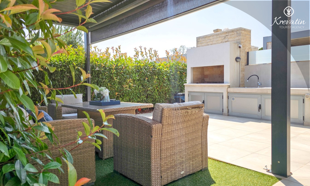 The house is spread over two floors and has two spacious terraces. The roof terrace has a seating area and a panoramic view of the marina and the old town, while the ground floor terrace is equipped with garden furniture and a barbecue - ideal for outdoor socializing.