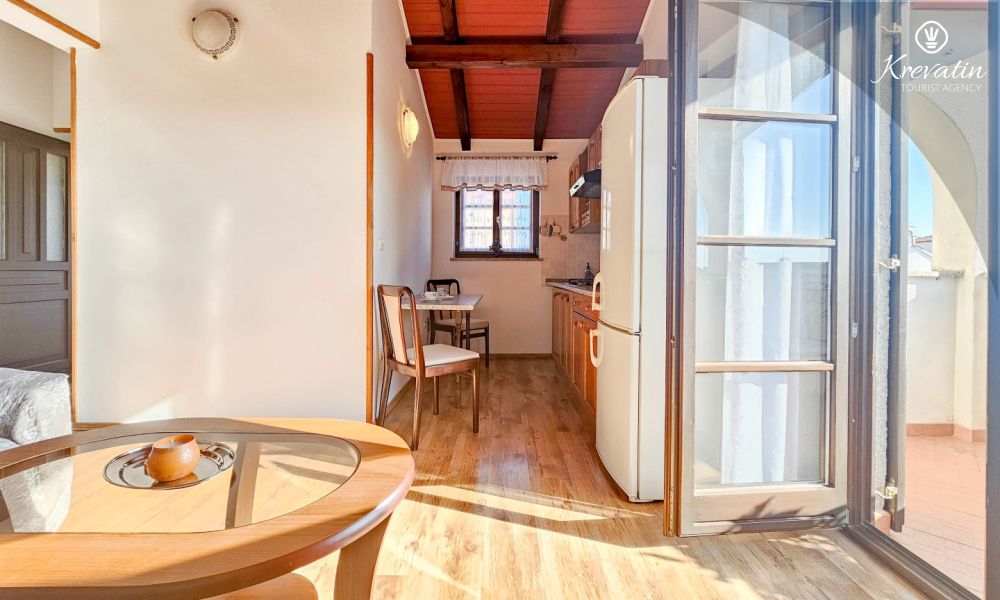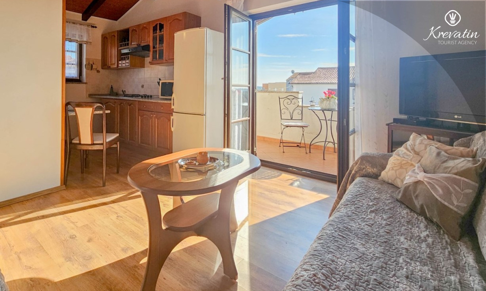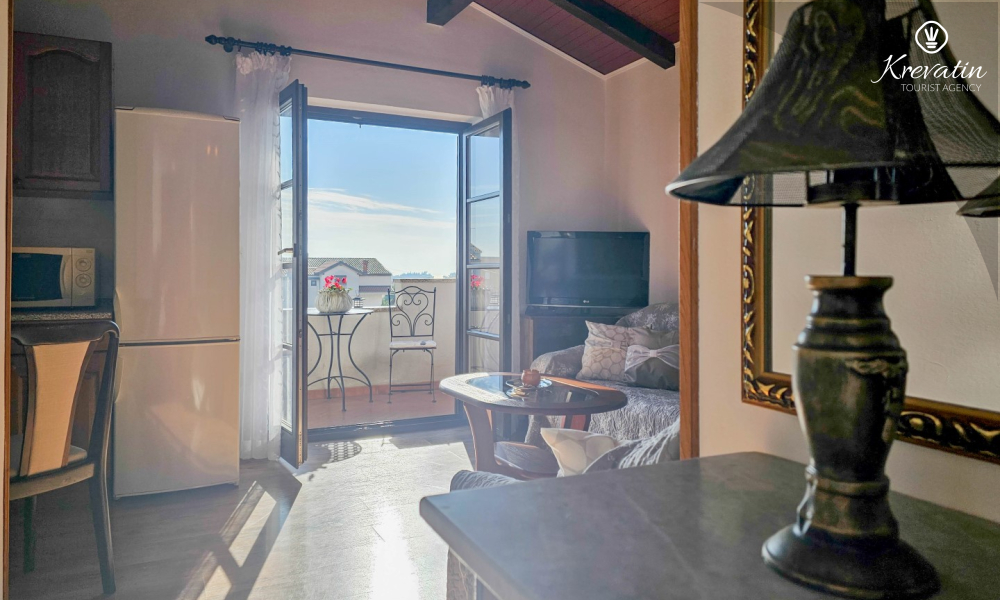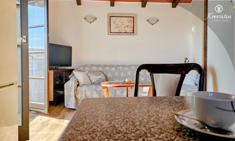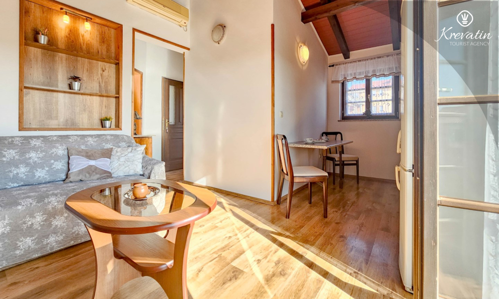 Our apartment can host up to two people and offers everything you need for a pleasant stay. The equipped kitchen allows you to prepare your own meals, while the living room with a comfortable seating area and television provides the perfect place to relax. The living room opens onto a sunny balcony, where you can enjoy your morning coffee or the evening sunset.