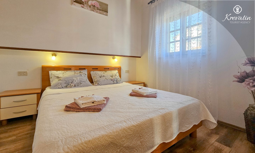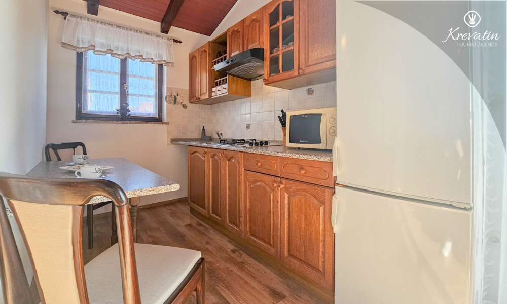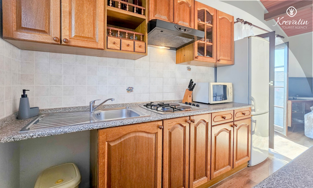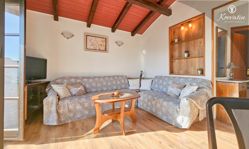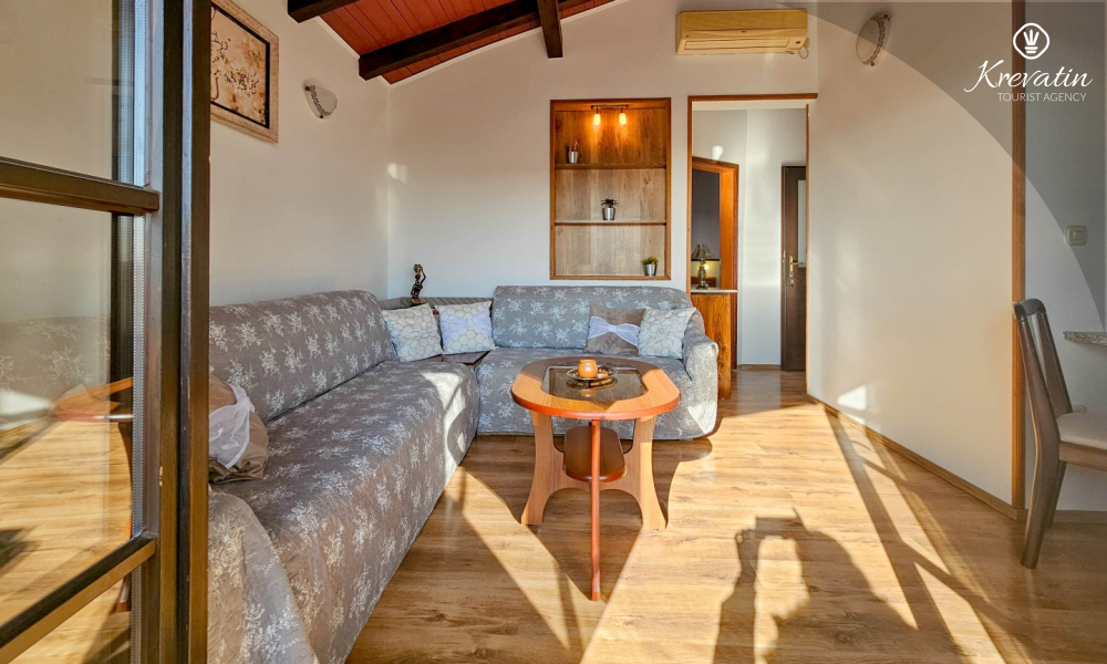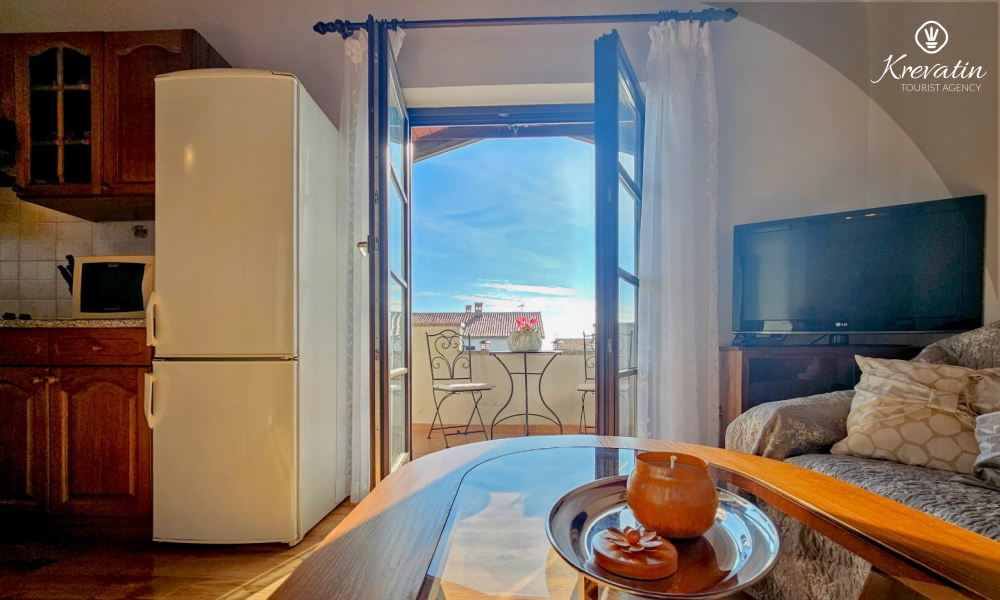 Our apartment can host up to two people and offers everything you need for a pleasant stay. The equipped kitchen allows you to prepare your own meals, while the living room with a comfortable seating area and television provides the perfect place to relax. The living room opens onto a sunny balcony, where you can enjoy your morning coffee or the evening sunset.