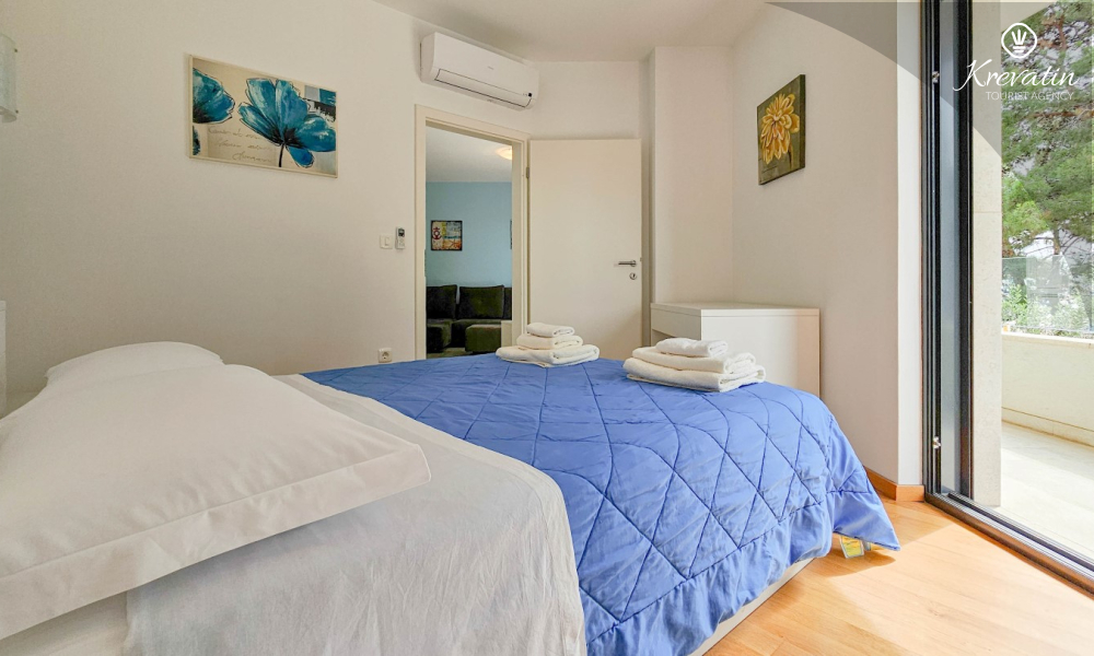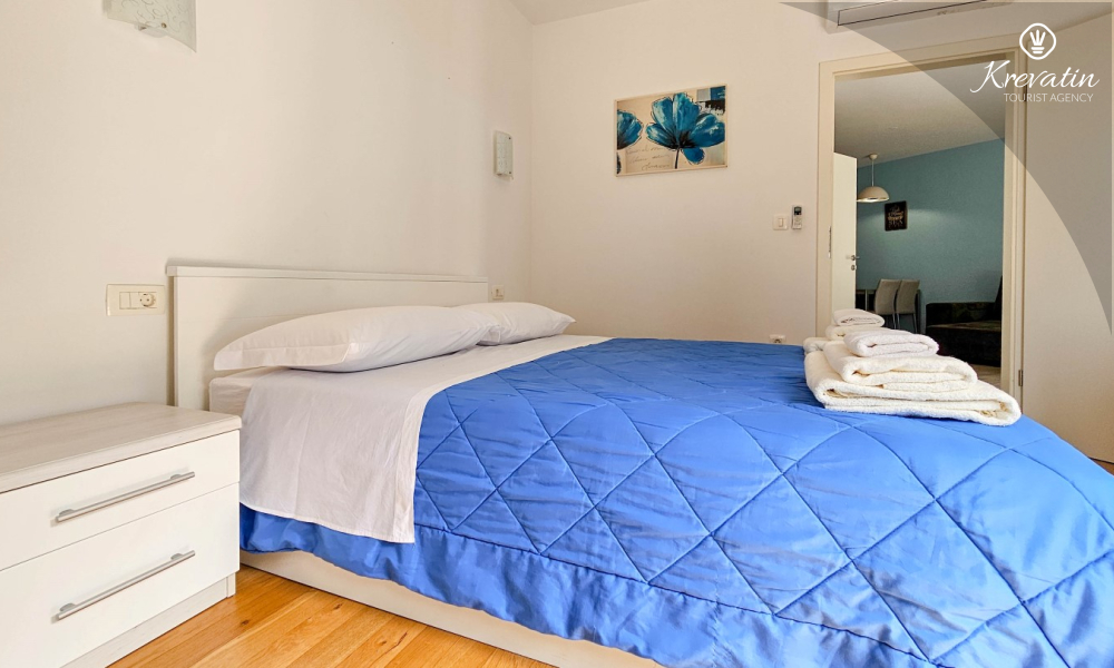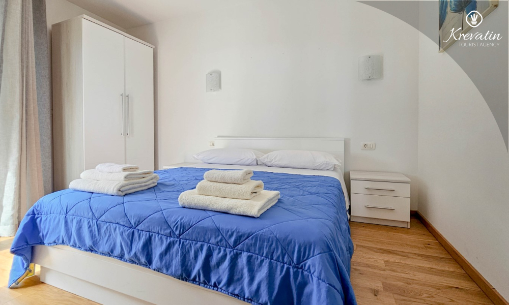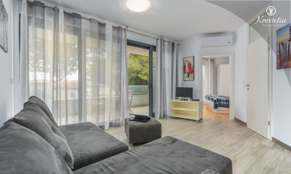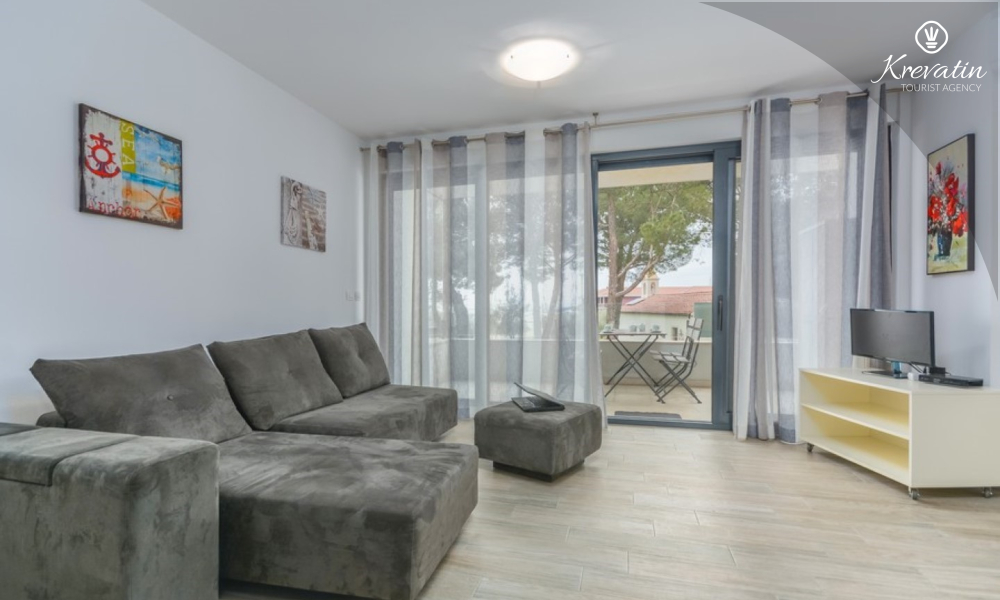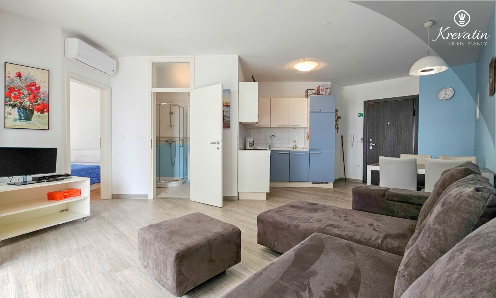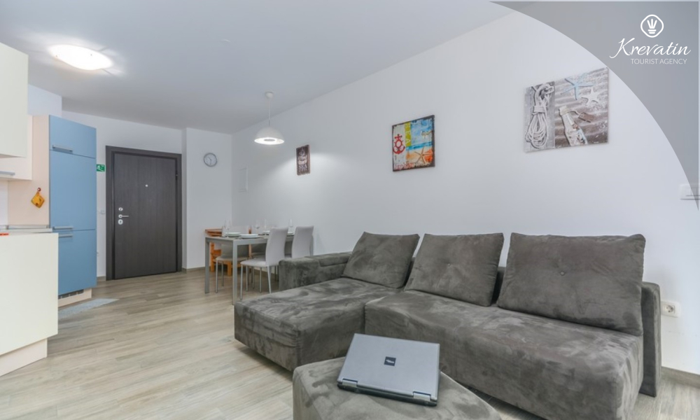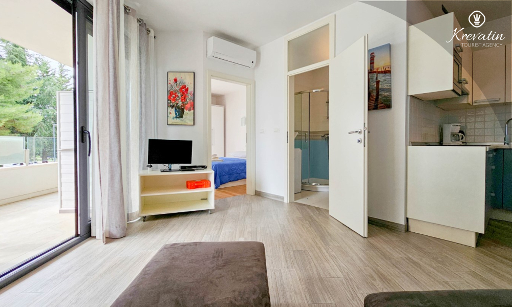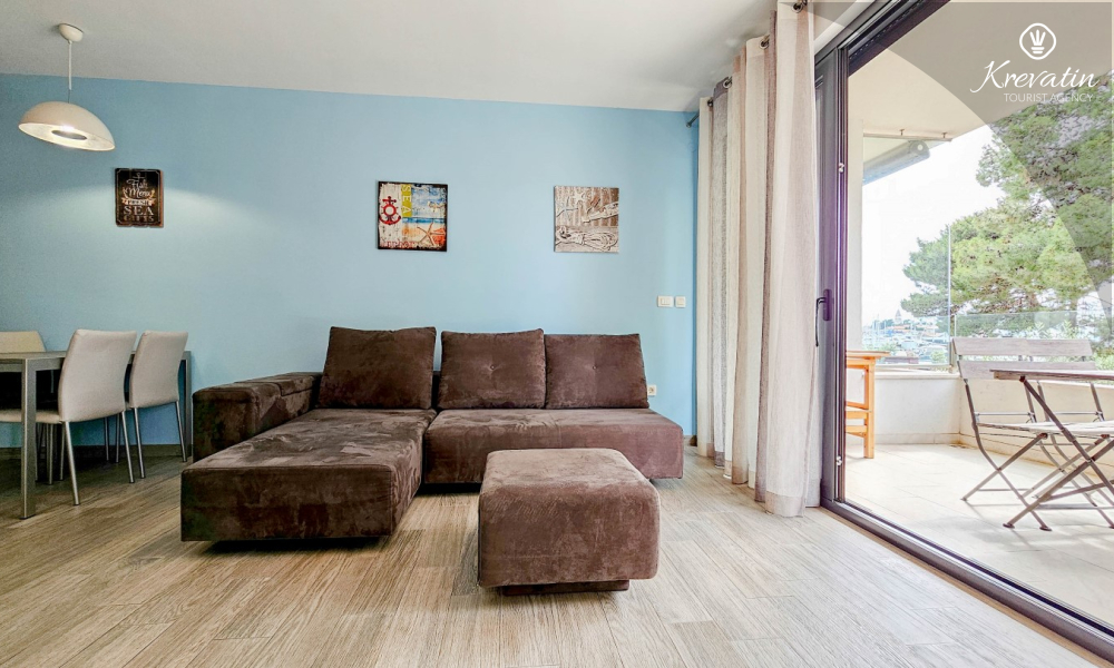 It consists of a bedroom with a double bed, a living room with a dining area and a kitchen equipped with basic items for preparing meals. There is a bed for two additional people in the living room, and there is also a bathroom with a shower and a toilet. The balcony with a beautiful view will provide pleasant moments outdoors.