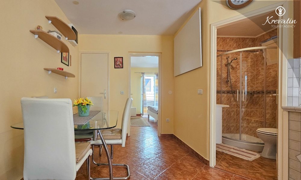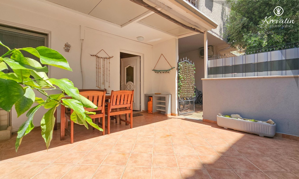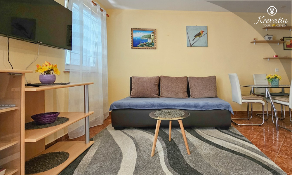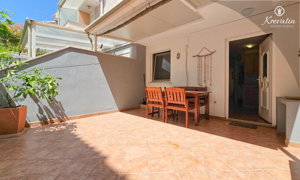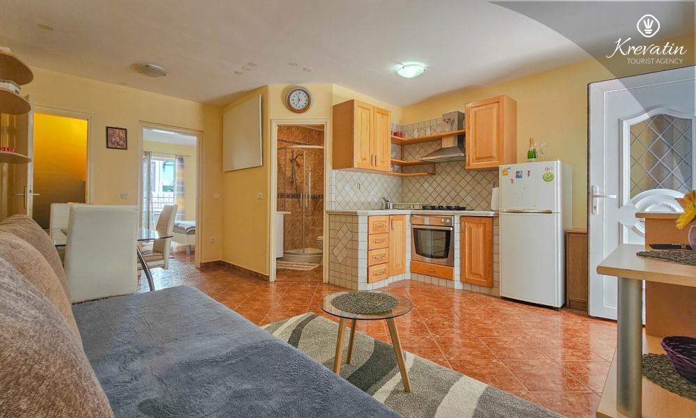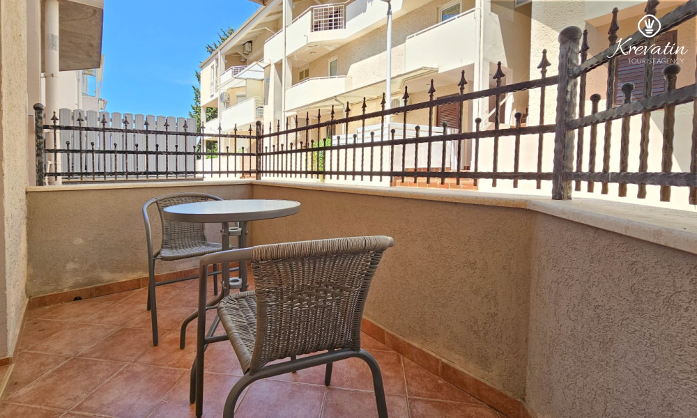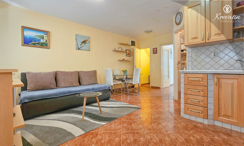 The apartment consists of a bedroom, a comfortable living room with a kitchen and dining room, and a nice terrace. Two additional guests can sleep comfortably in the living room. The kitchen is equipped with essentials for preparing simple meals, and the practical bathroom includes a shower, toilet and washing machine for your convenience. Relax on the terrace equipped with a table and chairs, perfect for morning coffee or evening gatherings. The apartment is equipped with TV, air conditioning, internet, and bed linen and towels are available at no additional cost for a carefree stay.