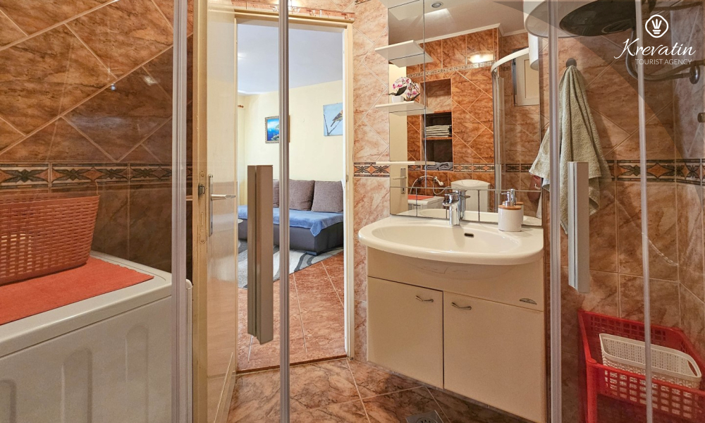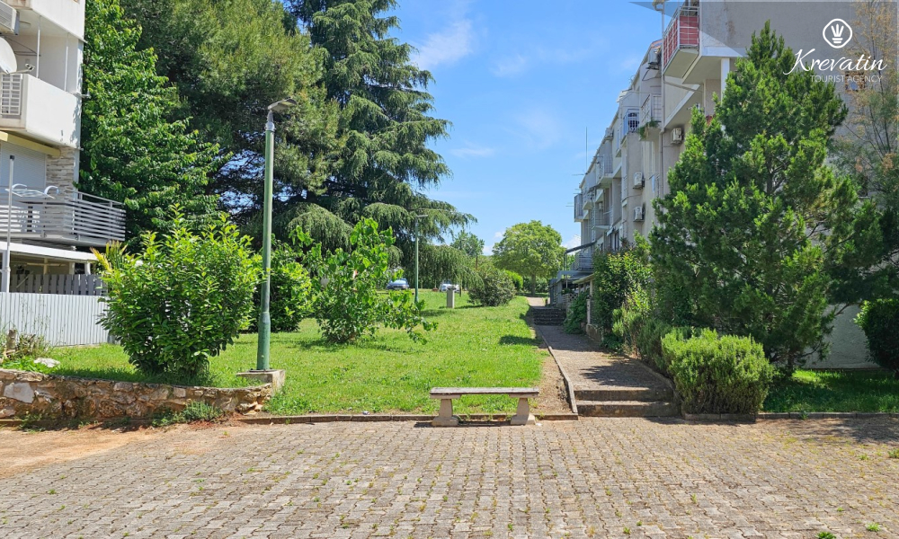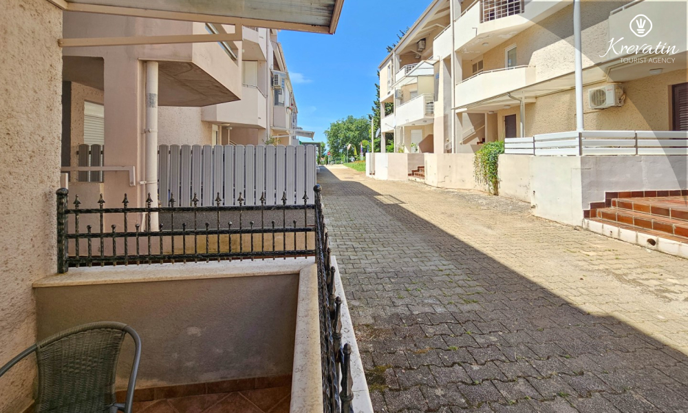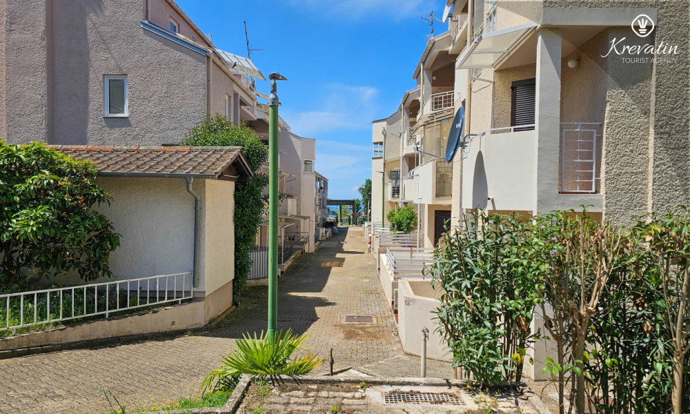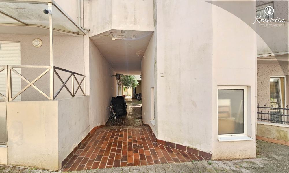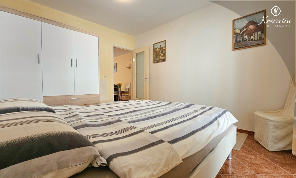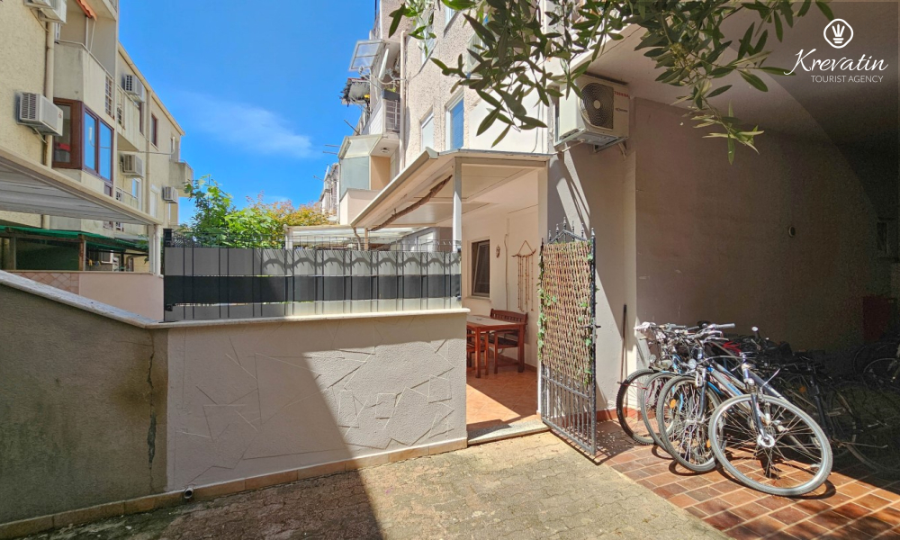 The apartment consists of a bedroom, a comfortable living room with a kitchen and dining room, and a nice terrace. Two additional guests can sleep comfortably in the living room. The kitchen is equipped with essentials for preparing simple meals, and the practical bathroom includes a shower, toilet and washing machine for your convenience. Relax on the terrace equipped with a table and chairs, perfect for morning coffee or evening gatherings. The apartment is equipped with TV, air conditioning, internet, and bed linen and towels are available at no additional cost for a carefree stay.