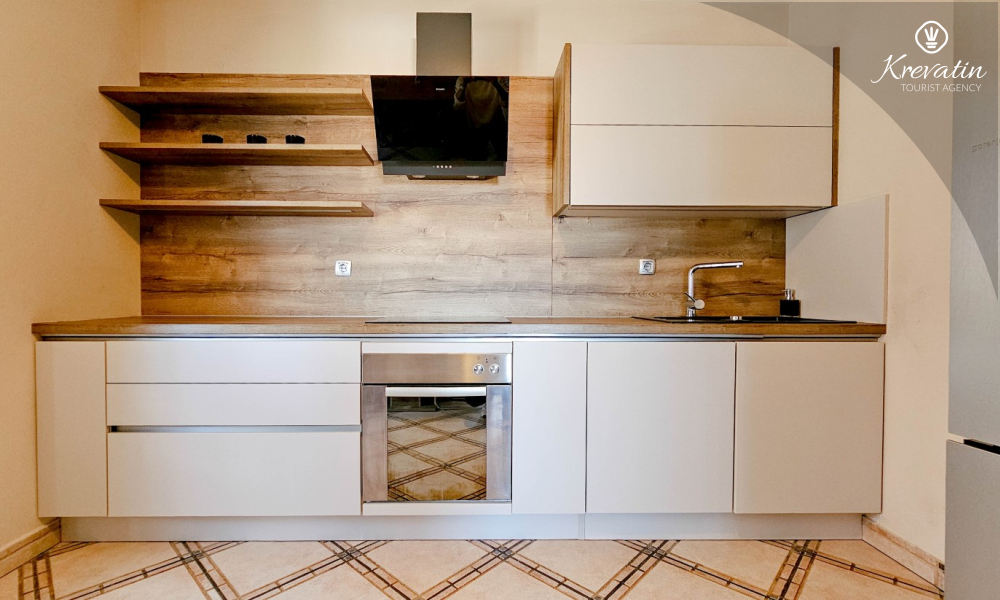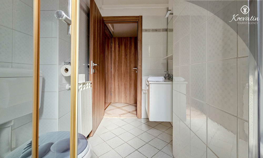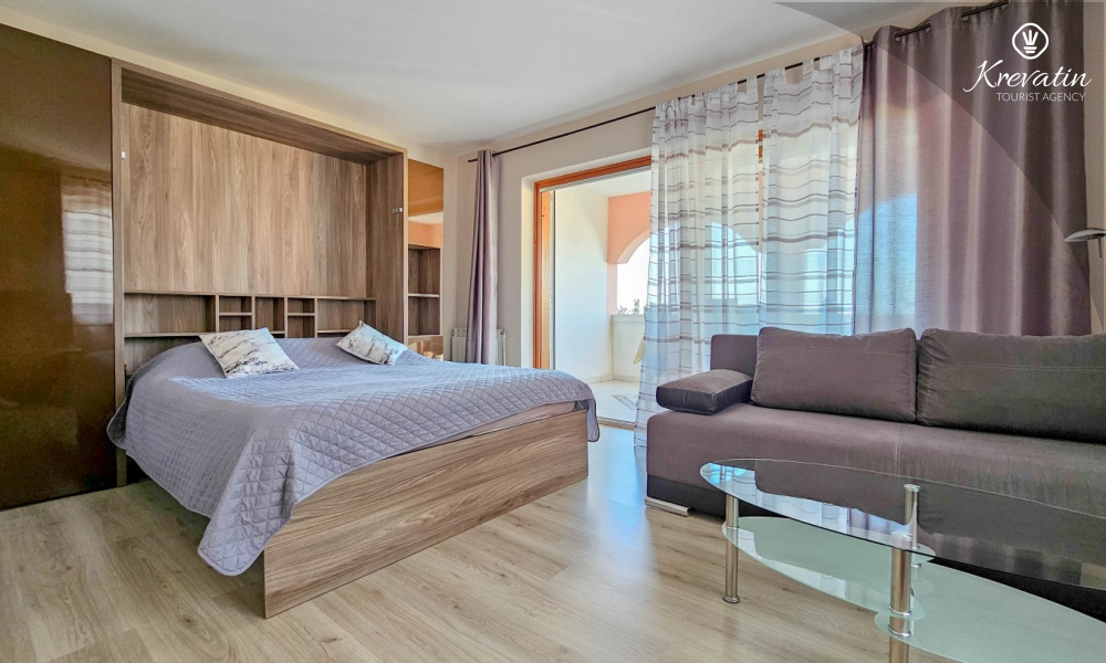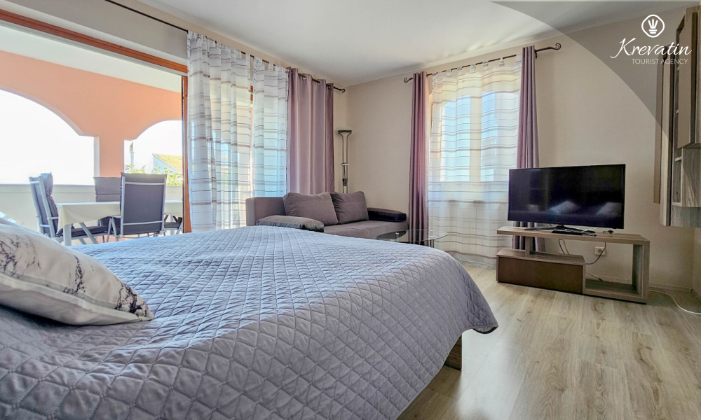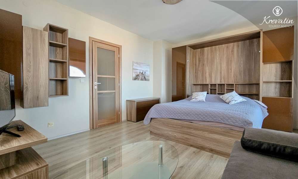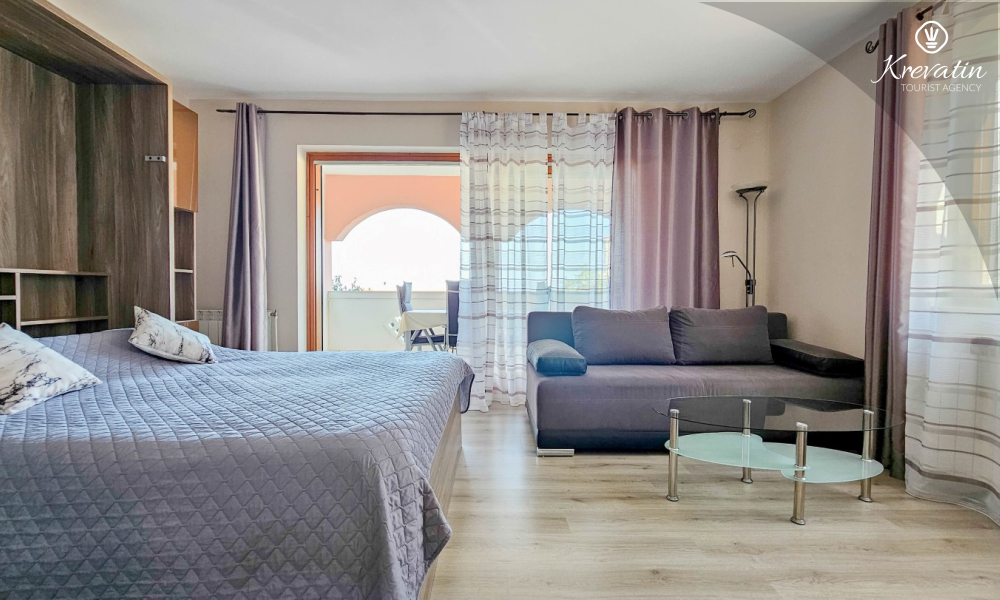 A spacious bedroom with a double bed, a wardrobe and a relaxation area leads you to a beautiful balcony with comfortable furniture and a mesmerizing sea view. The kitchen with a dining area is equipped with the essentials for preparing meals, and the bathroom with a shower provides additional comfort. The apartment is equipped with air conditioning, free internet and satellite TV, and bed linen and towels are included in the price.