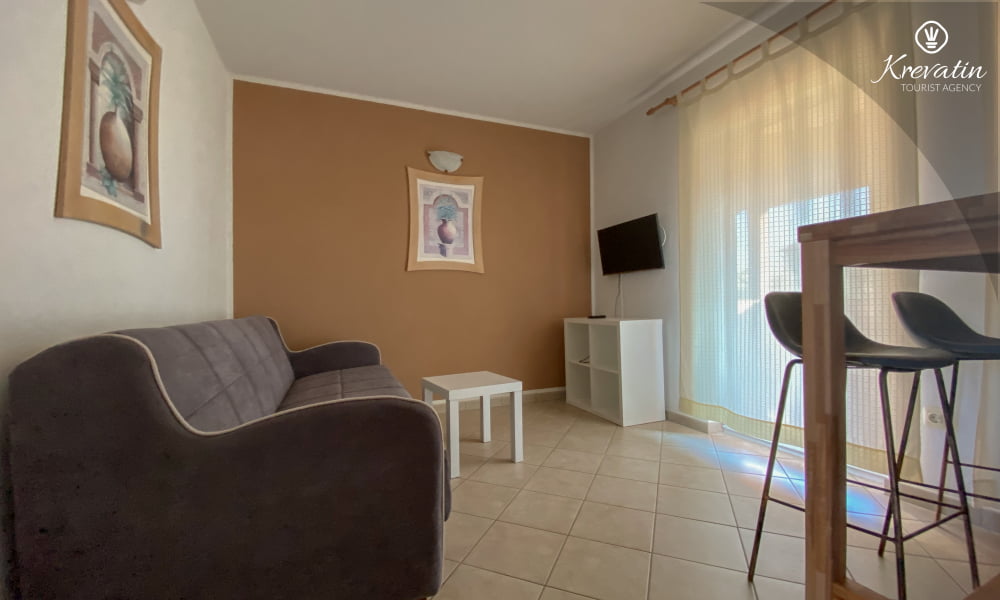 The apartment consists of one bedroom, a living room with kitchen and dining area, and a practical bathroom with shower and toilet. There is an extra bed for one more person in the living room, and there is also a terrace with furniture ideal for enjoying the outdoors.