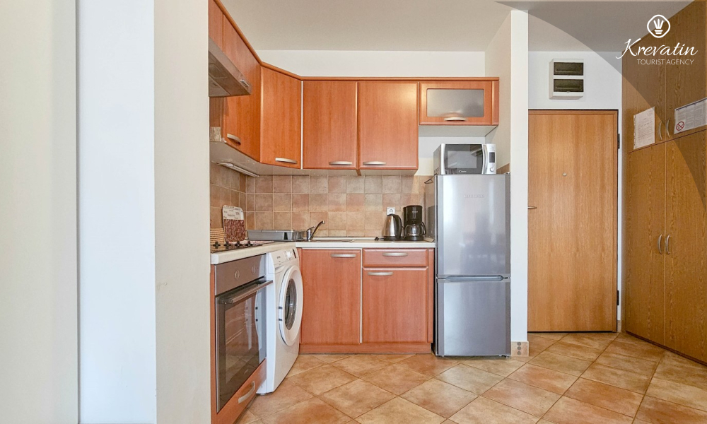 It consists of a bedroom, a living room with a sofa bed, a kitchen equipped with basic amenities, and a practical bathroom with a shower and toilet. There is also a balcony with a sea view, ideal for morning coffee or enjoying summer evenings