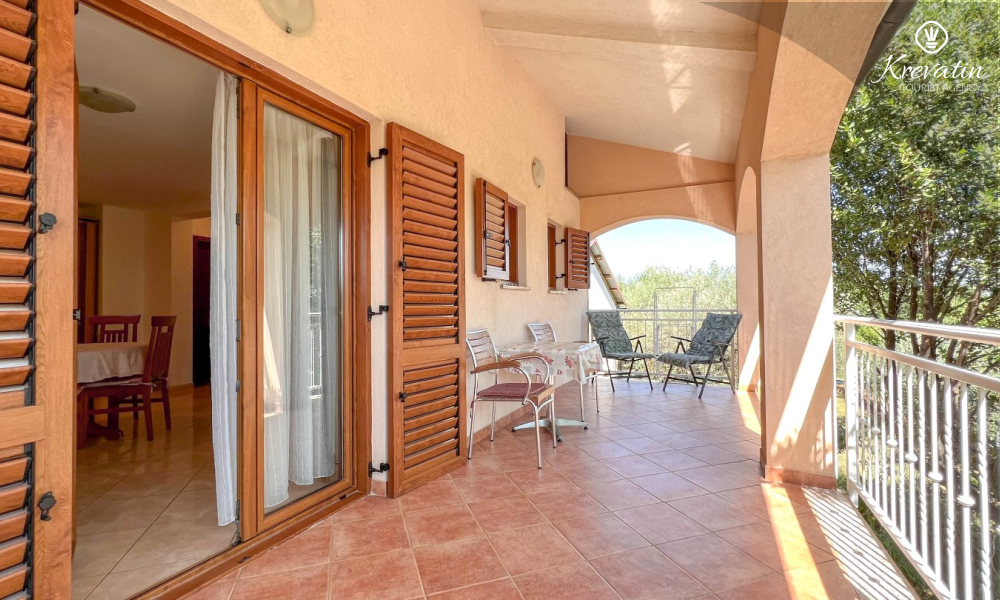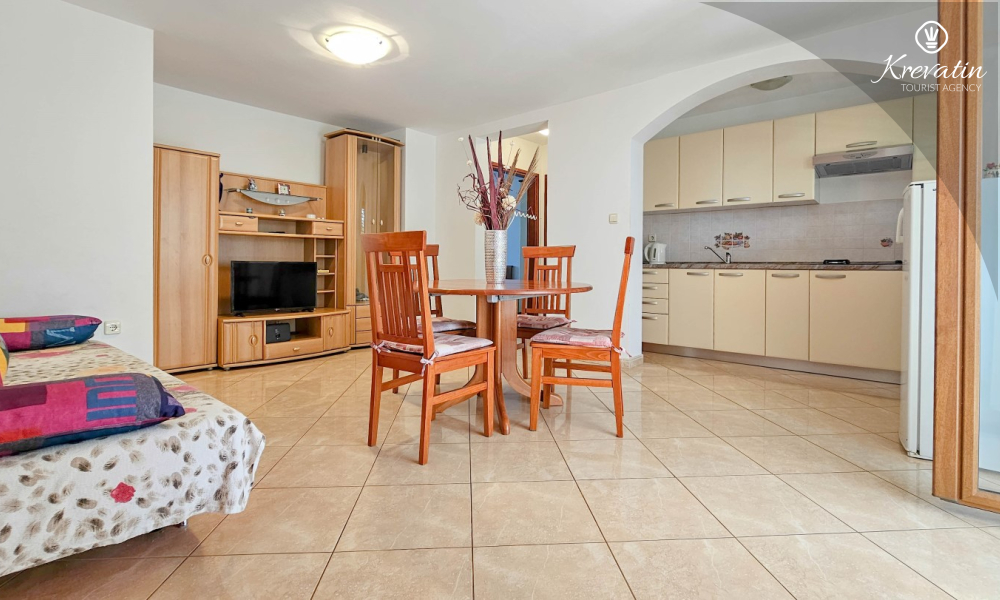 The apartment consists of a bedroom, a living room with a sofa bed, a fully equipped kitchen with a dining area and a bathroom with a shower and toilet. There is also a balcony with a table and chairs where you can enjoy your morning coffee or evening socializing.