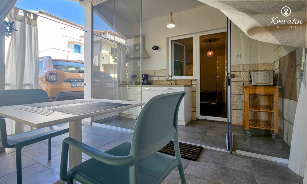 It consists of a bedroom with a double bed, a functional kitchen equipped with basic amenities, a bathroom with shower and toilet, and a cozy terrace with a table and chairs - ideal for relaxing after a day spent at the beach or walking around the city.