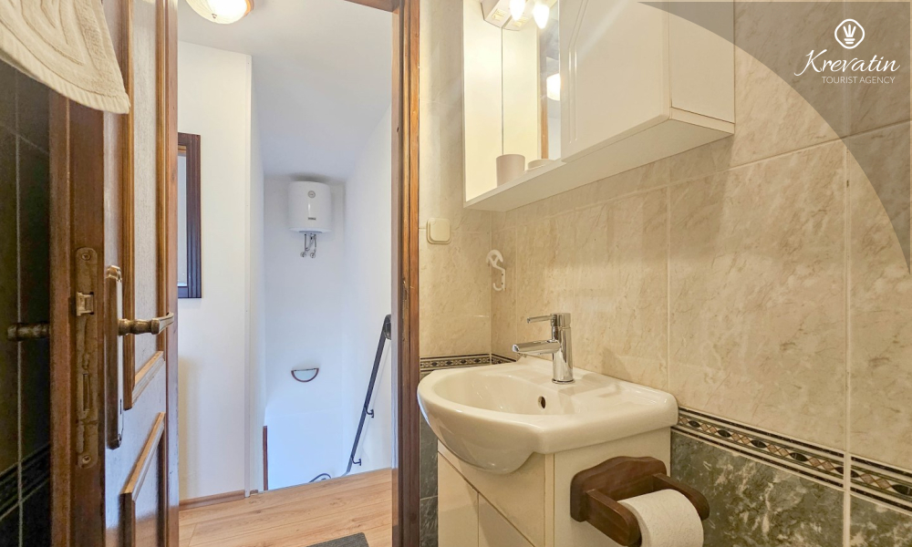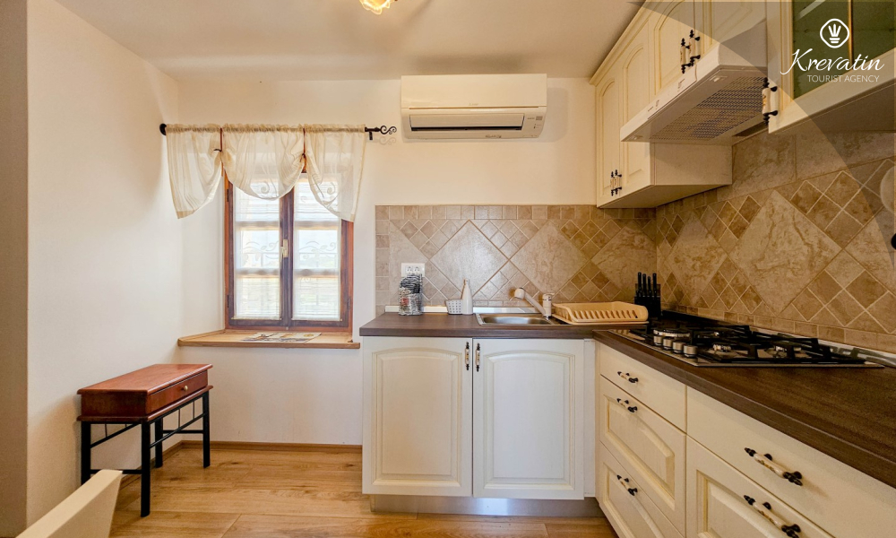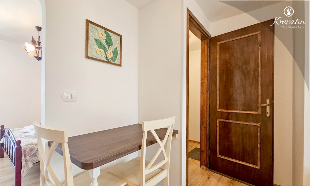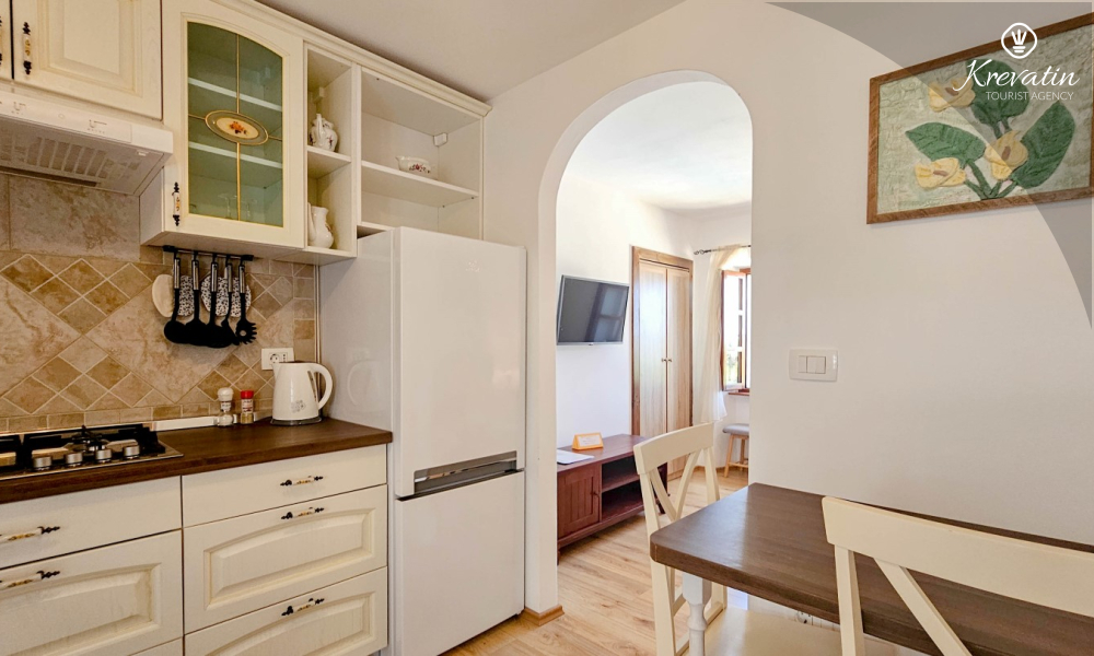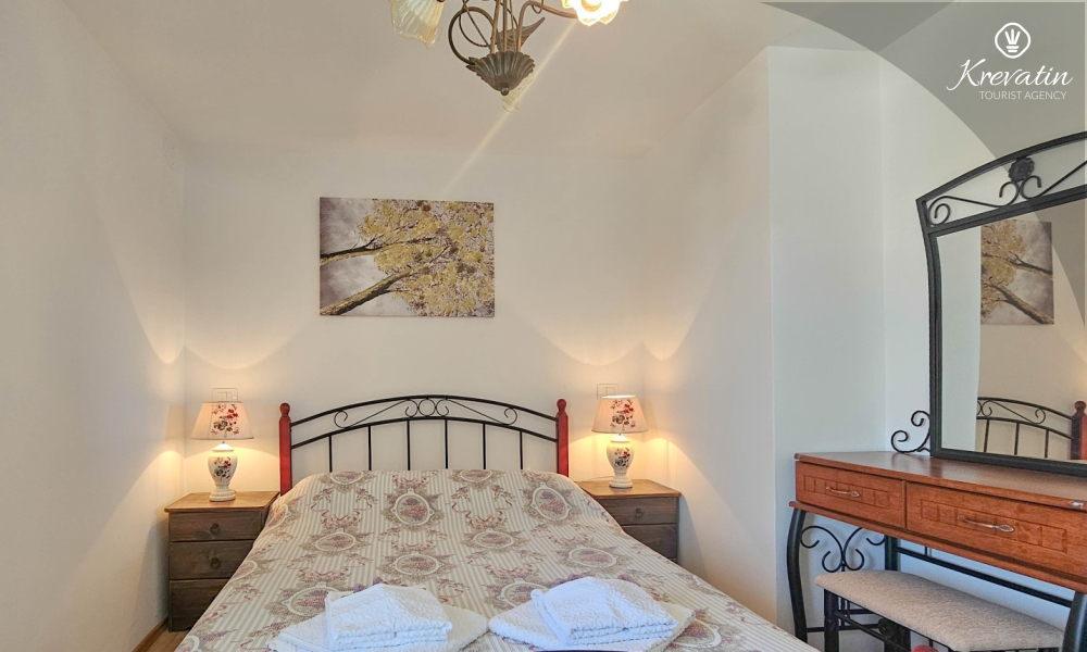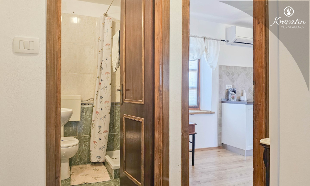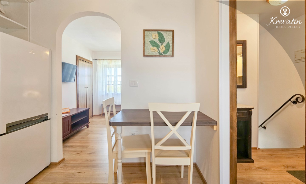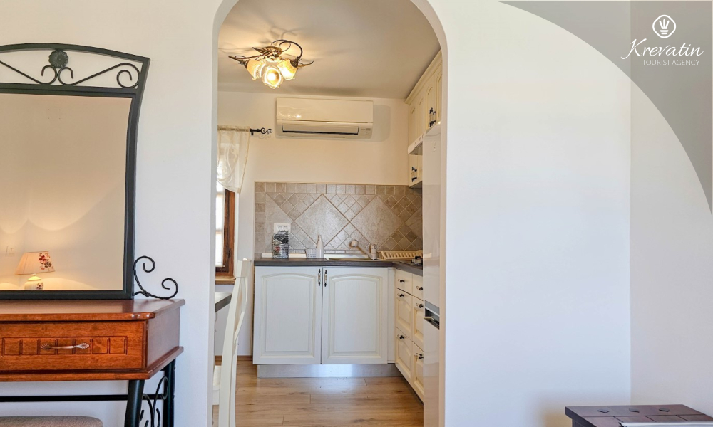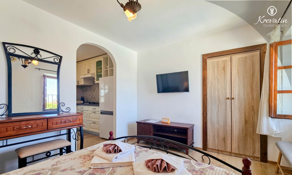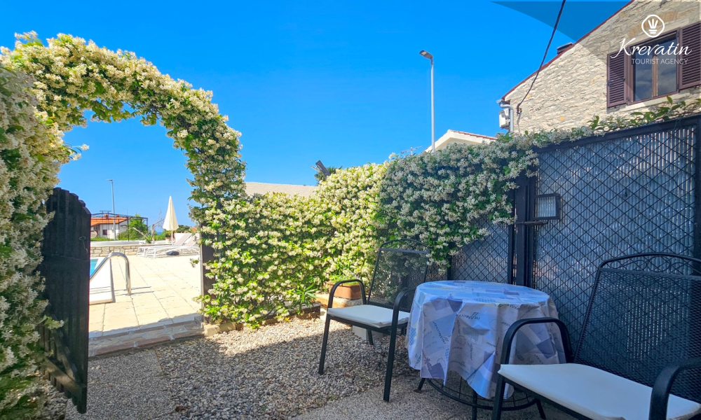 Inside the apartment there is a space with a double bed, a kitchen equipped with basic things for preparing meals, and a bathroom with a shower and toilet. On the ground floor there is a private terrace overlooking the swimming pool that is available to all guests of the house.