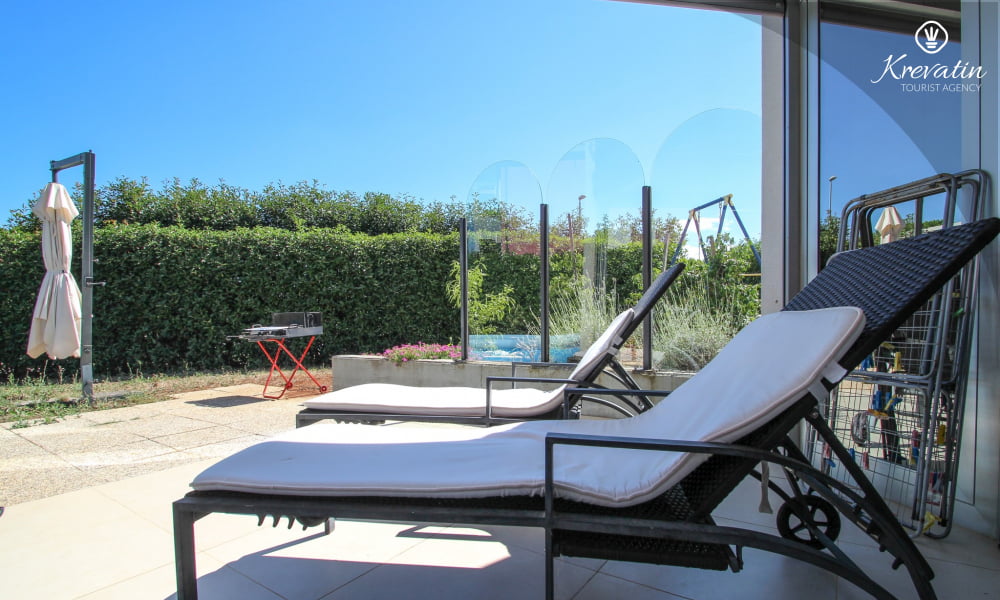 This apartment for up to 4 persons is situated on the ground floor and consists of two bedrooms, a living room and kitchen. The kitchen is equipped with electric stove, oven, refrigerator, dish washer and coffee maker. In addition there is a bathroom with shower and toilet, a nice terrace with furniture and a garden. SAT-TV, air condition, WLAN and bed linen are included in the price, pets are welcome on charge.
