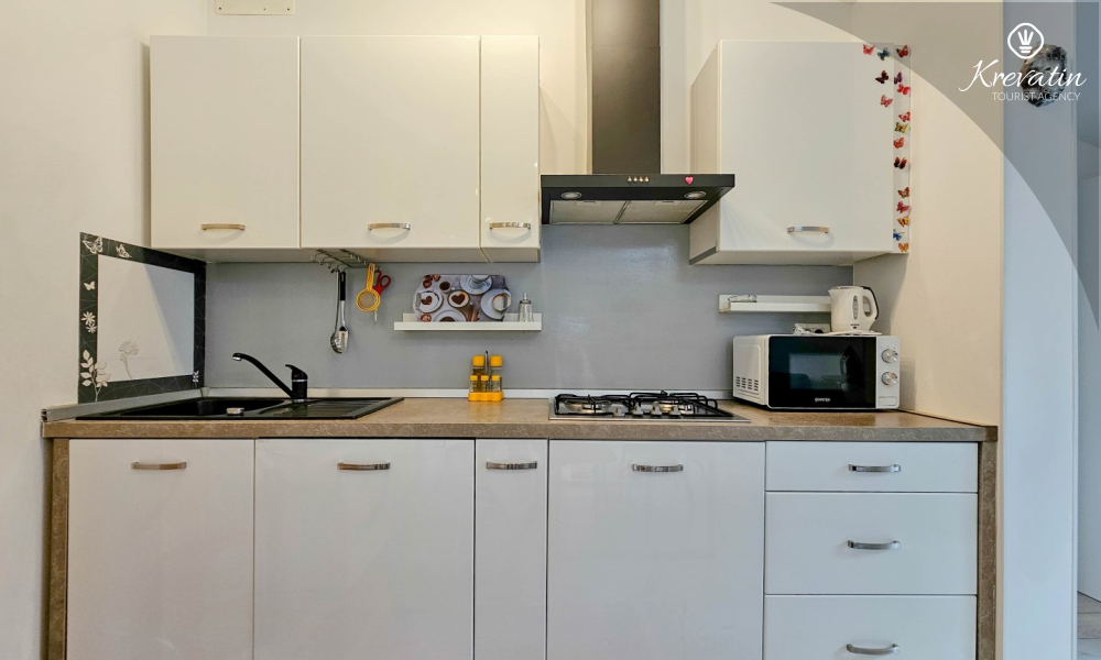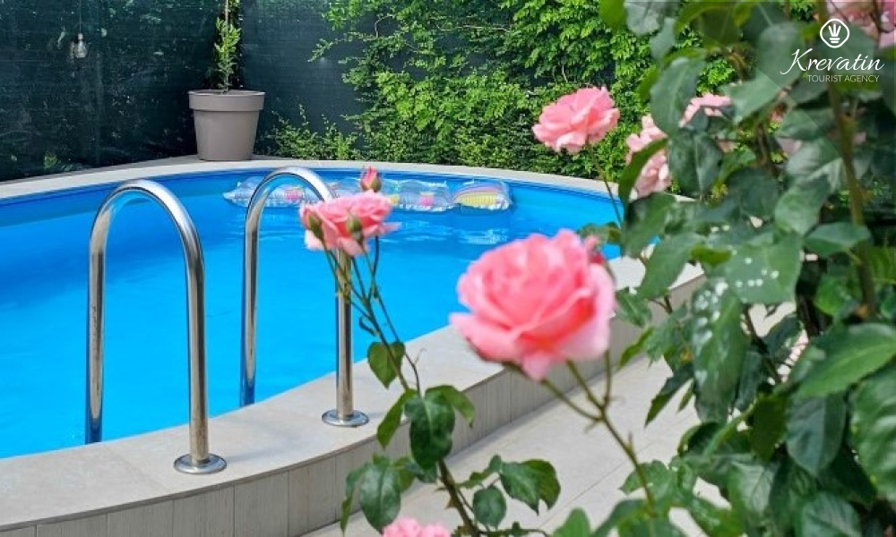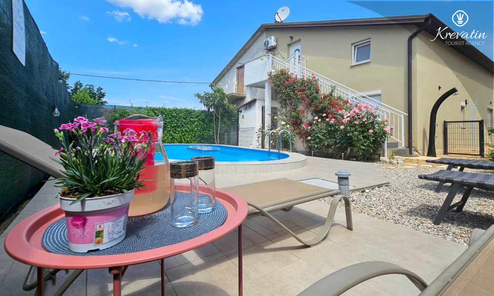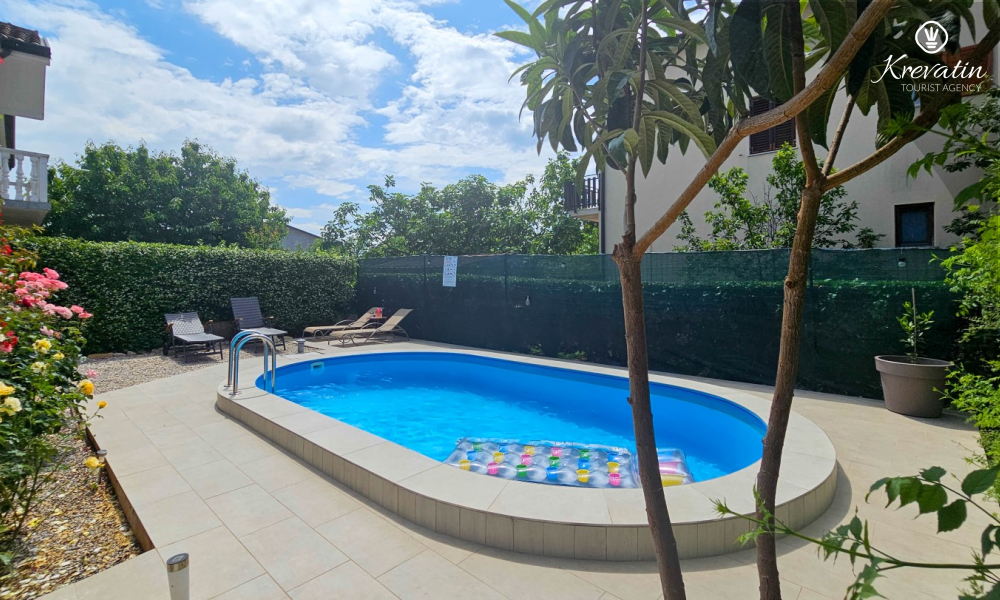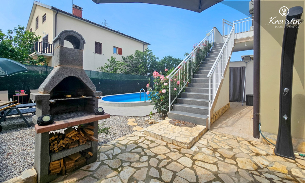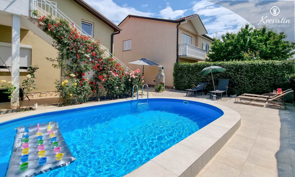 The apartment consists of two comfortable bedrooms, a spacious living room, a balcony with a beautiful view, and a modern kitchen equipped with all necessary appliances, including a gas/electric stove, oven, dishwasher, refrigerator, microwave oven, and coffee maker. In our fenced yard you will find a private swimming pool with deckchairs, an outdoor shower and a barbecue - the perfect place to enjoy sunny days and warm evenings.