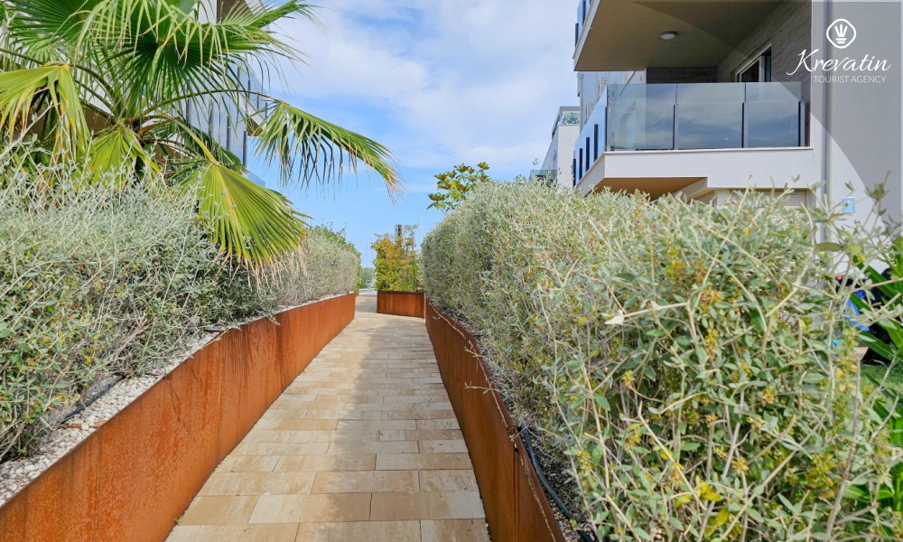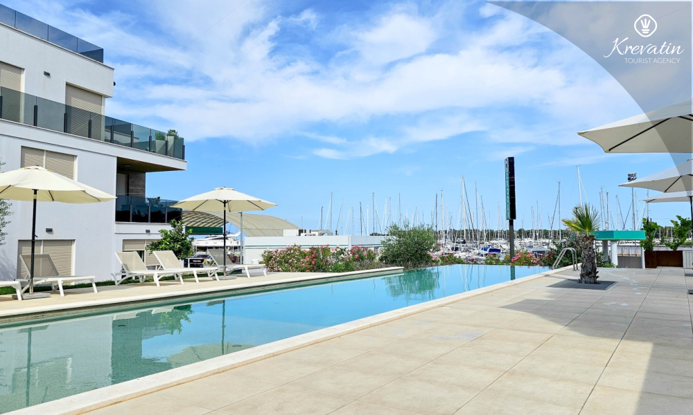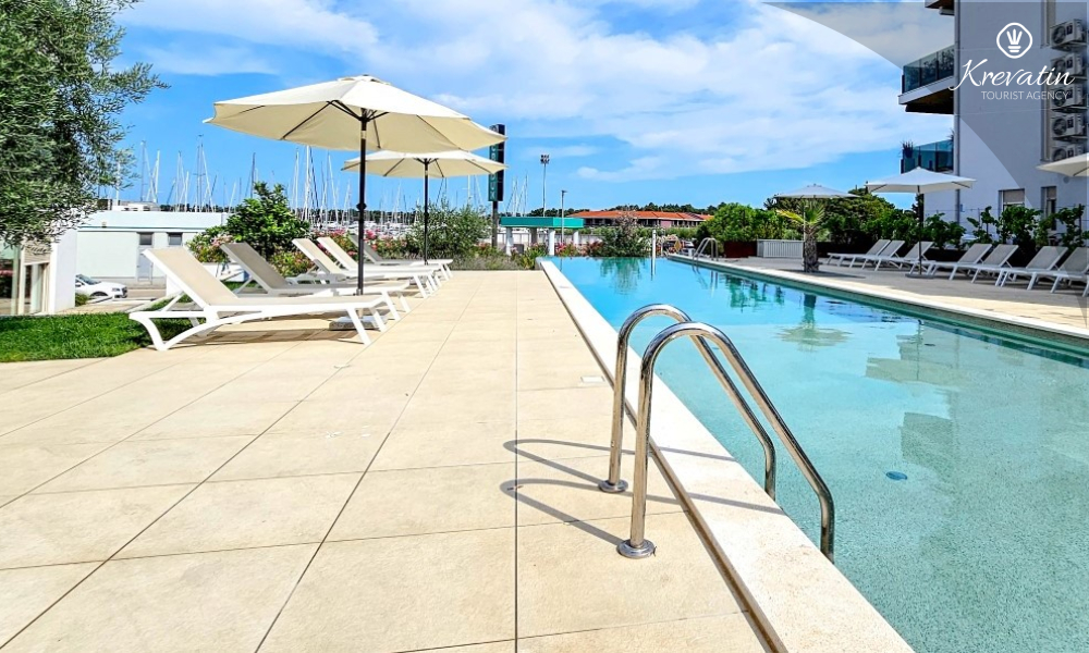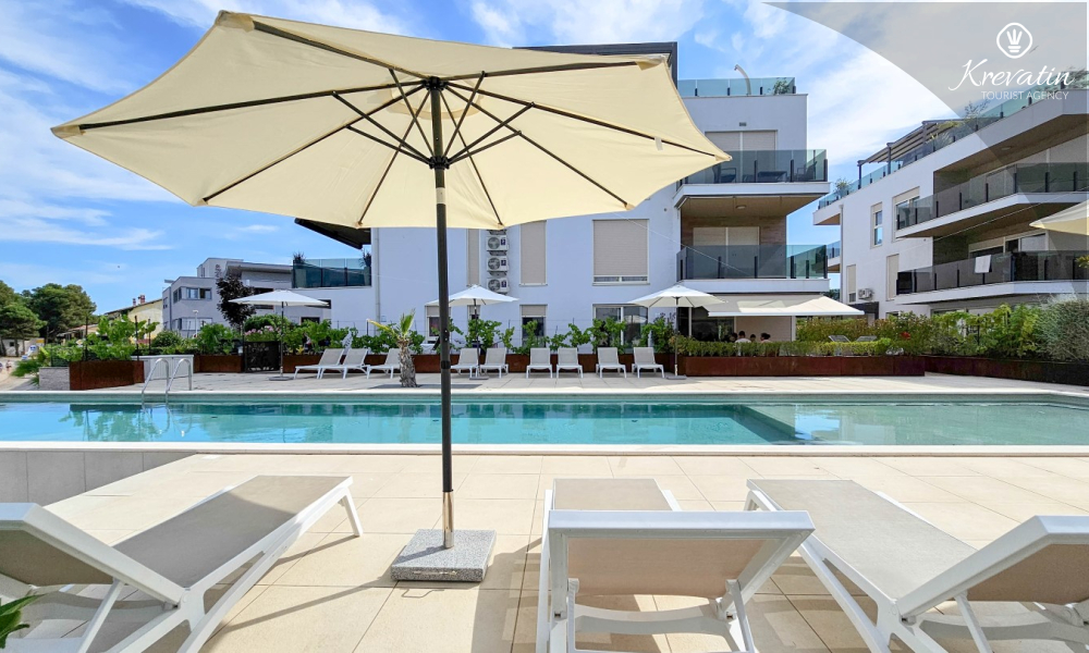 Apartment Green Oasis B7 is located in a modern building complex, next to a shared outdoor pool equipped with sun loungers and parasols.