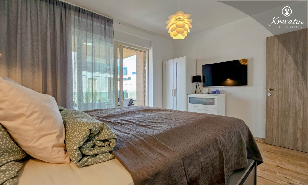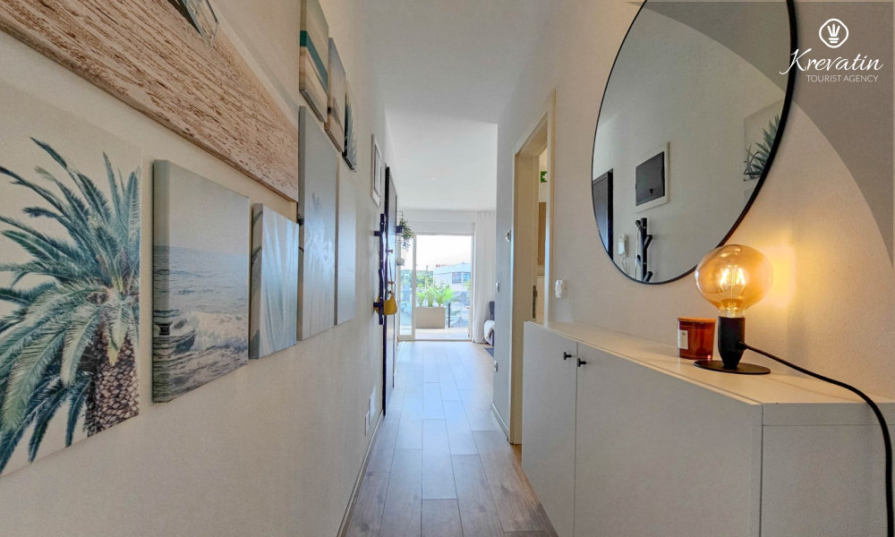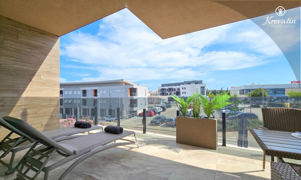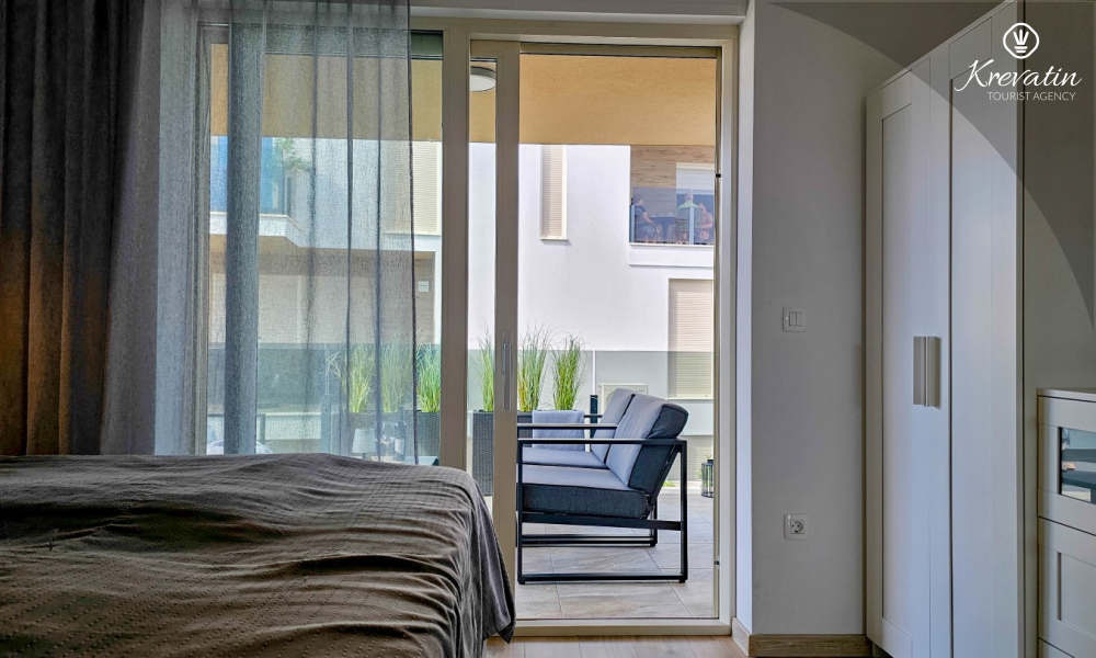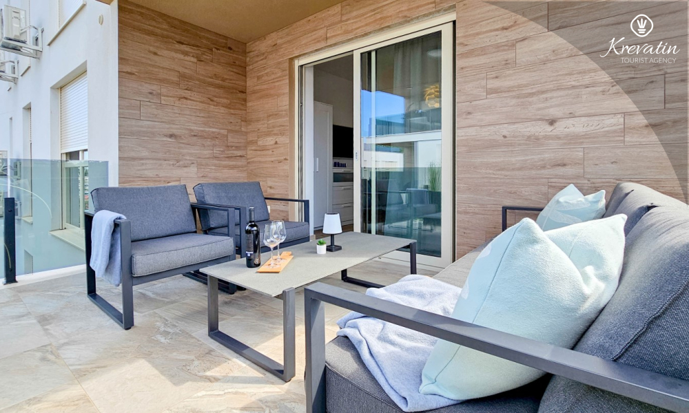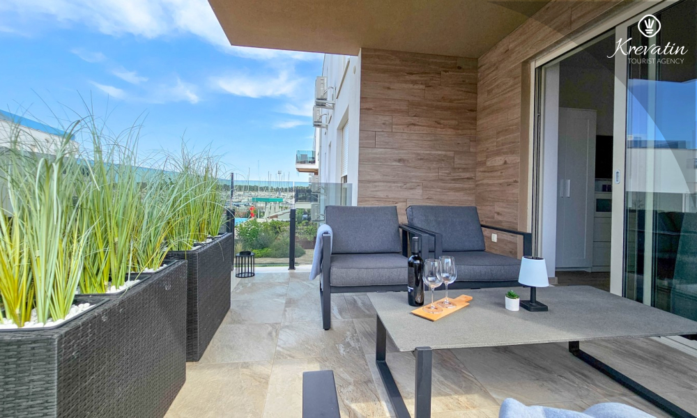 Guests have access to two balconies, one connected to the bedroom, and the other has an exit from the living room and is equipped with sun loungers, a parasol and a comfortable seating area.