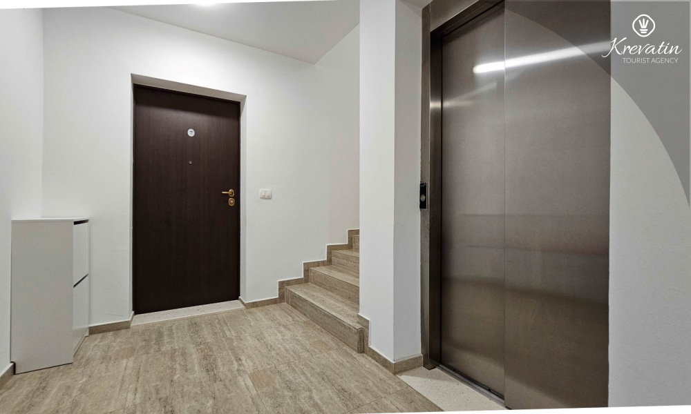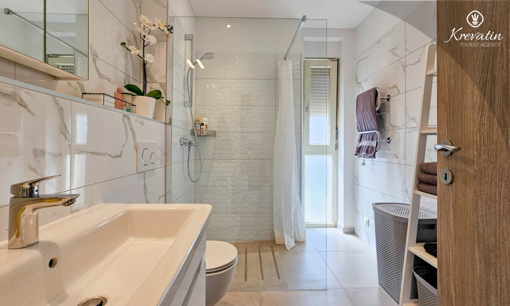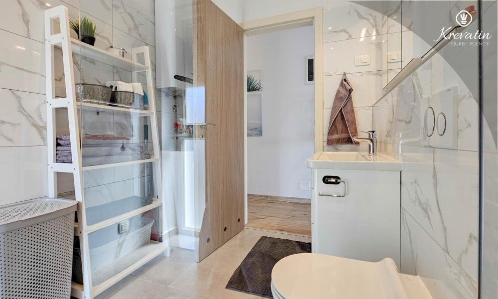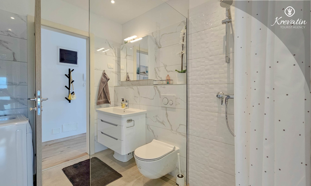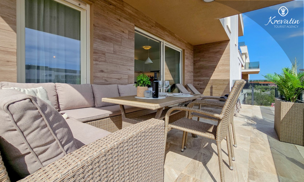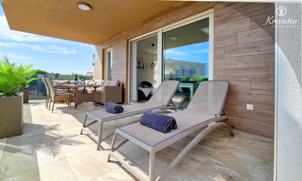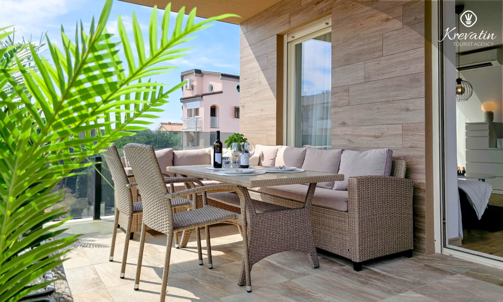 Guests have access to two balconies, one connected to the bedroom, and the other has an exit from the living room and is equipped with sun loungers, a parasol and a comfortable seating area.