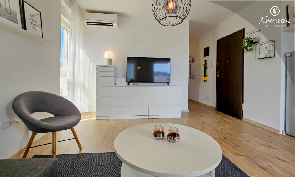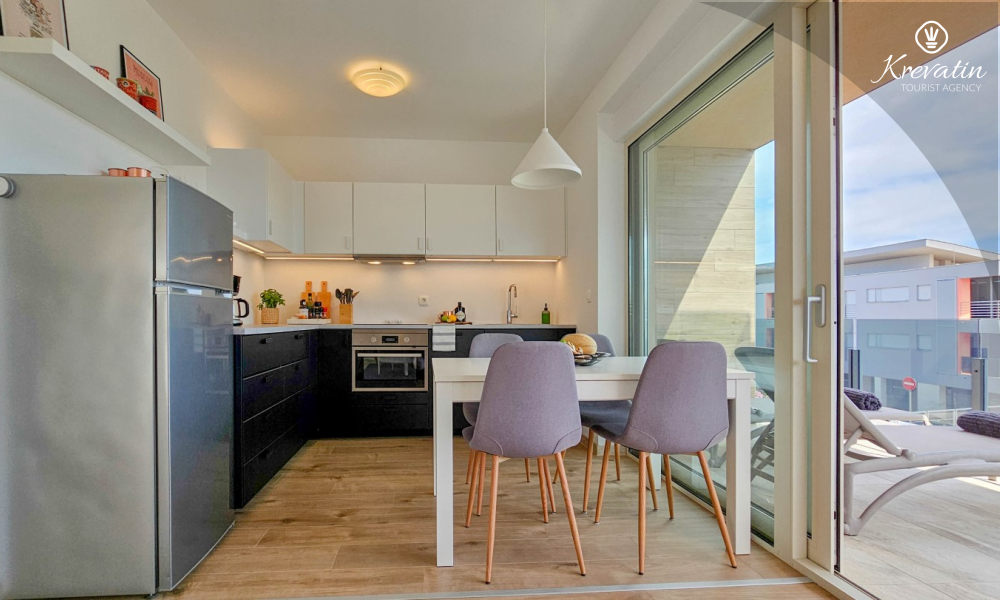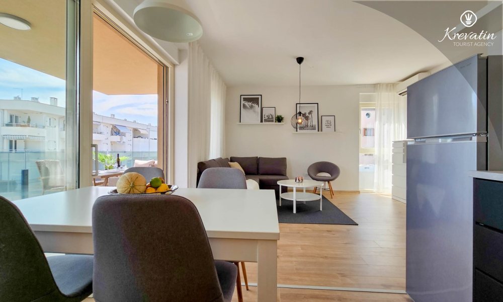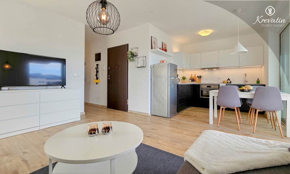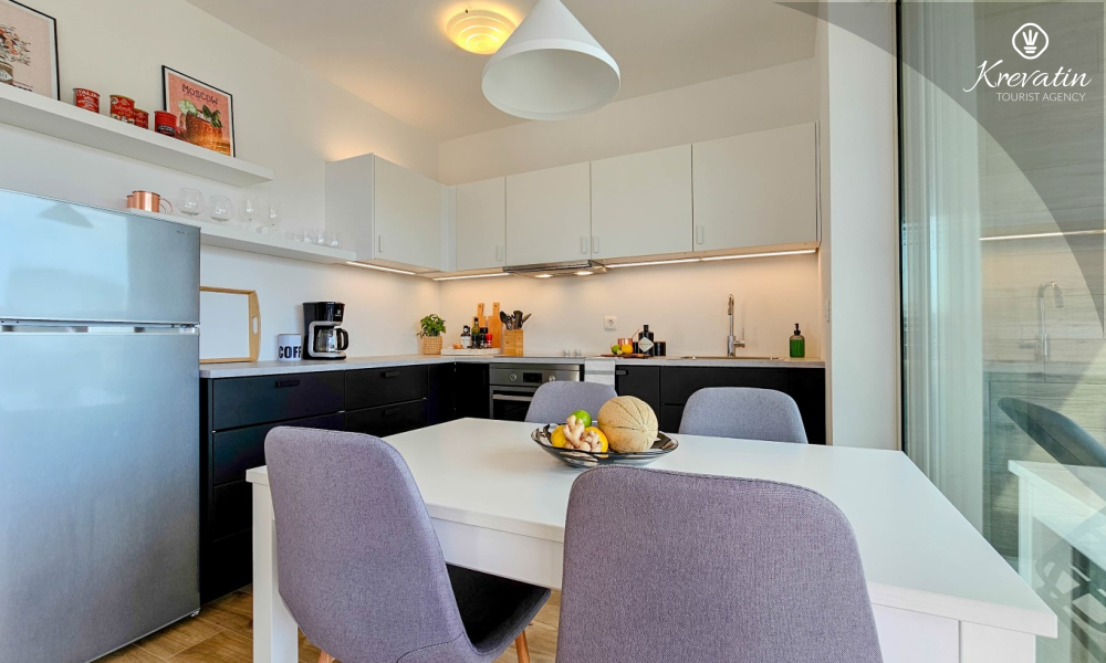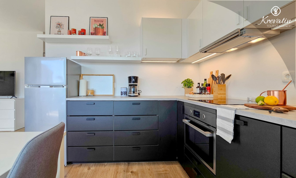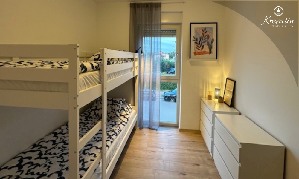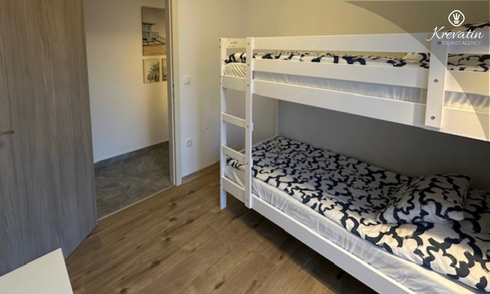 The apartment has two bedrooms, one with a double bed and the other with a bunk bed. An additional two guests can be accommodated on a sofa bed in the living room. The modern kitchen is equipped with the basic necessities for preparing meals.