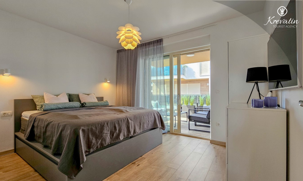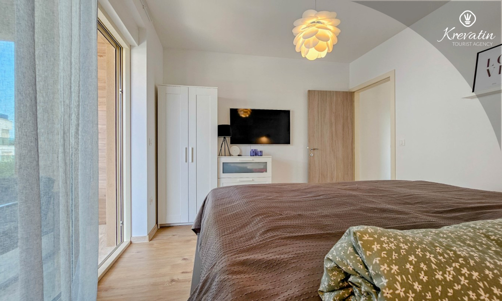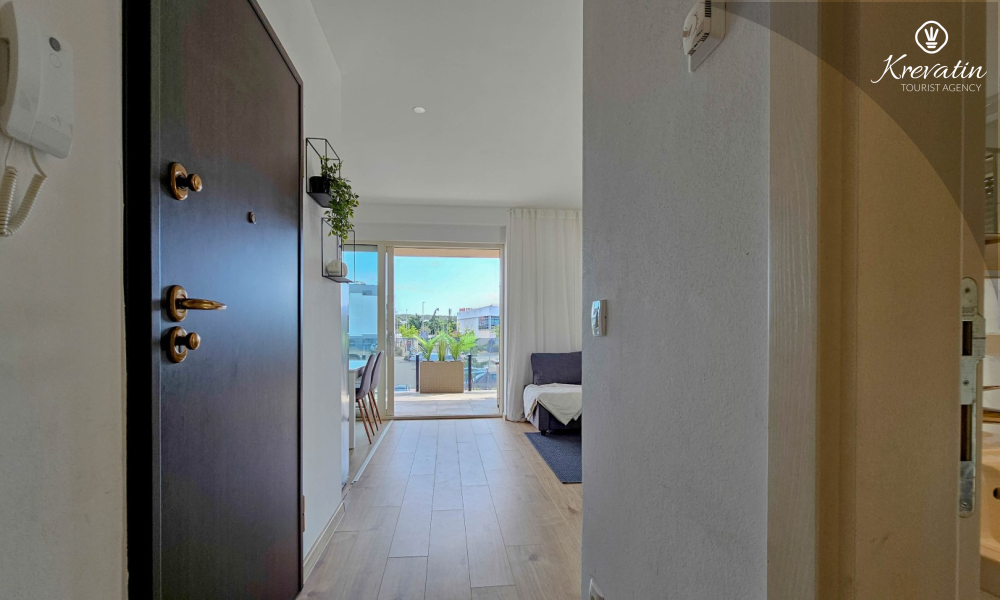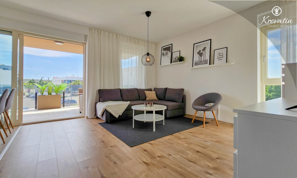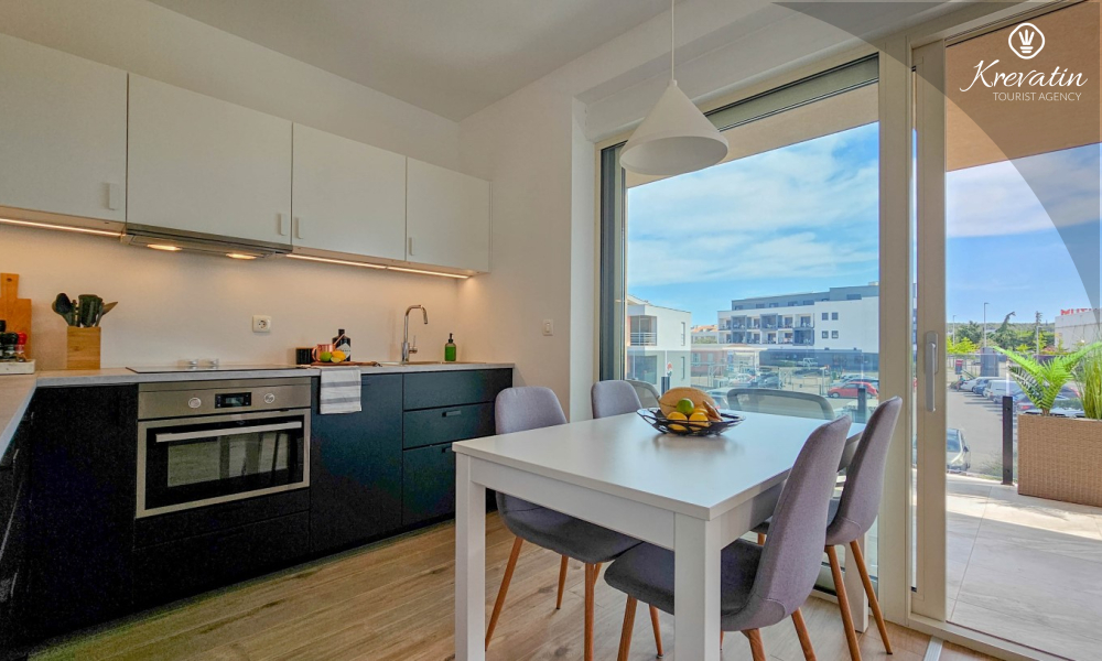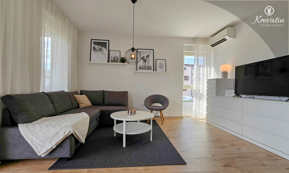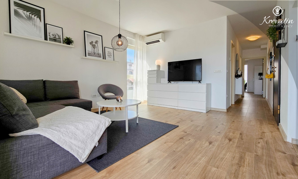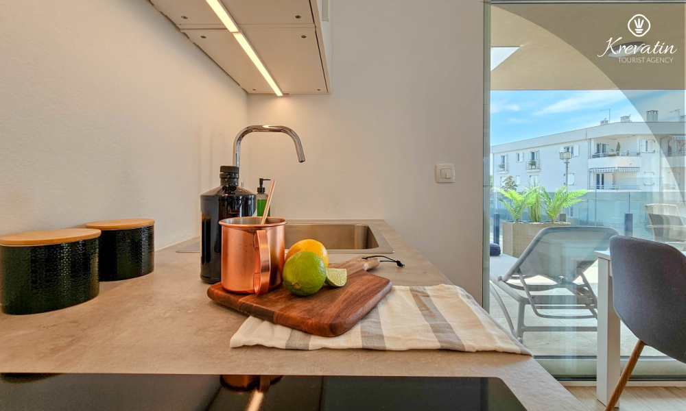 The apartment has two bedrooms, one with a double bed and the other with a bunk bed. An additional two guests can be accommodated on a sofa bed in the living room. The modern kitchen is equipped with the basic necessities for preparing meals.
