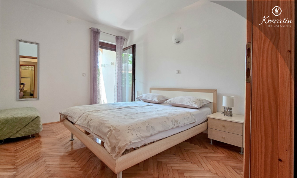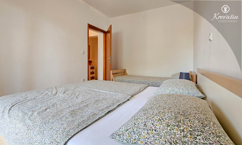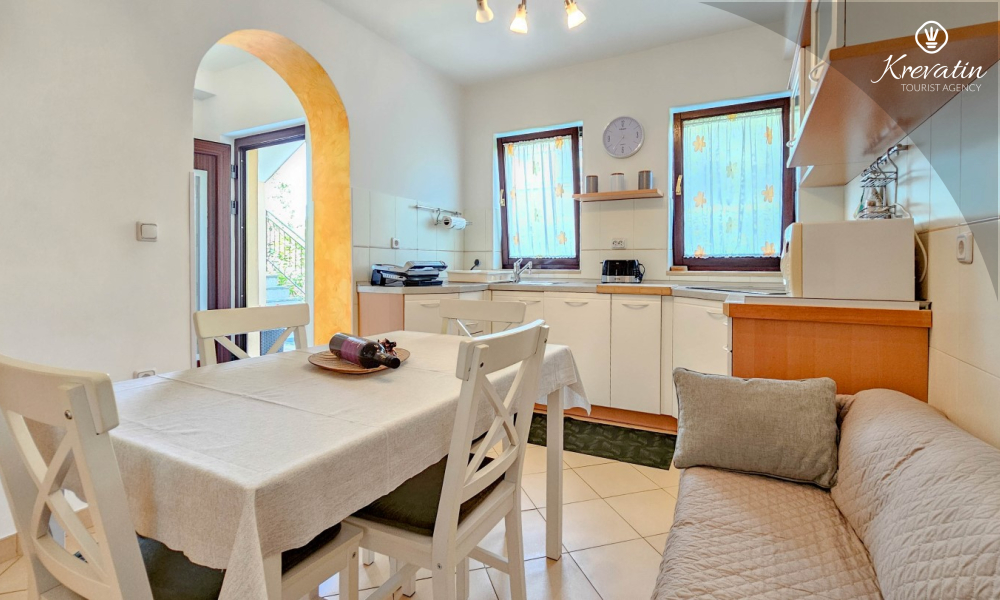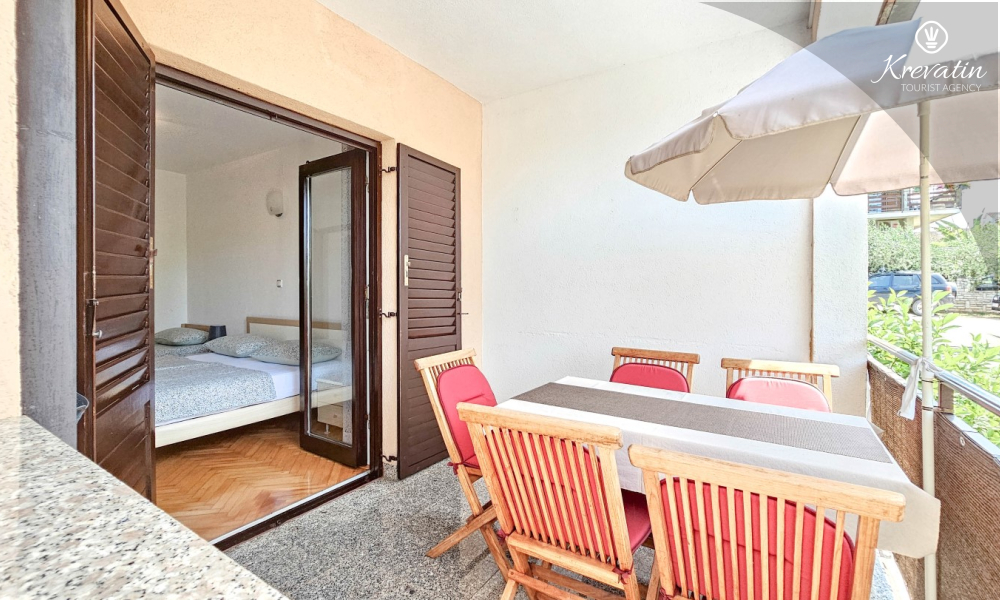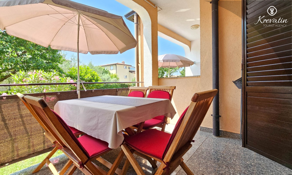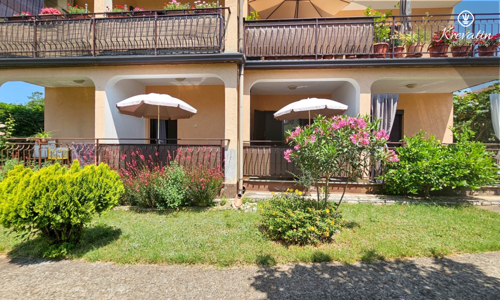 The apartment offers two bedrooms, a kitchen equipped with basic items for preparing meals, a bathroom with a shower and toilet, and two covered terraces with a table and chairs - perfect for relaxing in the fresh air. There is also a shared garden with a barbecue.