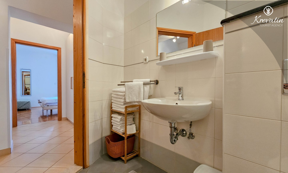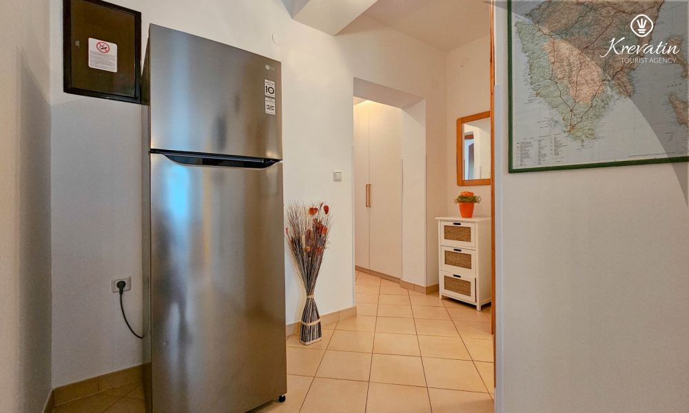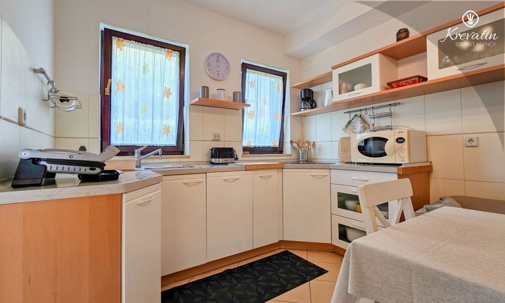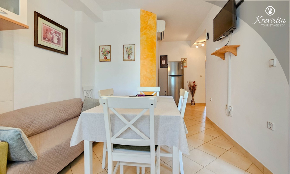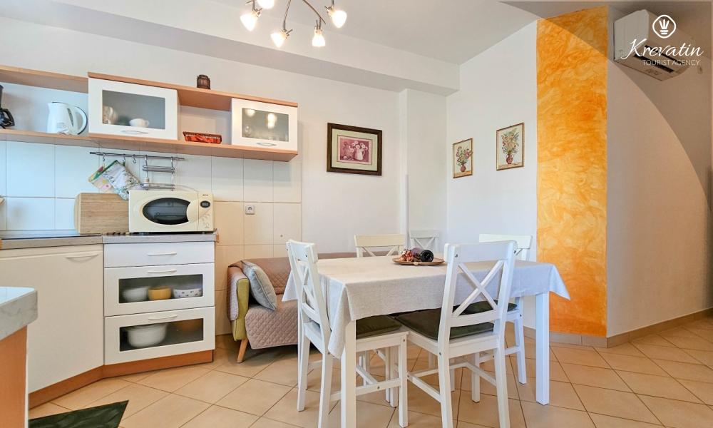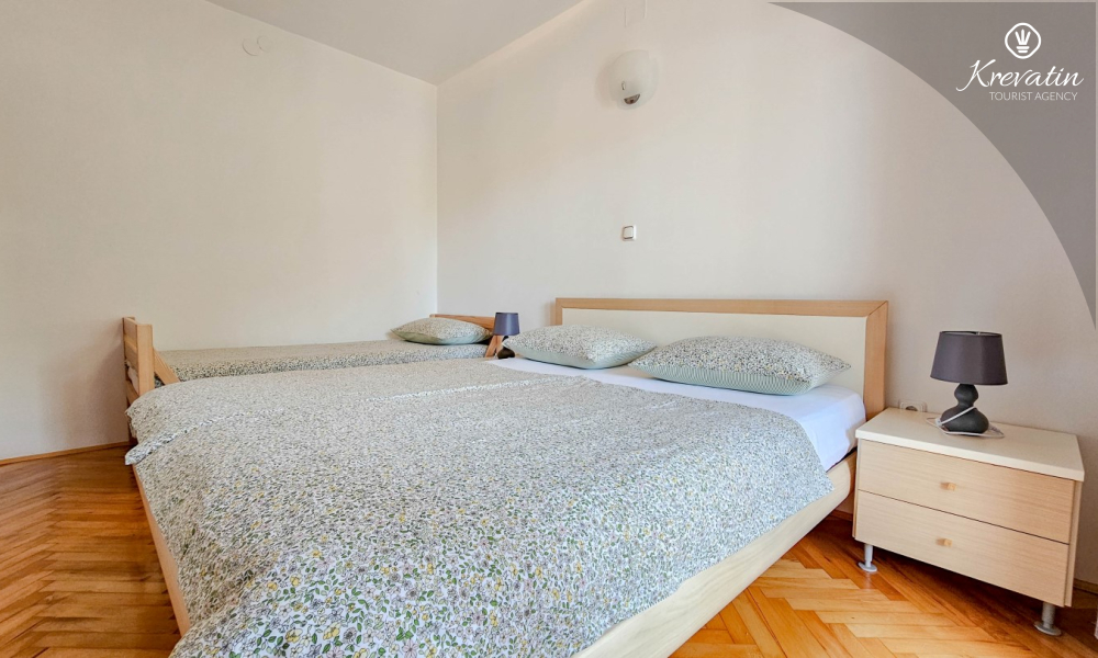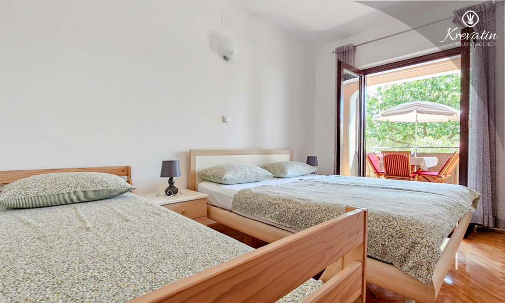 The apartment offers two bedrooms, a kitchen equipped with basic items for preparing meals, a bathroom with a shower and toilet, and two covered terraces with a table and chairs - perfect for relaxing in the fresh air. There is also a shared garden with a barbecue.