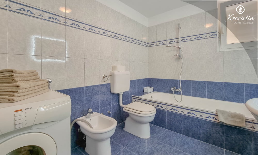 It consists of two comfortable bedrooms, a spacious living room with a kitchen and a dining area. The kitchen is fully equipped with all the essentials for preparing meals. There is also a bathroom with a shower and toilet, and there is an additional toilet for your comfort. There is also a terrace with furniture, ideal for outdoor living.