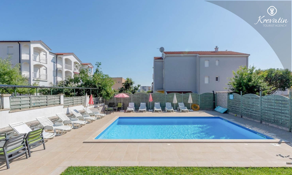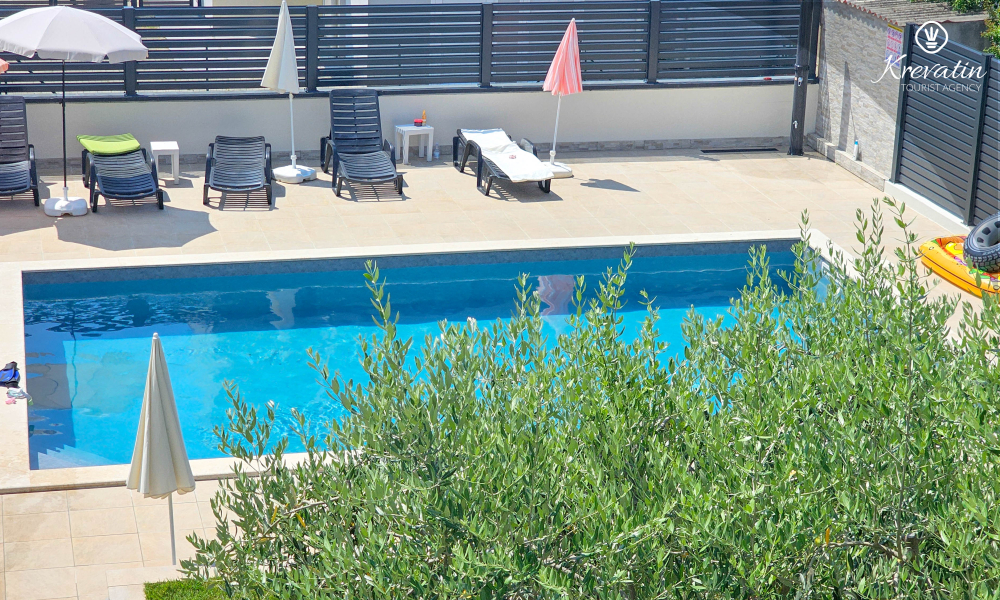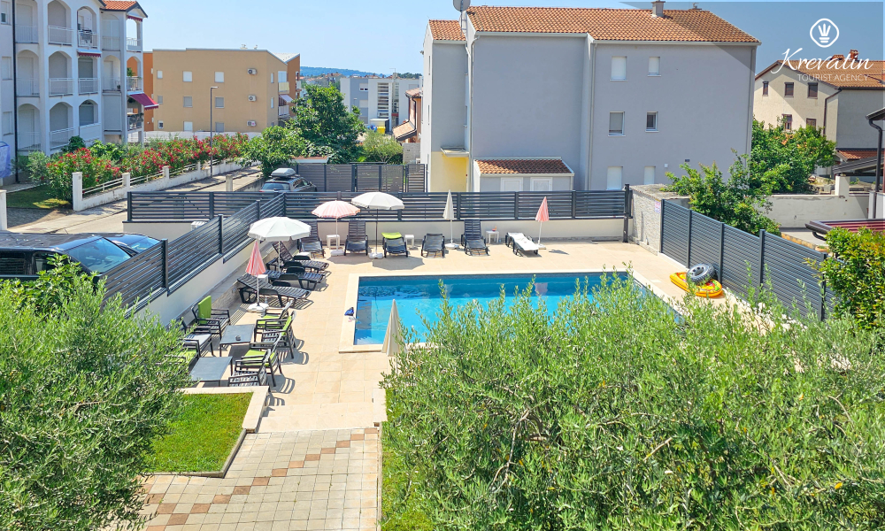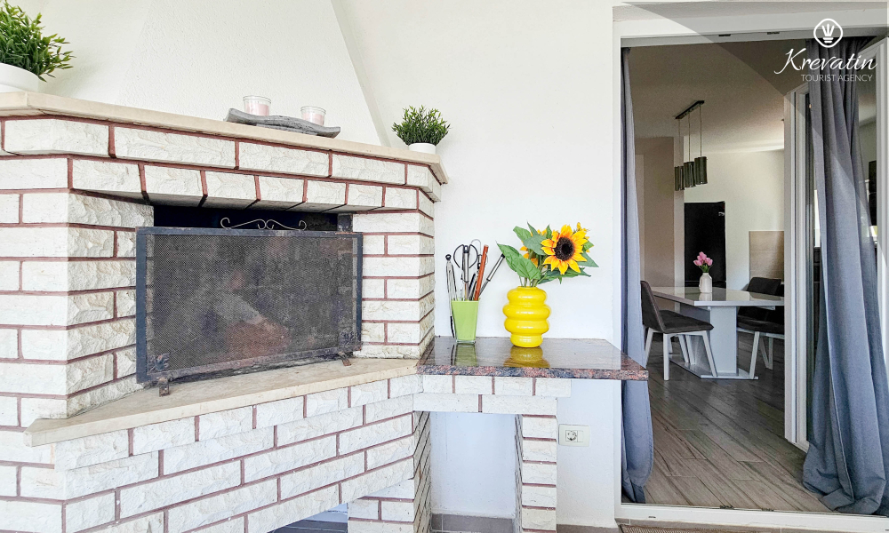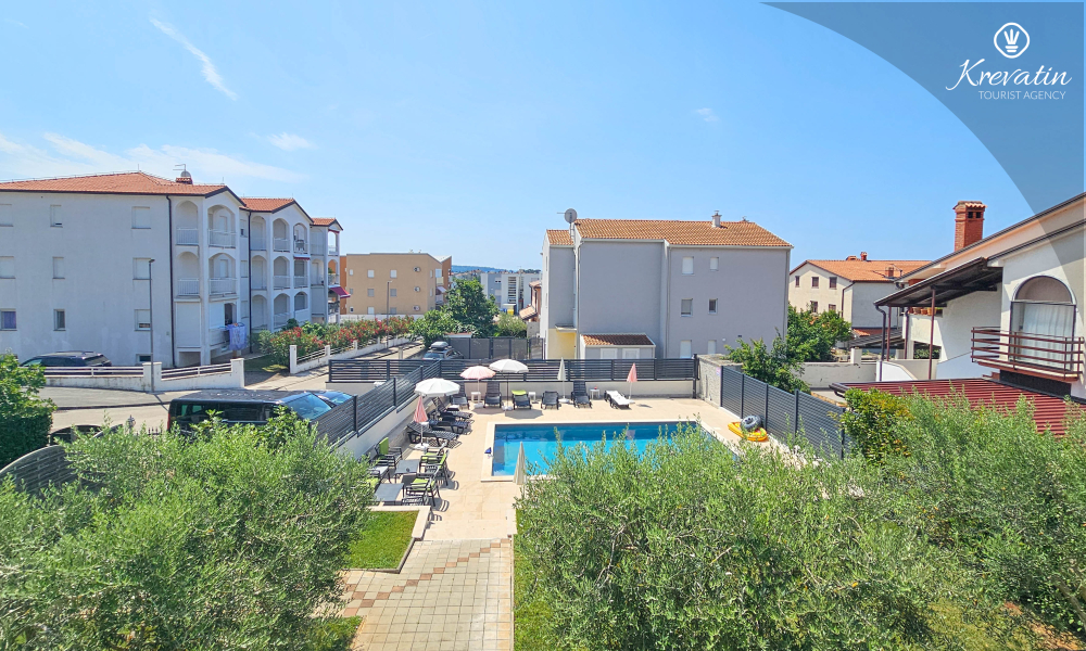 The apartment features two comfortable bedrooms, a fully equipped kitchen with all the essentials for meal preparation, and a spacious terrace overlooking the pool. A barbecue is also available on the terrace – perfect for outdoor dinners and relaxing summer evenings.
