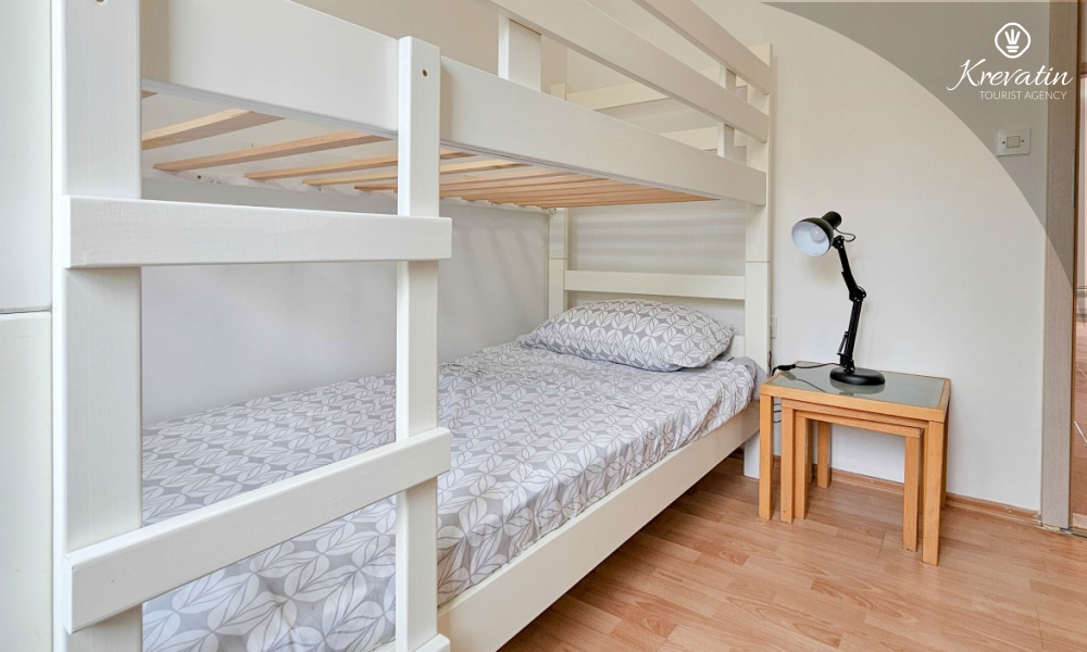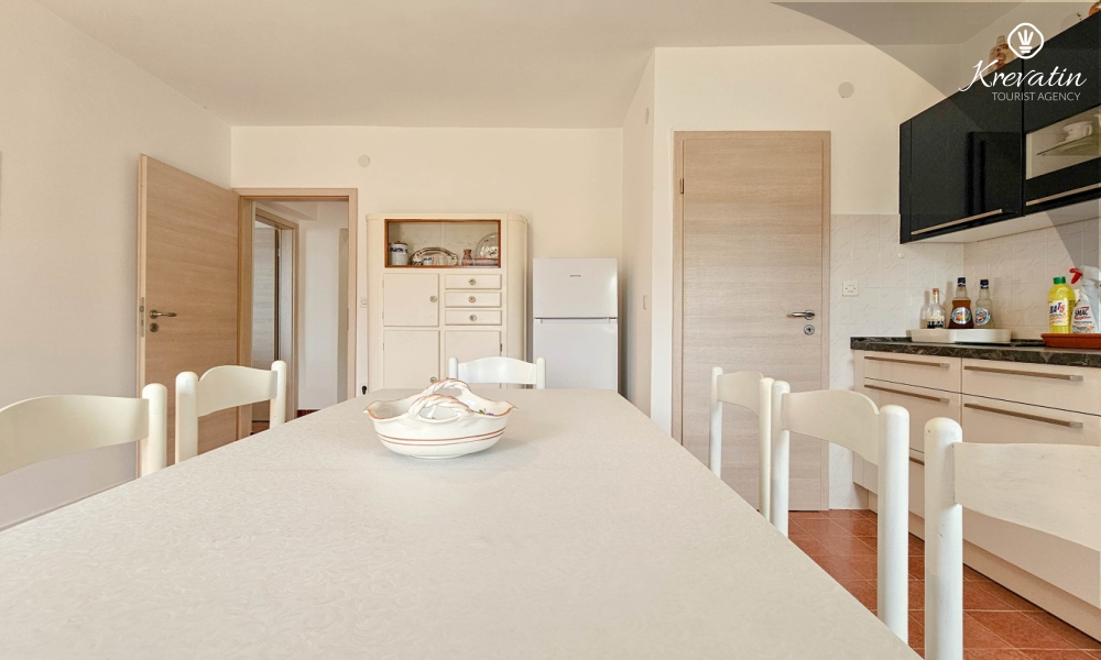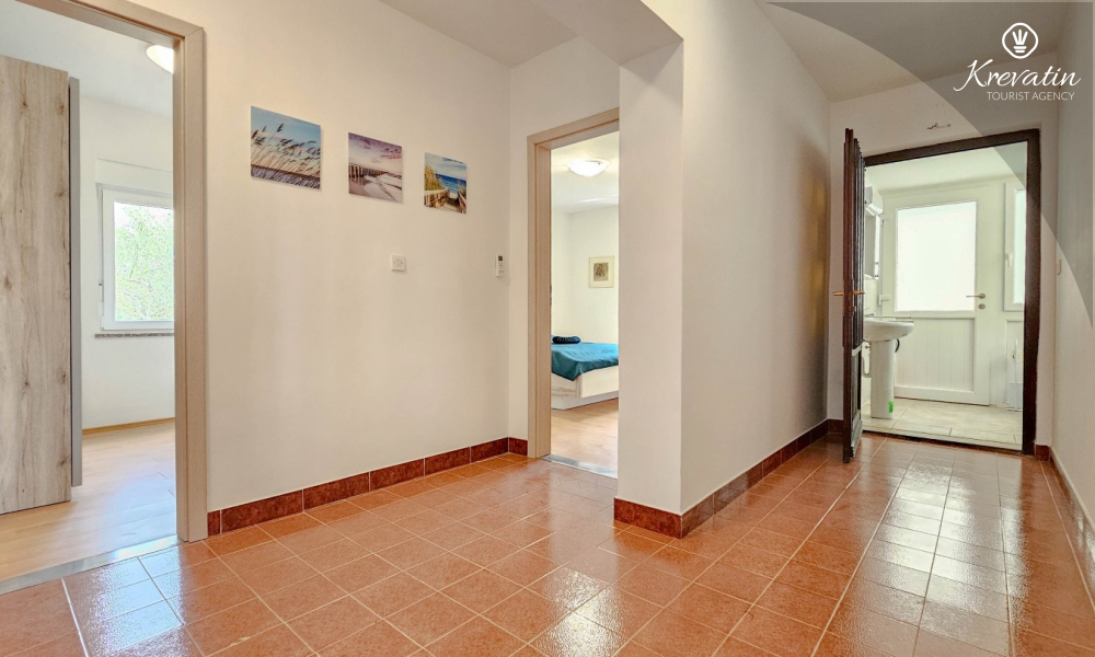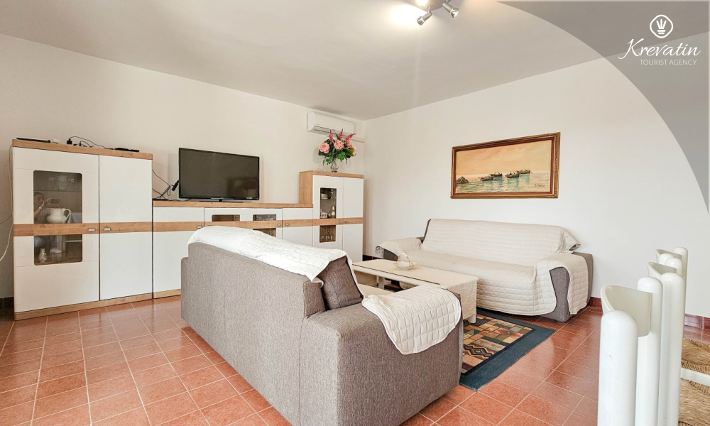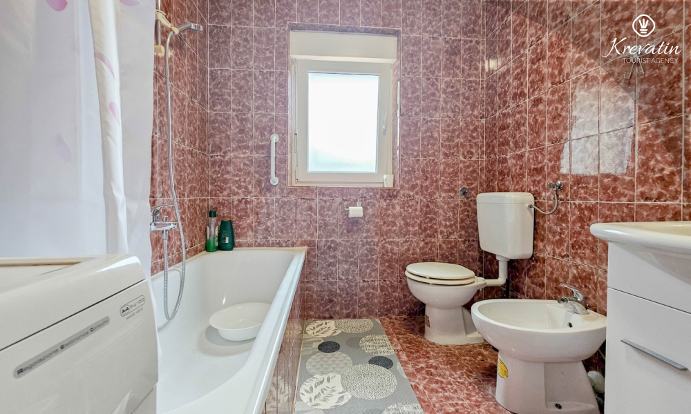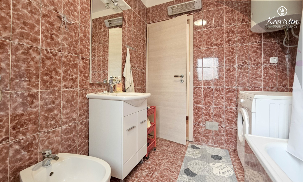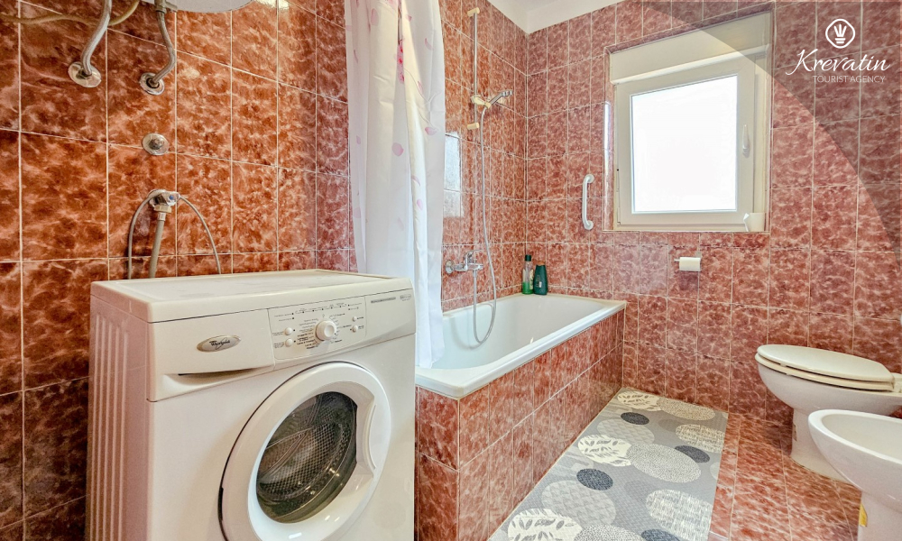 The apartment offers three bedrooms - two with a double bed and one with a single bed - while two more people can sleep in the spacious living room. Guests have two bathrooms at their disposal, one with a bathtub and a washing machine, the other with a shower. The kitchen with a dining area is equipped with basic items for preparing meals, and the living room leads to a terrace with - the perfect place for morning coffee or evening socializing.