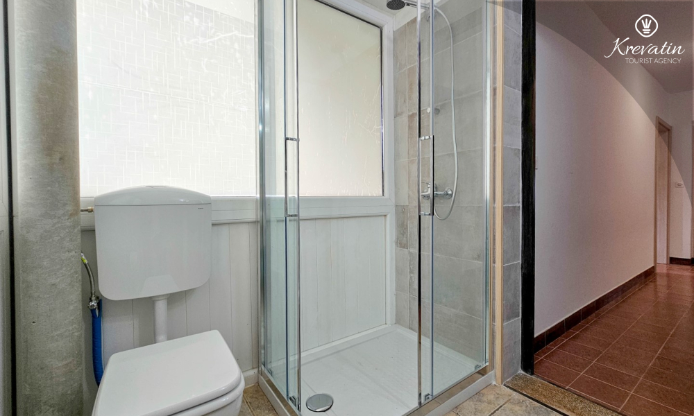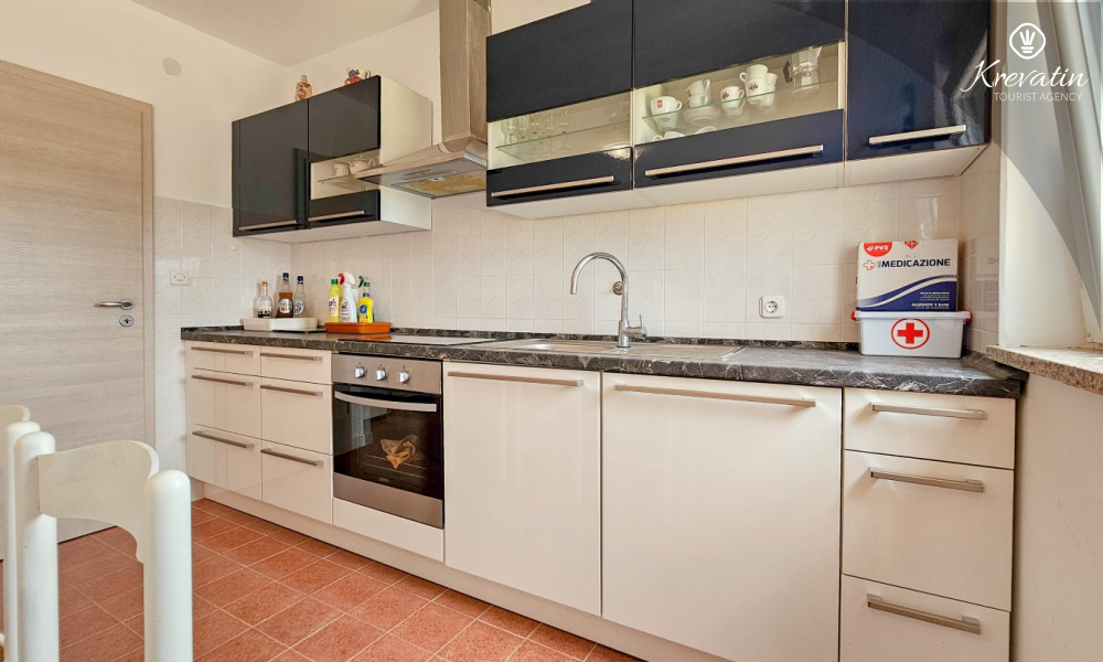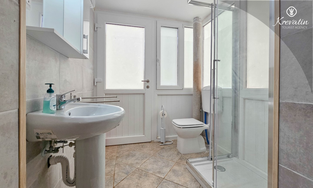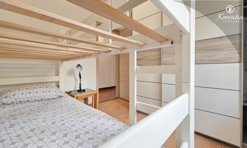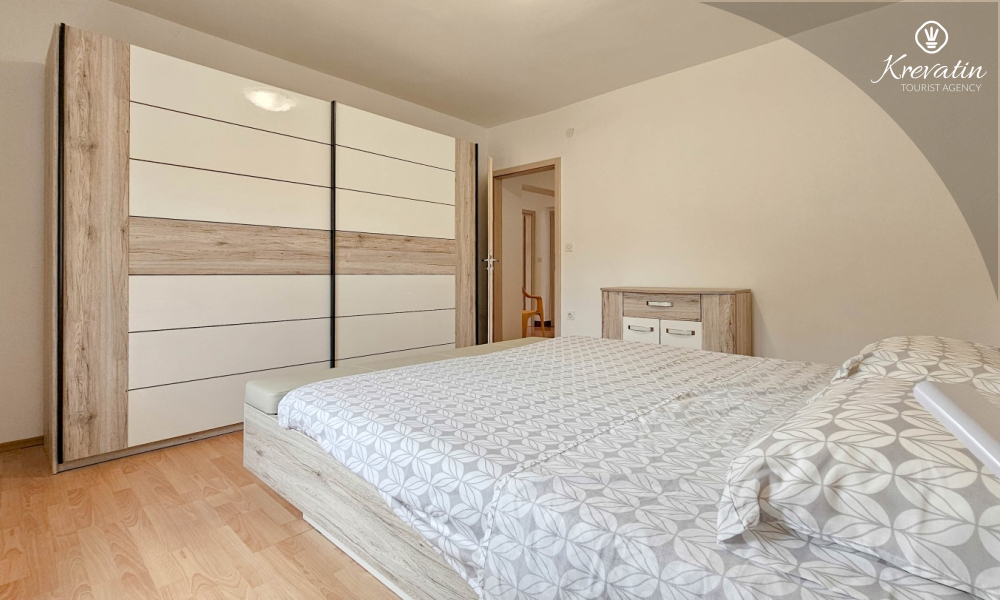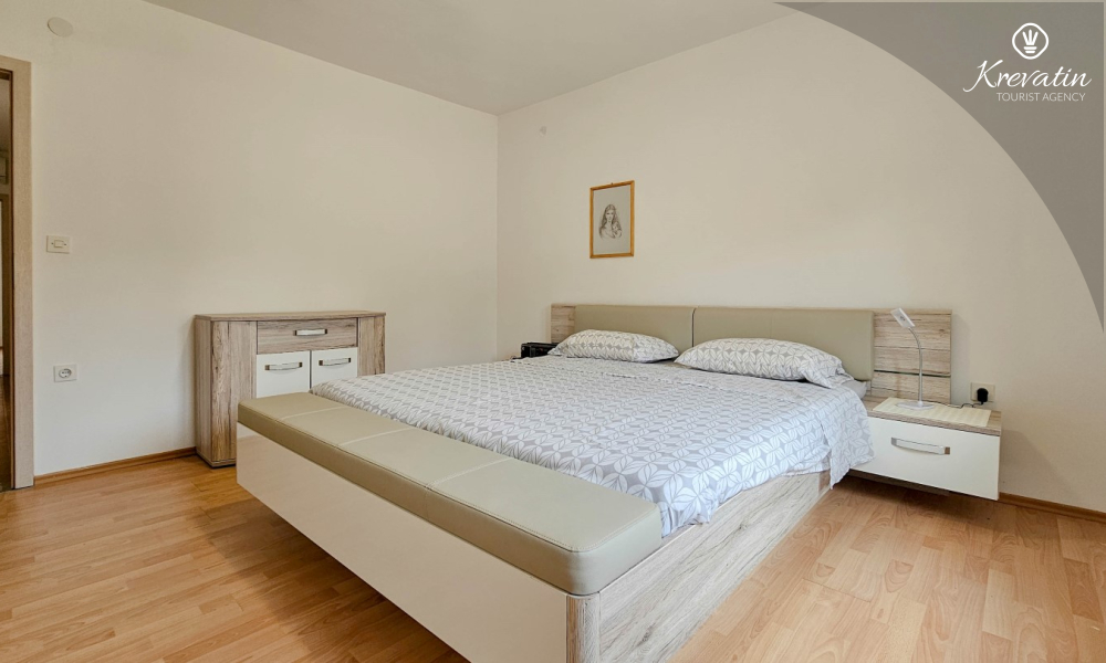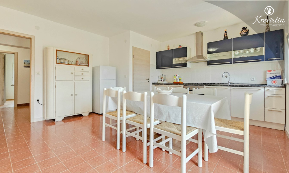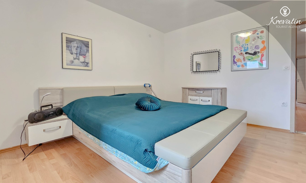 The apartment offers three bedrooms - two with a double bed and one with a single bed - while two more people can sleep in the spacious living room. Guests have two bathrooms at their disposal, one with a bathtub and a washing machine, the other with a shower. The kitchen with a dining area is equipped with basic items for preparing meals, and the living room leads to a terrace with - the perfect place for morning coffee or evening socializing.