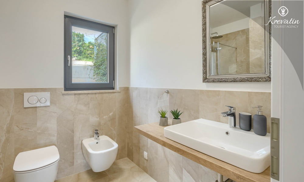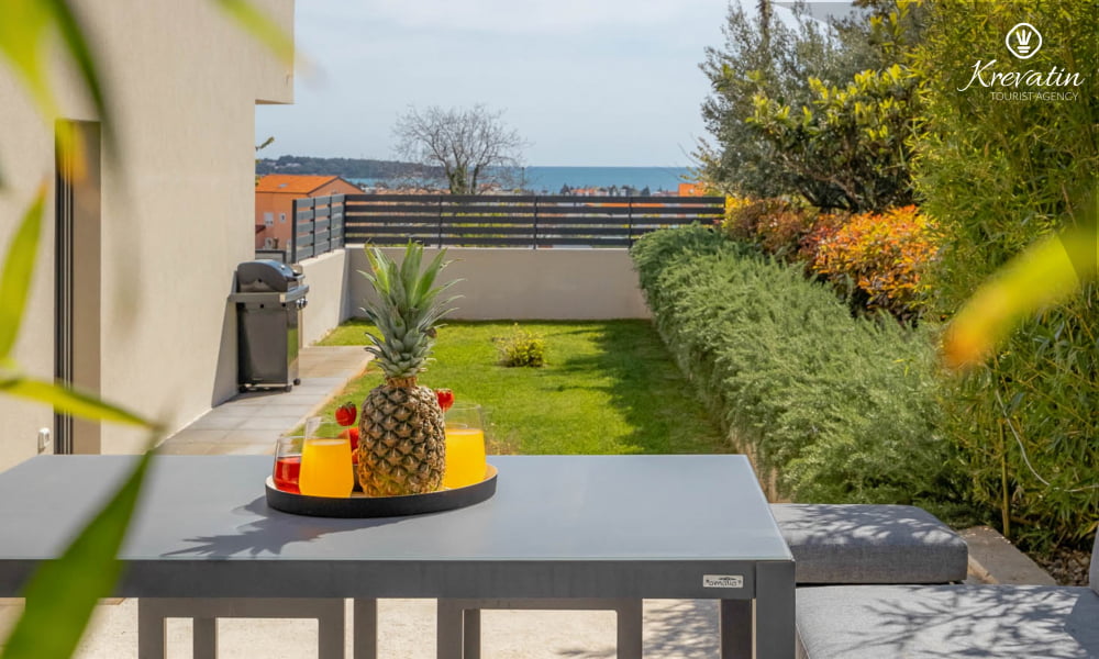 This apartment for up to 4 persons is situated on the ground floor and consists of two bedrooms, a living room and kitchen. The kitchen is equipped with electric stove, oven, refrigerator and coffee maker. In addition there are two bathrooms, one with shower and toilet and one only with toilet, a nice terrace with furniture and little garden. SAT-TV, air condition, WLAN, bed linen and towels are included in the price, pets are not allowed. There is also one roof terrace whit beautiful view on the whole Novigrad and the sea, and is available on common use.