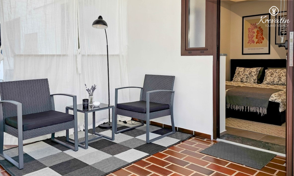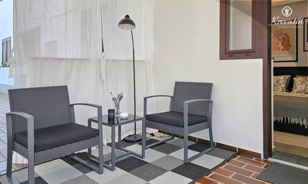 The studio has a comfortable double bed, a small kitchenette with basic equipment and a bathroom equipped with a shower and toilet. There is also a terrace with a table and chairs for outdoor enjoyment.