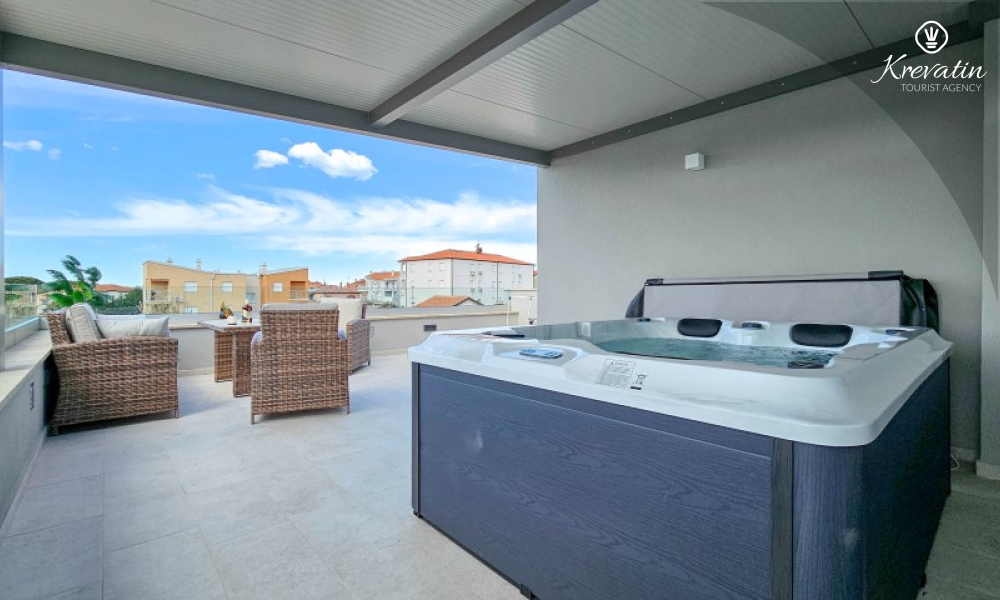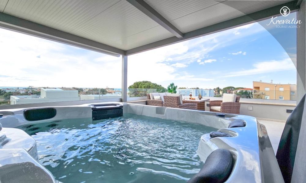 On the ground floor there is a spacious living room connected to the dining room and kitchen – equipped with all the basic things for preparing meals, and a bathroom with shower and toilet. Upstairs there are two bedrooms with double beds, each with its own balcony, and an additional bathroom, and two additional people can sleep comfortably in the living room. The roof terrace has a jacuzzi and garden furniture, and in the courtyard there is a swimming pool, a spacious terrace for relaxation and a barbecue.