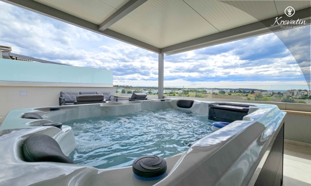On the ground floor there is a spacious living room connected to the dining room and kitchen – equipped with all the essentials for preparing meals, and a bathroom with shower and toilet. On the first floor there are two bedrooms with double beds and a balcony, and an additional bathroom, and two more people can sleep comfortably in the living room. On the roof terrace there is a jacuzzi and garden furniture, and on the ground floor there is a spacious terrace for relaxing and a barbecue.