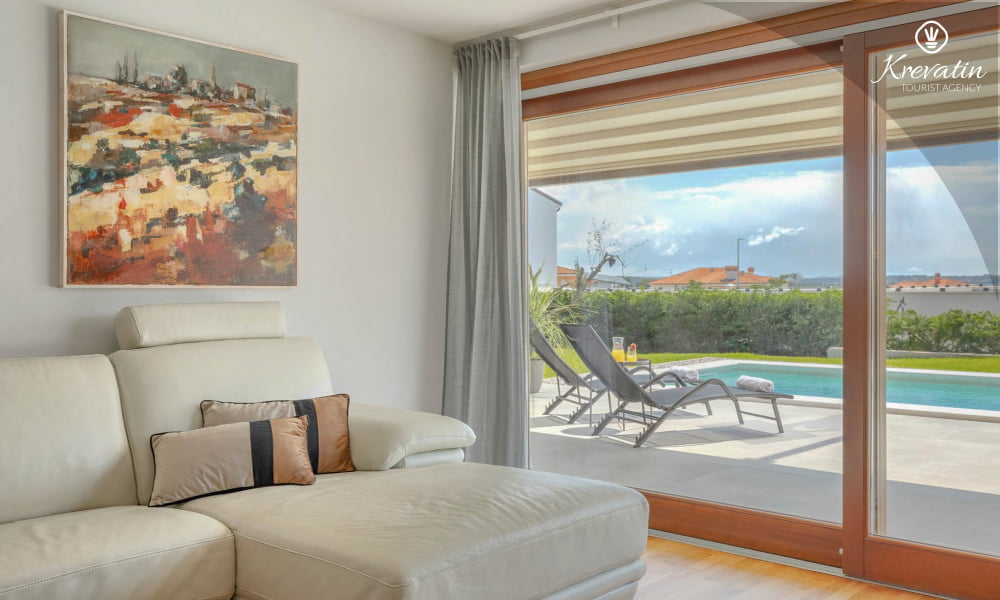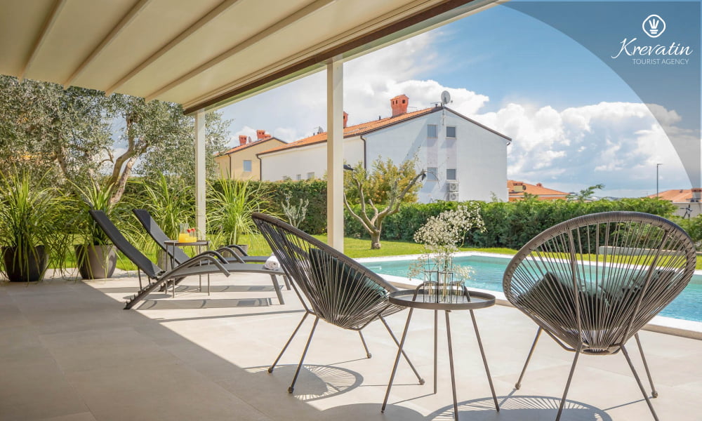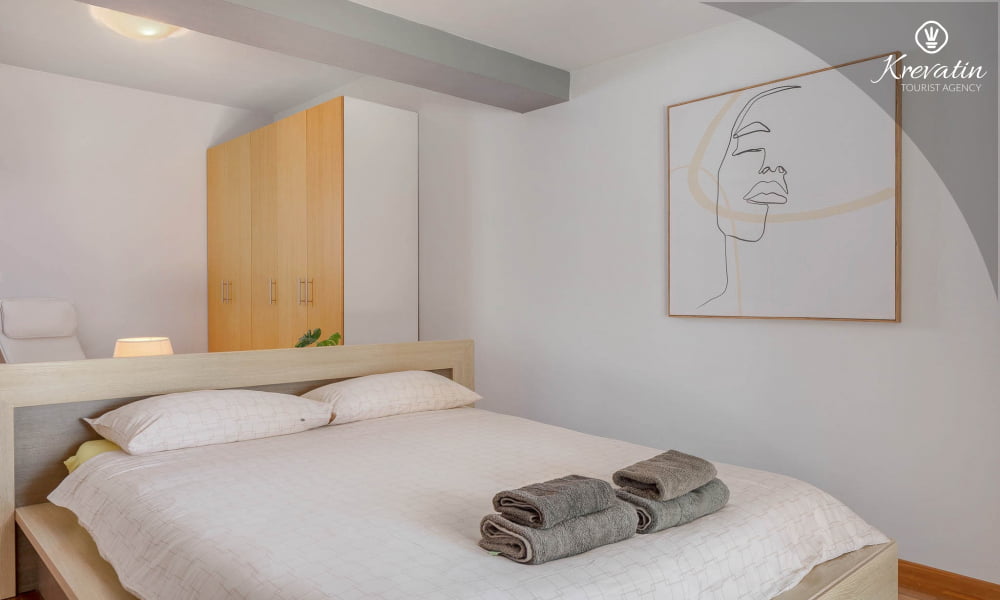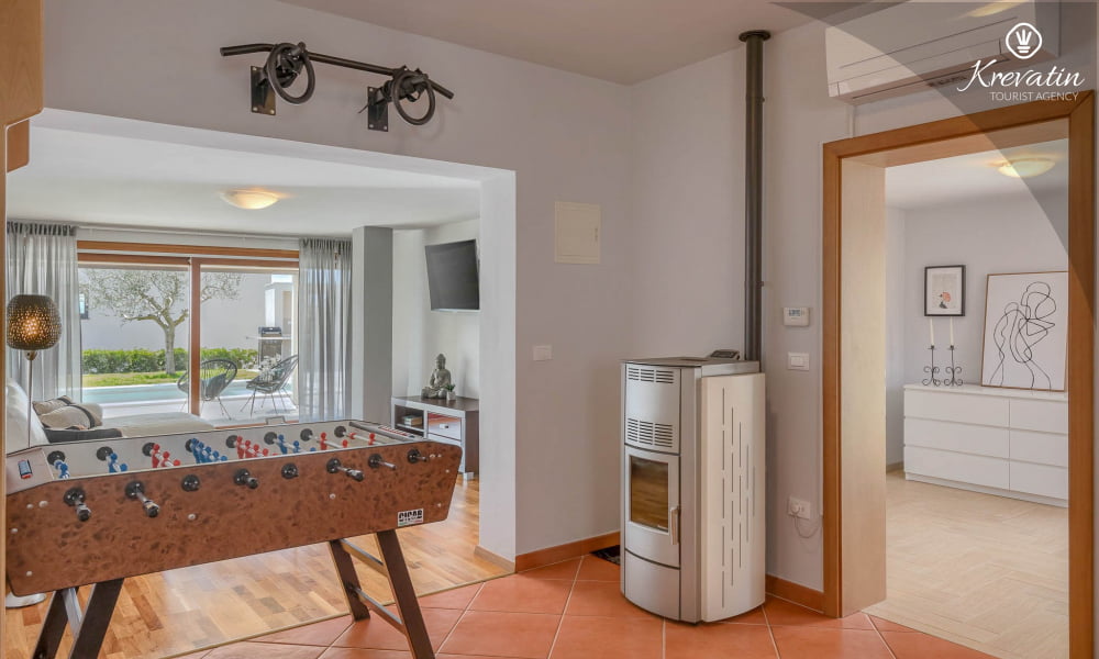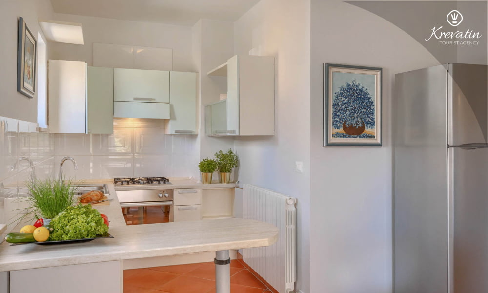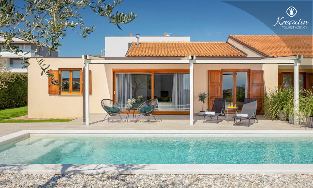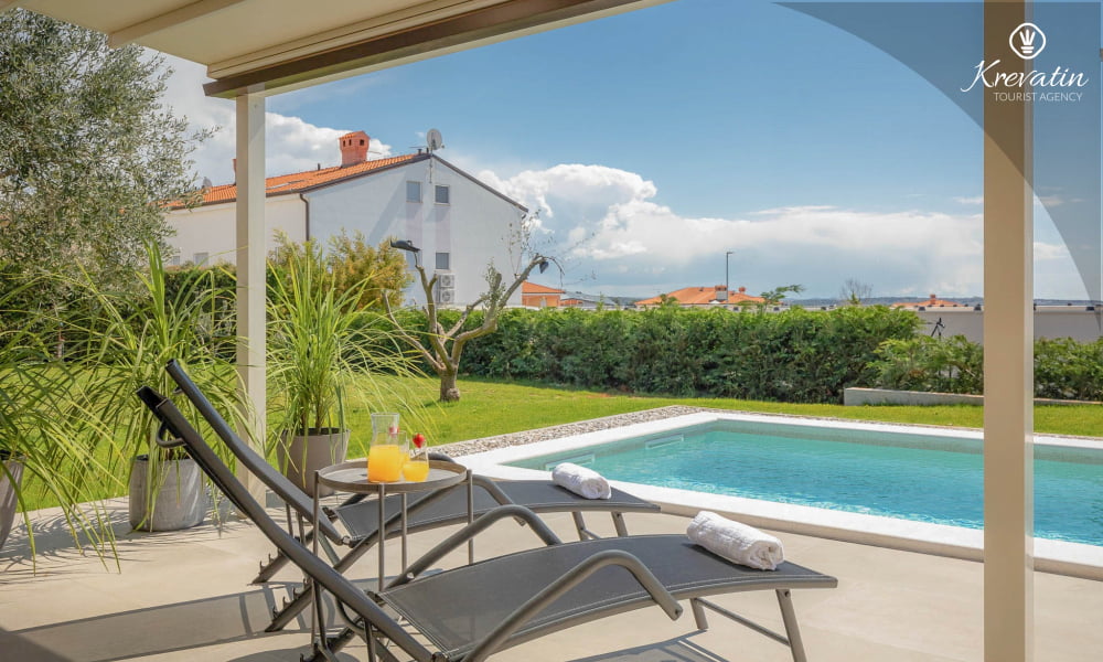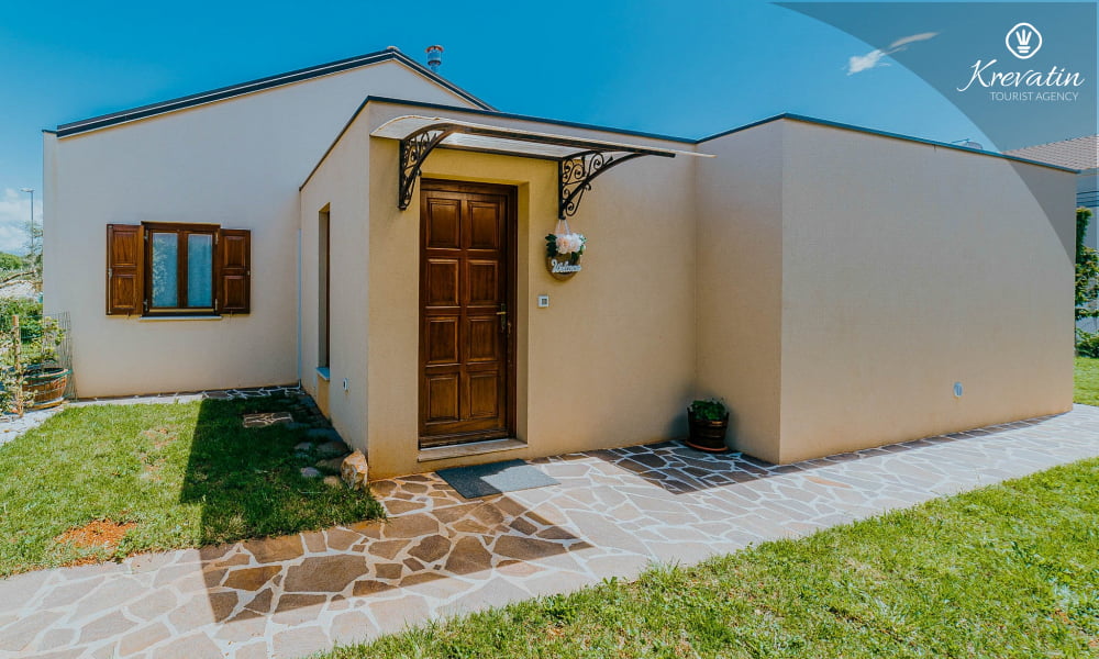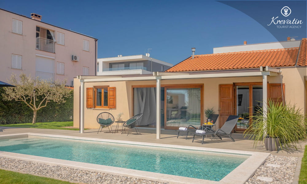 This holiday house for 4 persons is situated on the ground floor and consists of two bedrooms, a living room with one sofa bed and kitchen. The kitchen is equipped with gas stove, oven, refrigerator and coffee maker. In addition there is a bathroom with shower and toilet. The villa has a spacious garden, barbecue and outdoor furniture. There is also a private swimming pool. SAT-TV, air condition, WLAN, bed linen and towels are included in the price, pets are welcome on charge.