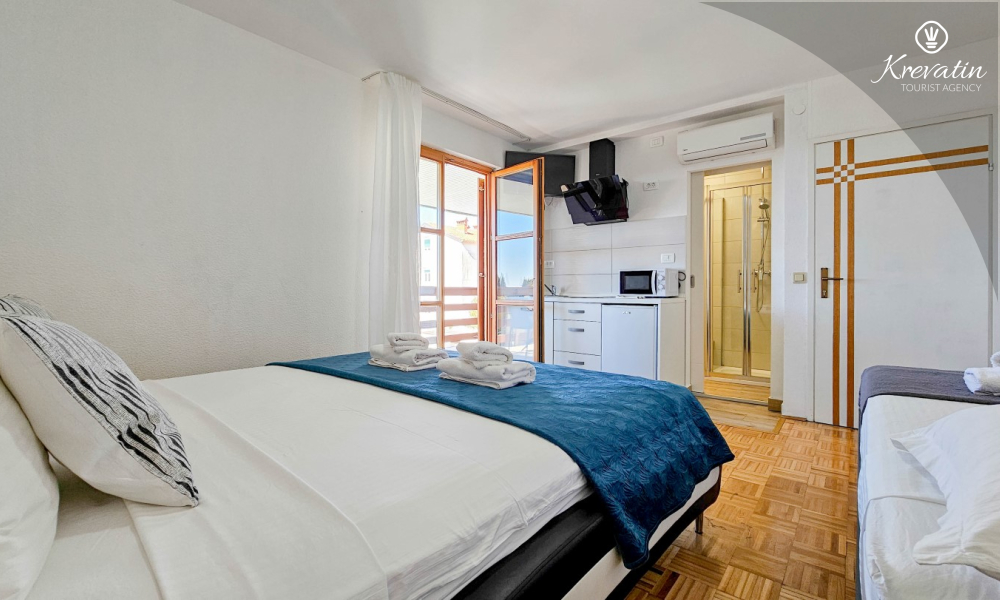 The space is organized in an open plan: a double bed, an extra bed for a third person and a small kitchen with basic equipment for preparing simple meals. A bathroom with a shower and a toilet is located within the unit. There is also a balcony, ideal for morning coffee or evening gatherings.
