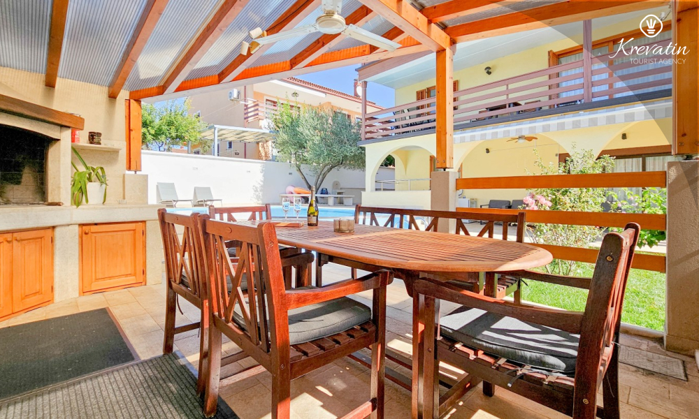 Within the house, guests have access to a shared swimming pool, a terrace with a summer kitchen and barbecue, and a washing machine located in a common area.