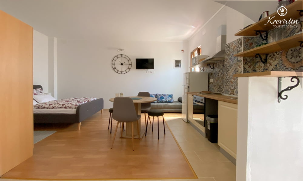 The studio apartment offers a comfortable double bed and a functional kitchen, equipped with the basics for preparing simple meals. There is a bathroom with a shower and a terrace, perfect for outdoor living.