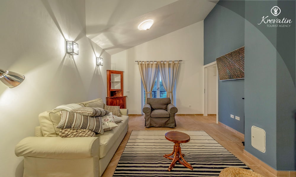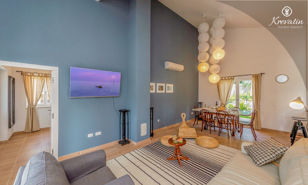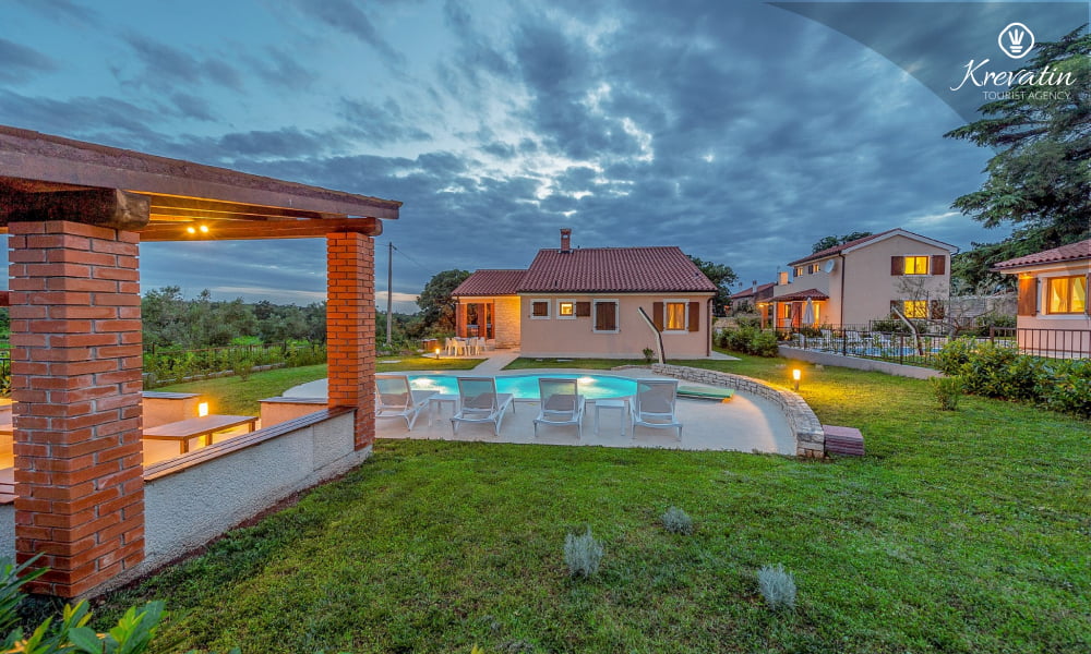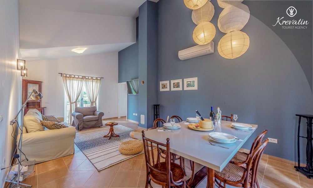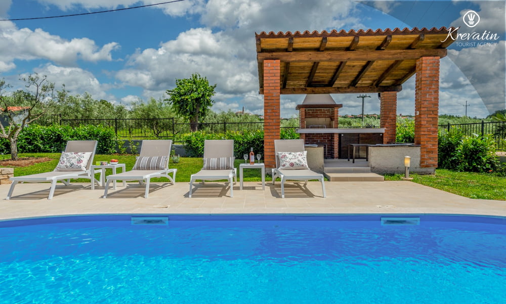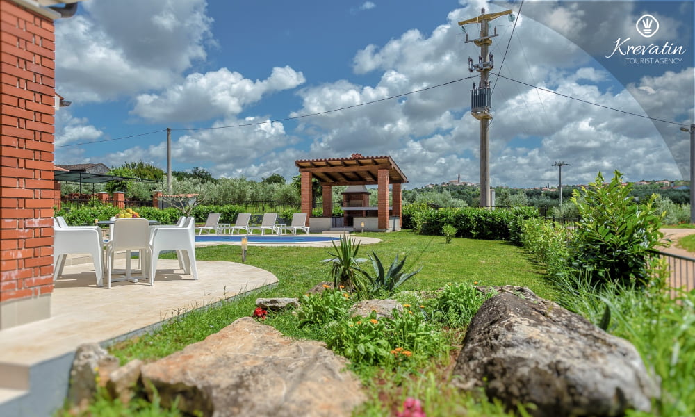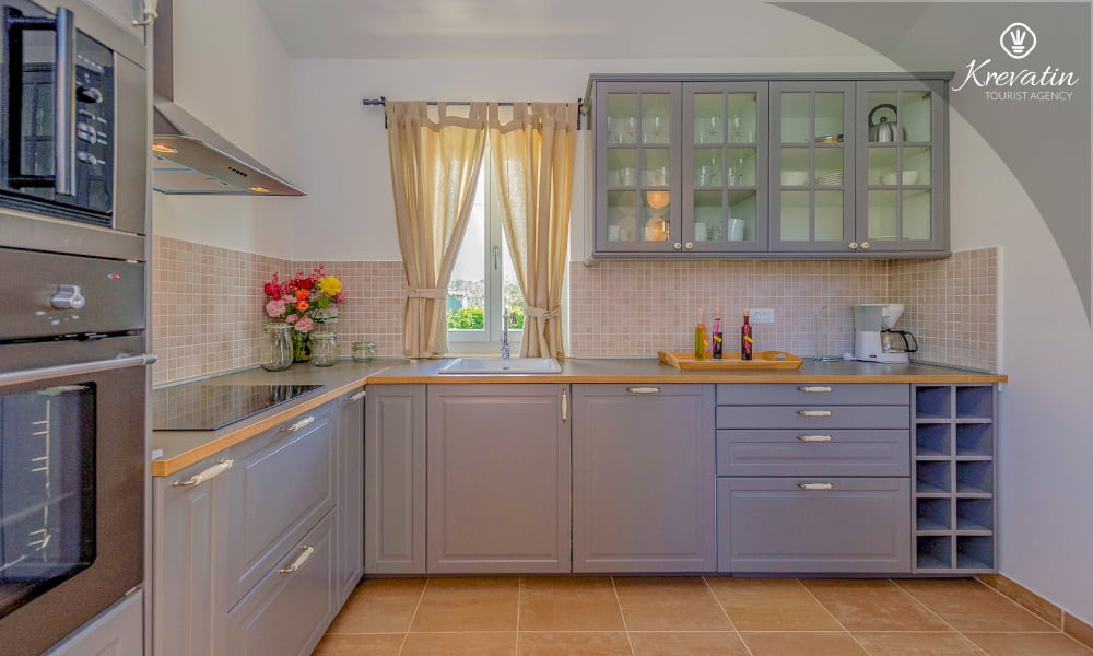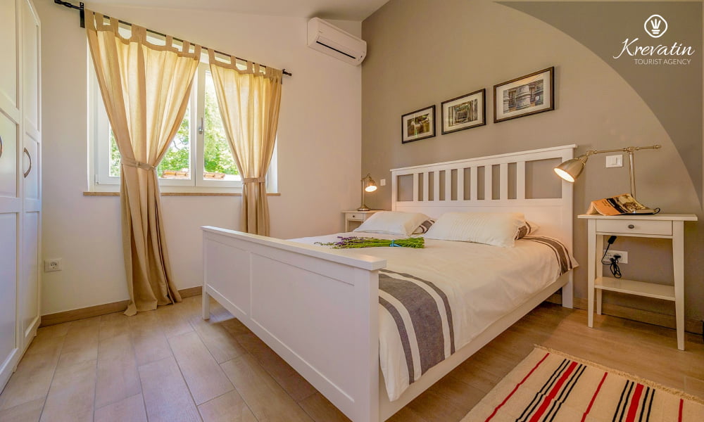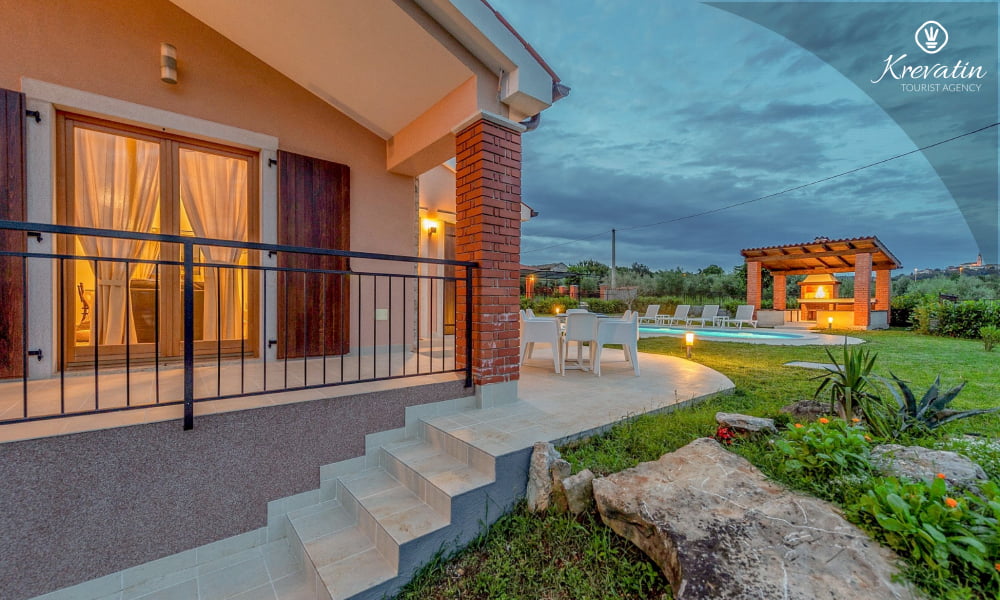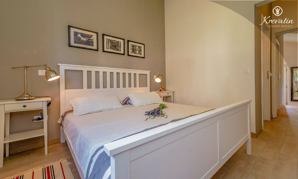 The Villa Violet is situated on the ground floor and has a surface of 120m2. There is a spacious living room with sofa bed connected with kitchen and dining room. The kitchen is modernly equipped and has an electric stove, oven, refrigerator, dish washer, microwave and coffe maker. There are two bedrooms (one with double bed and one single bed and another with double bed), air condition and SAT-TV. There are 2 bathrooms. The villa has a spacious terrace with barbecue, a lovely garden and private swimming pool. Private parking, SAT-TV, air condition, washing machine, dish washer, internet and pool are included in the price. Pets are welcome on charge.
