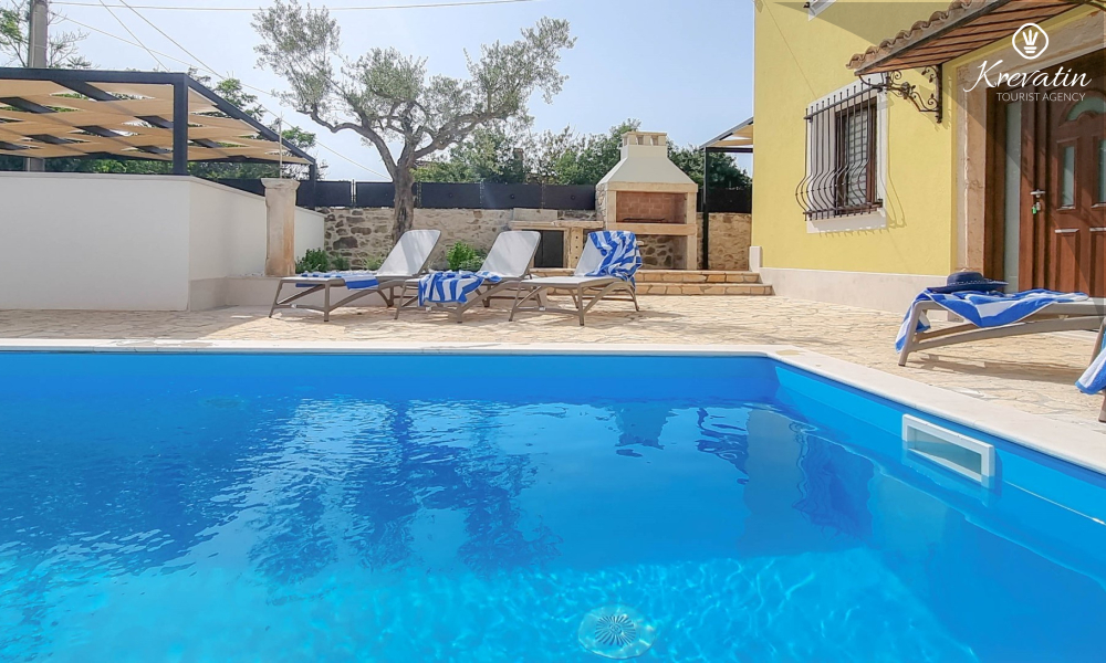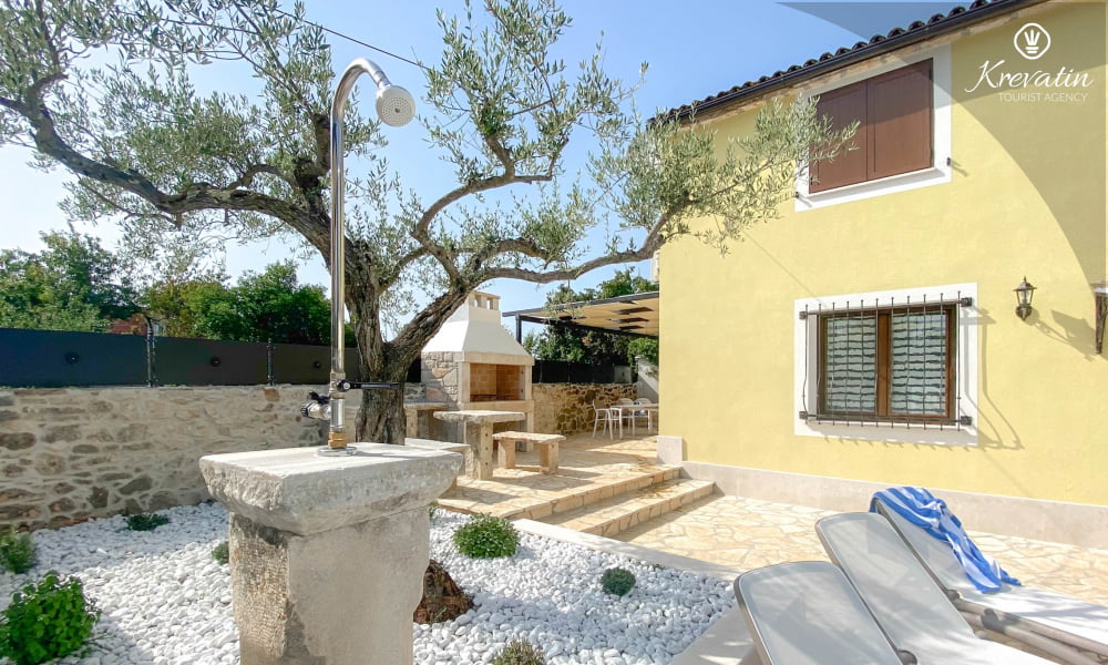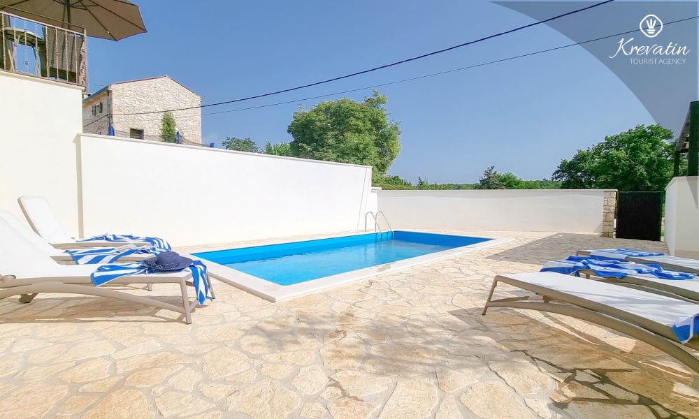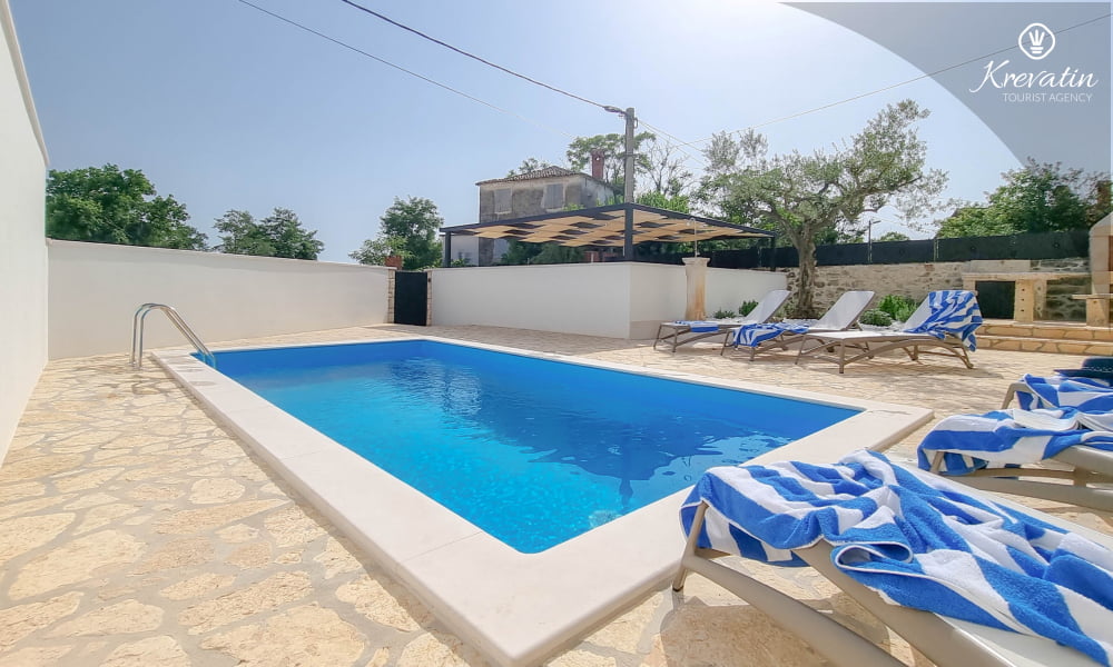 This charming Istrian house for 6 people offers a comfortable living room, kitchen with dining area, three bedrooms and two bathrooms, ideal for a family vacation or a get-together with friends. In the garden there is a swimming pool with sun loungers and a shower, and a covered terrace with a barbecue - ideal for socializing.