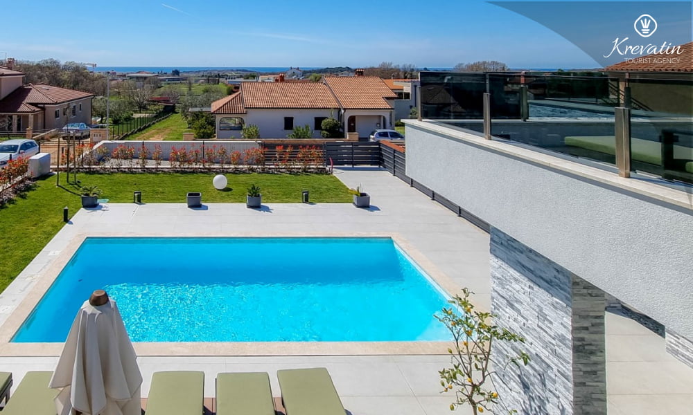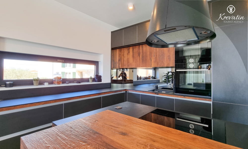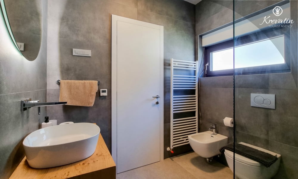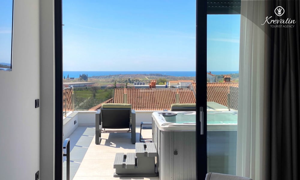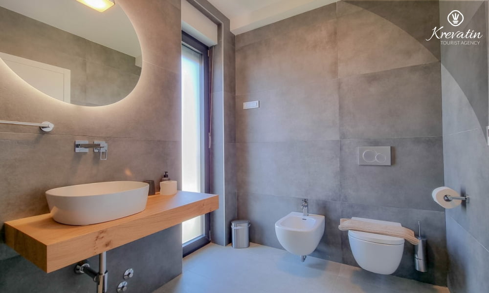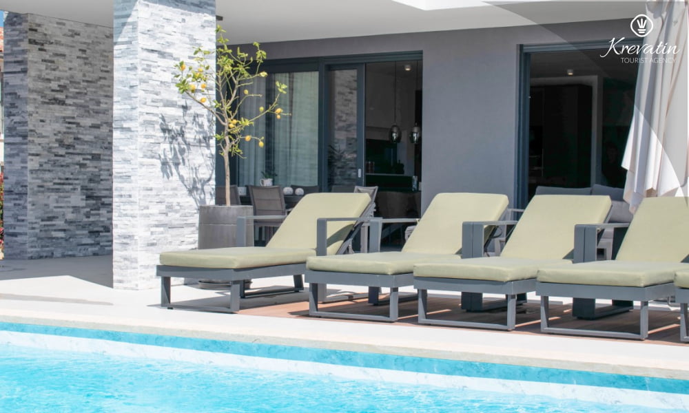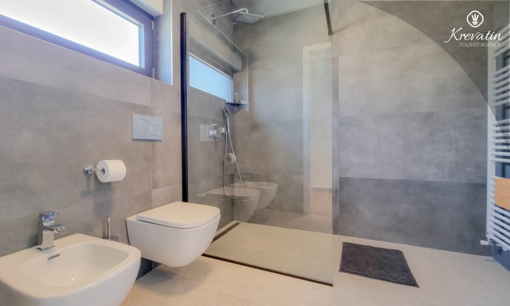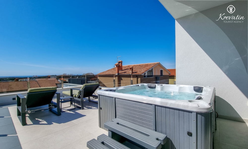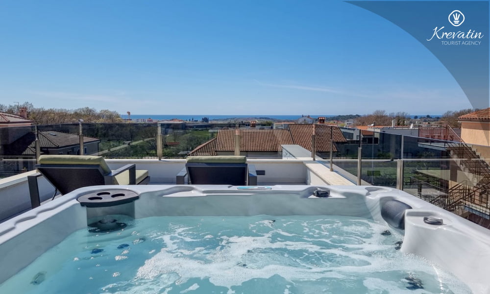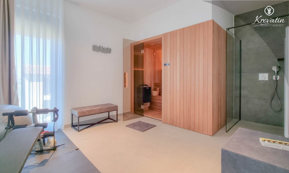 Casa Riposo for up to 8 people is situated on two floors with a fully walled garden and a large private parking lot. On the ground floor there is an open living room with dining area and kitchen, toilet and a large bedroom with its own bathroom. The kitchen is modernly equipped and has an electric stove, oven, refrigerator, dish washer, microwave, coffe maker and ice maker. On the first floor there are three bedrooms each with its own bathroom, air conditioning, TV and a shared balcony with jacuzzi and furniture with beautiful sea view. In the garden you can enjoy a large private pool that offers the possibility of heating at an additional fee of 20.00 EUR per day. Guests have at their disposal two bicycles and a sauna for complete relaxation during their stay. Pets are welcome on charge.