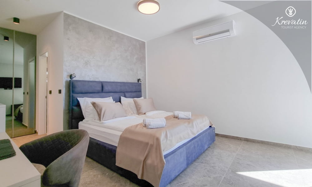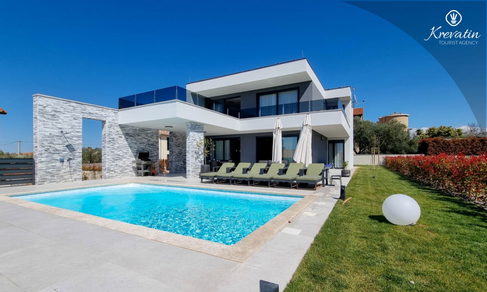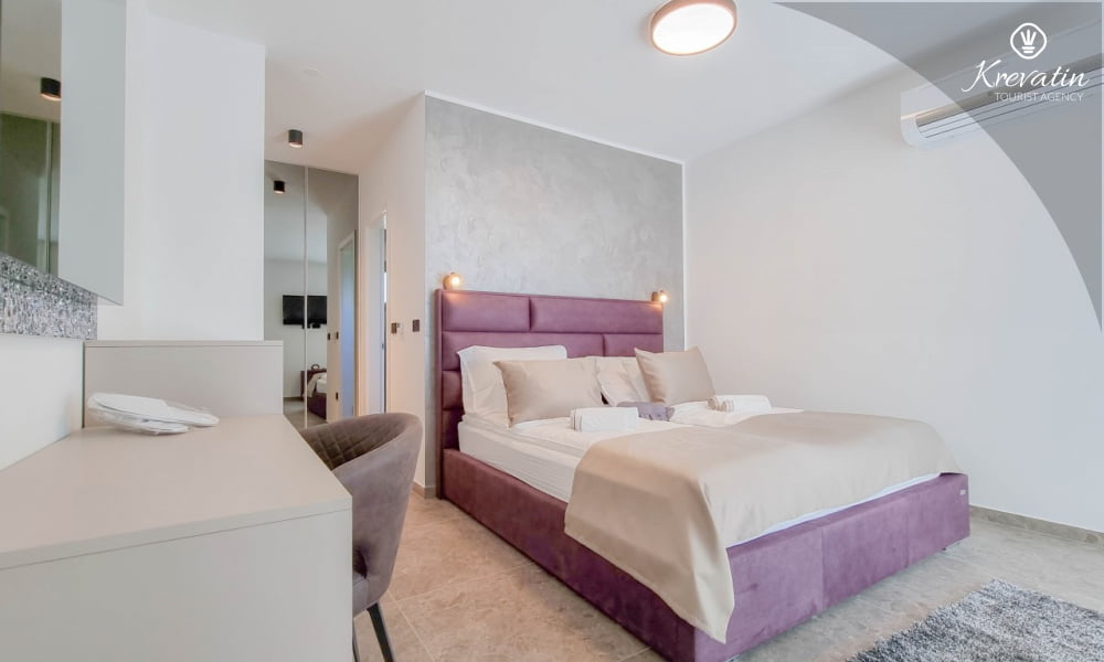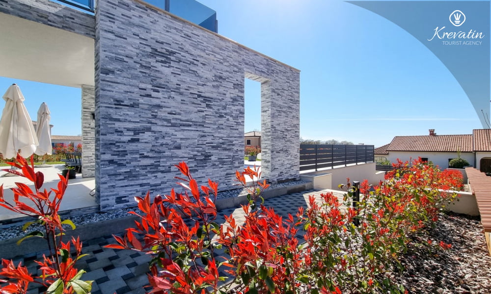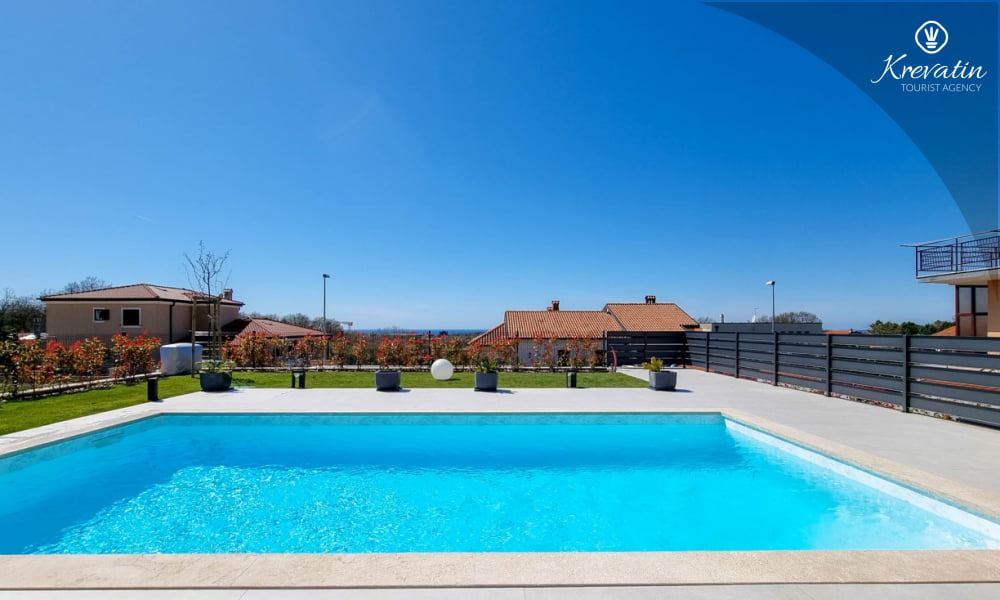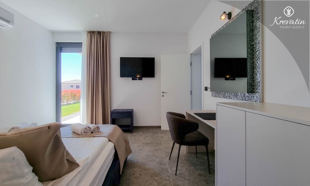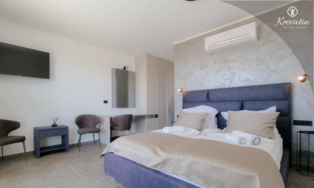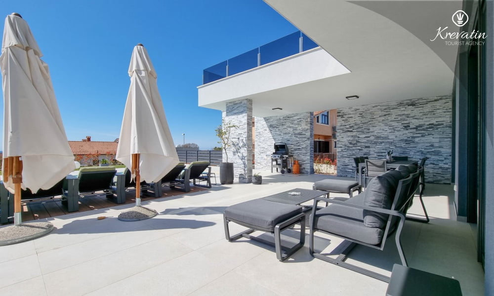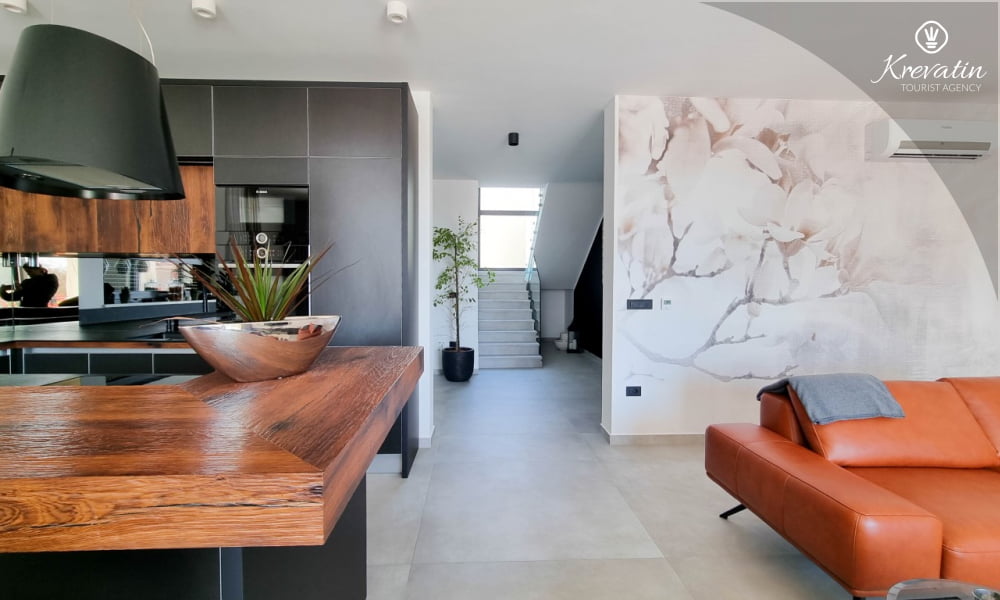 Casa Riposo for up to 8 people is situated on two floors with a fully walled garden and a large private parking lot. On the ground floor there is an open living room with dining area and kitchen, toilet and a large bedroom with its own bathroom. The kitchen is modernly equipped and has an electric stove, oven, refrigerator, dish washer, microwave, coffe maker and ice maker. On the first floor there are three bedrooms each with its own bathroom, air conditioning, TV and a shared balcony with jacuzzi and furniture with beautiful sea view. In the garden you can enjoy a large private pool that offers the possibility of heating at an additional fee of 20.00 EUR per day. Guests have at their disposal two bicycles and a sauna for complete relaxation during their stay. Pets are welcome on charge.