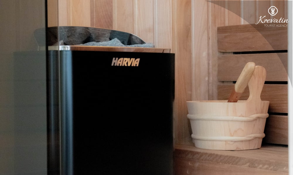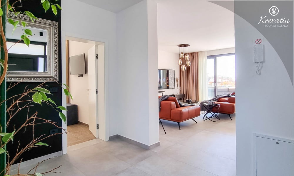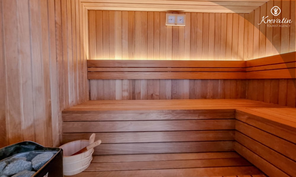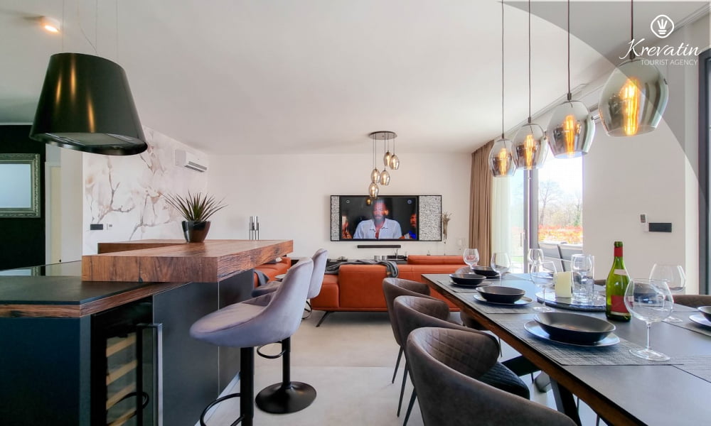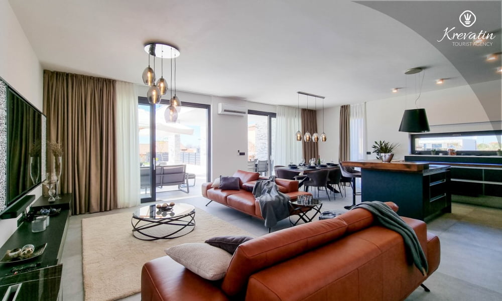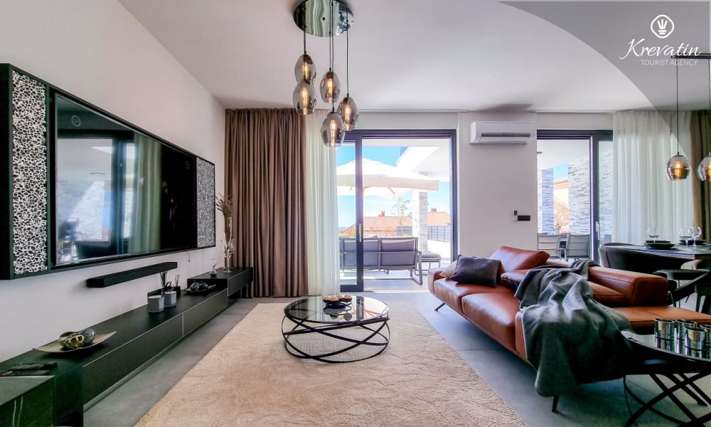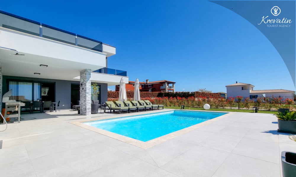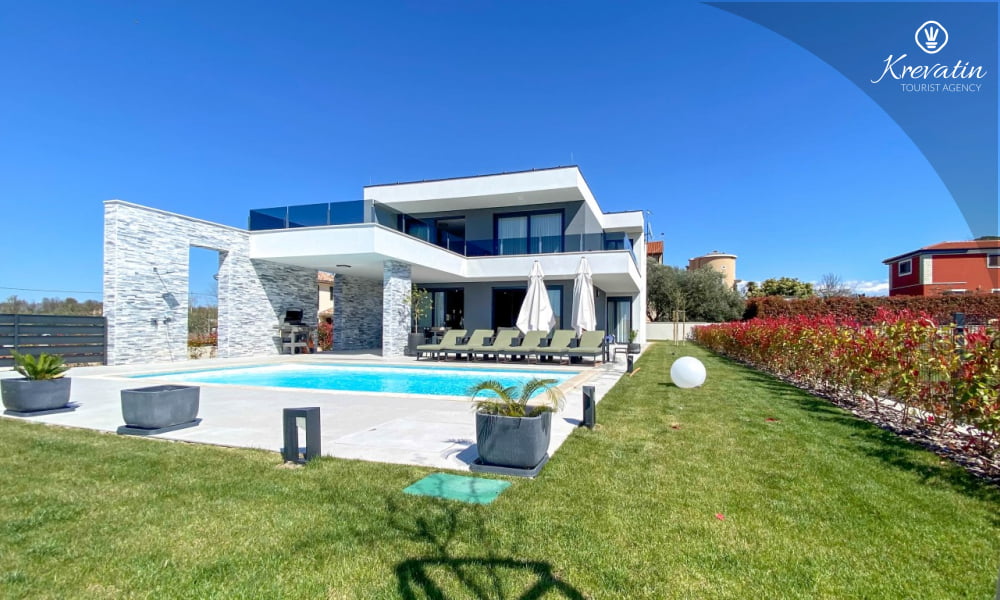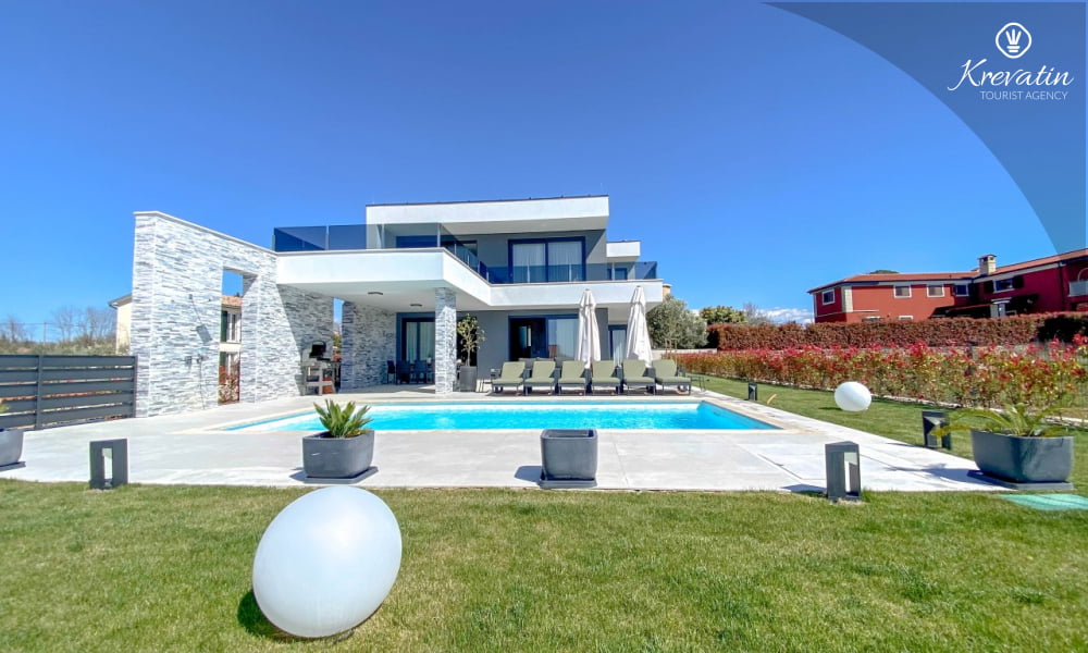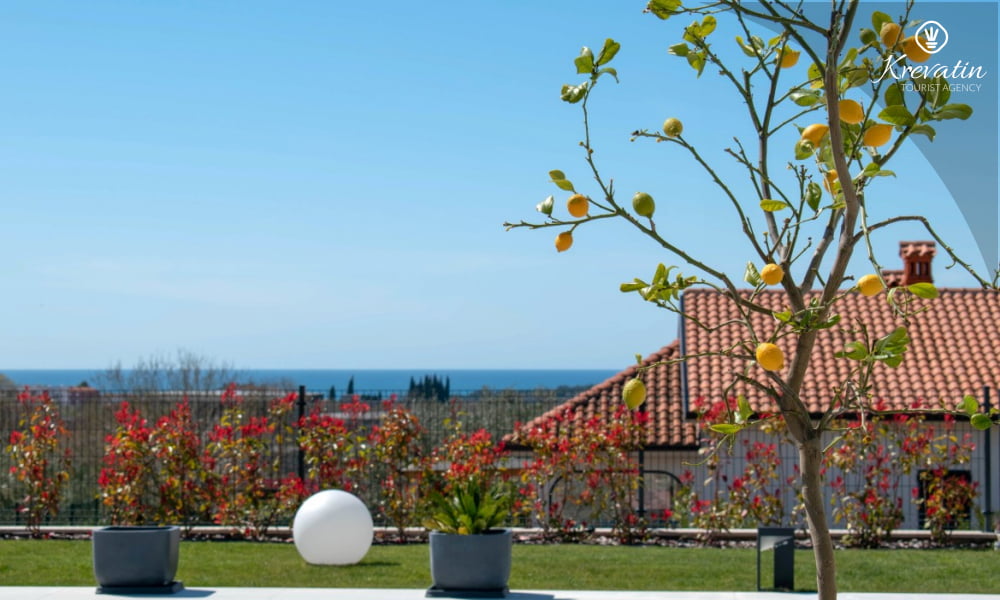 Casa Riposo for up to 8 people is situated on two floors with a fully walled garden and a large private parking lot. On the ground floor there is an open living room with dining area and kitchen, toilet and a large bedroom with its own bathroom. The kitchen is modernly equipped and has an electric stove, oven, refrigerator, dish washer, microwave, coffe maker and ice maker. On the first floor there are three bedrooms each with its own bathroom, air conditioning, TV and a shared balcony with jacuzzi and furniture with beautiful sea view. In the garden you can enjoy a large private pool that offers the possibility of heating at an additional fee of 20.00 EUR per day. Guests have at their disposal two bicycles and a sauna for complete relaxation during their stay. Pets are welcome on charge.