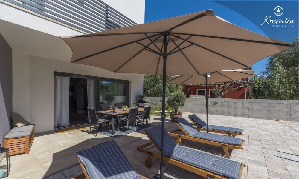 The casa Gabriela is situated on two floors and has a surface of 140m2. On the ground floor there is a spacious living room connected with kitchen. The kitchen is modernly equipped and has an electric stove, oven, refrigerator, dish washer, microwave and coffe maker. Three bedrooms are located on the first floor, each of them equipped with a double bed and a SAT-TV. There are 3 bathrooms - one bathroom has access only from one bedroom, second has shower and toilet and third has just toilet (situated on the ground floor). The villa has a spacious terrace with barbecue, a lovely garden and private swimming pool. Private parking, SAT-TV, air condition, washing machine, dish washer, internet and pool are included in the price. Pets are welcome on charge.